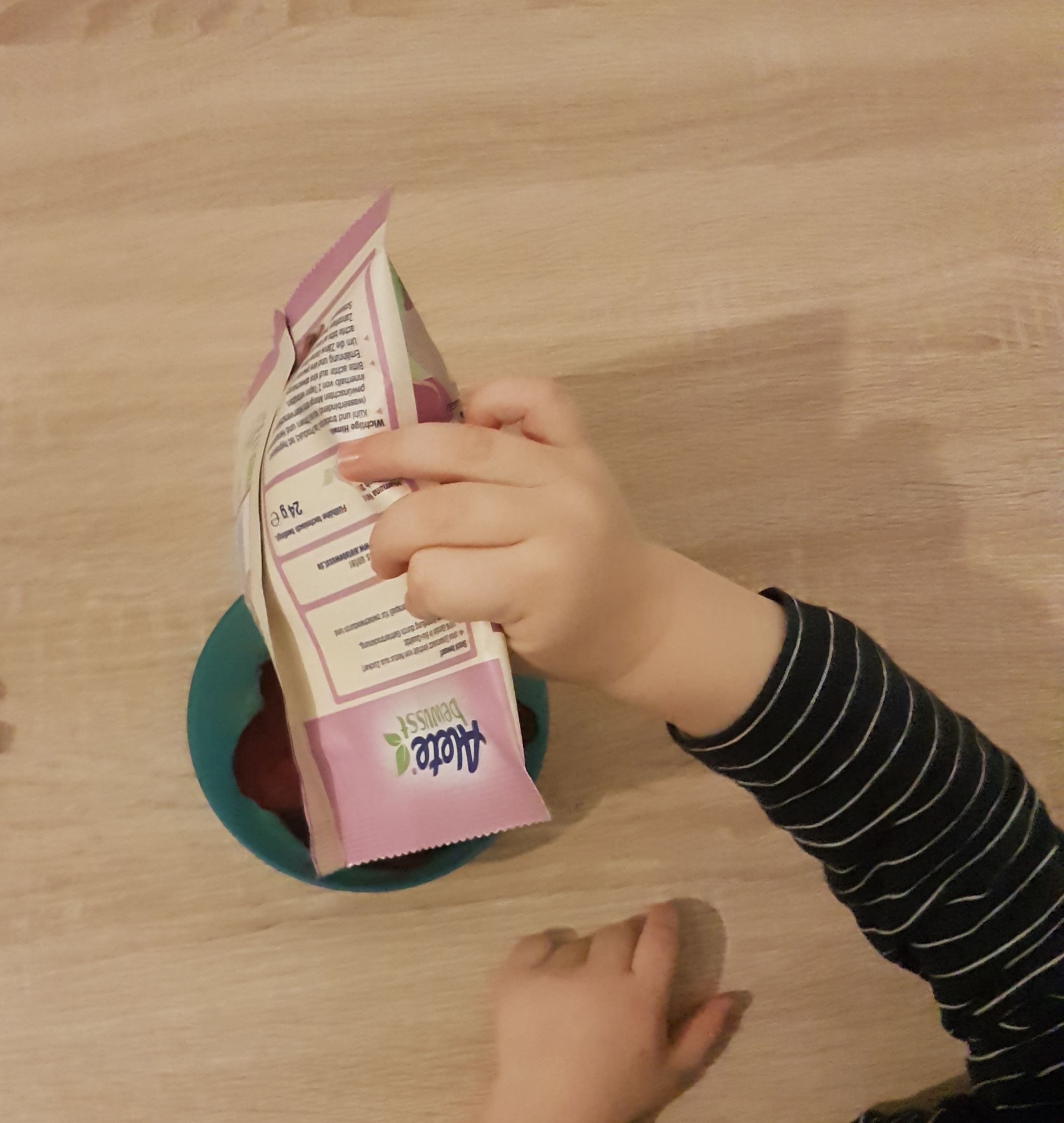 Da sich die Verpackung auch nicht schließen lässt, muss direkt alles umgefüllt werden.