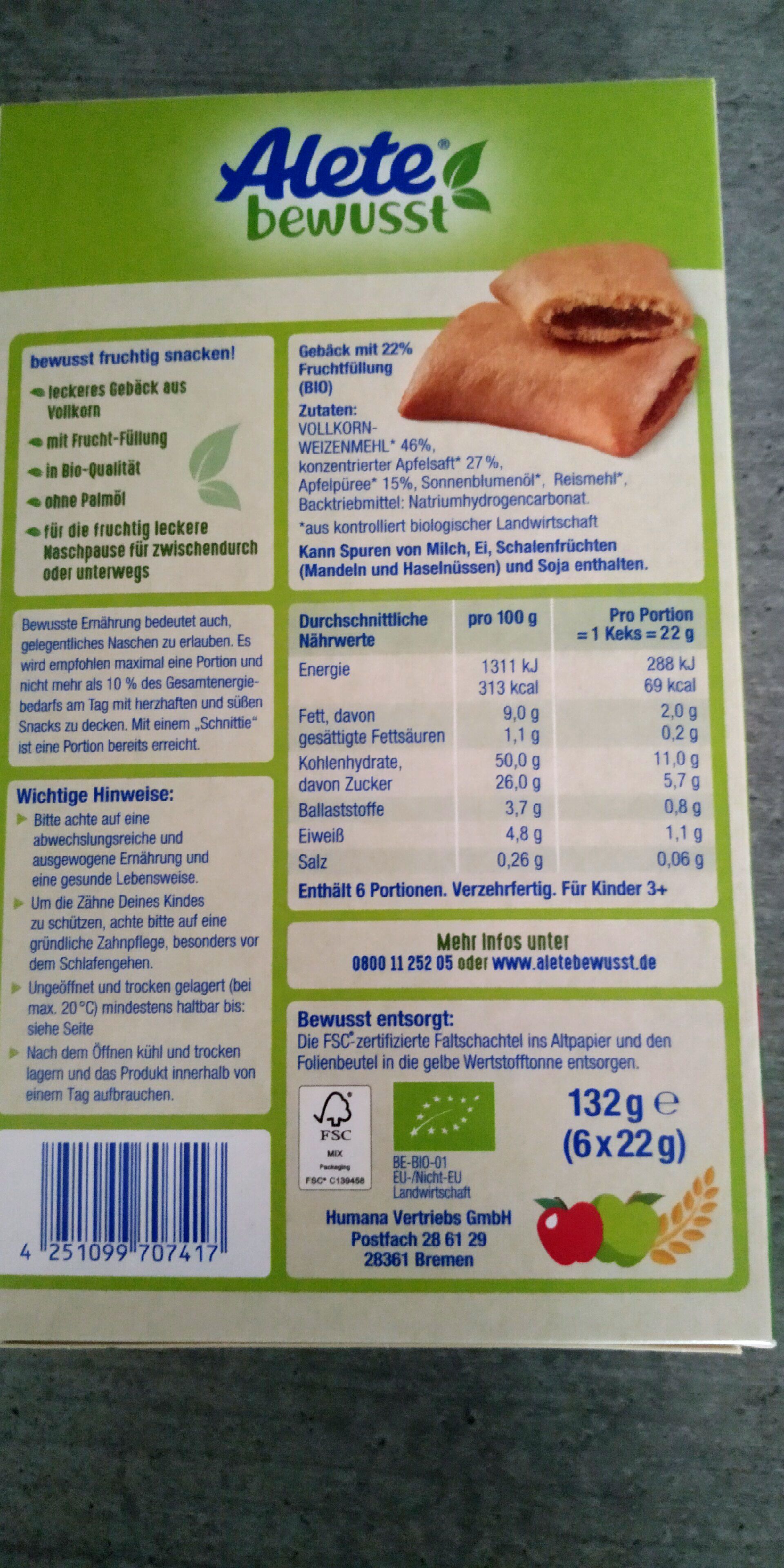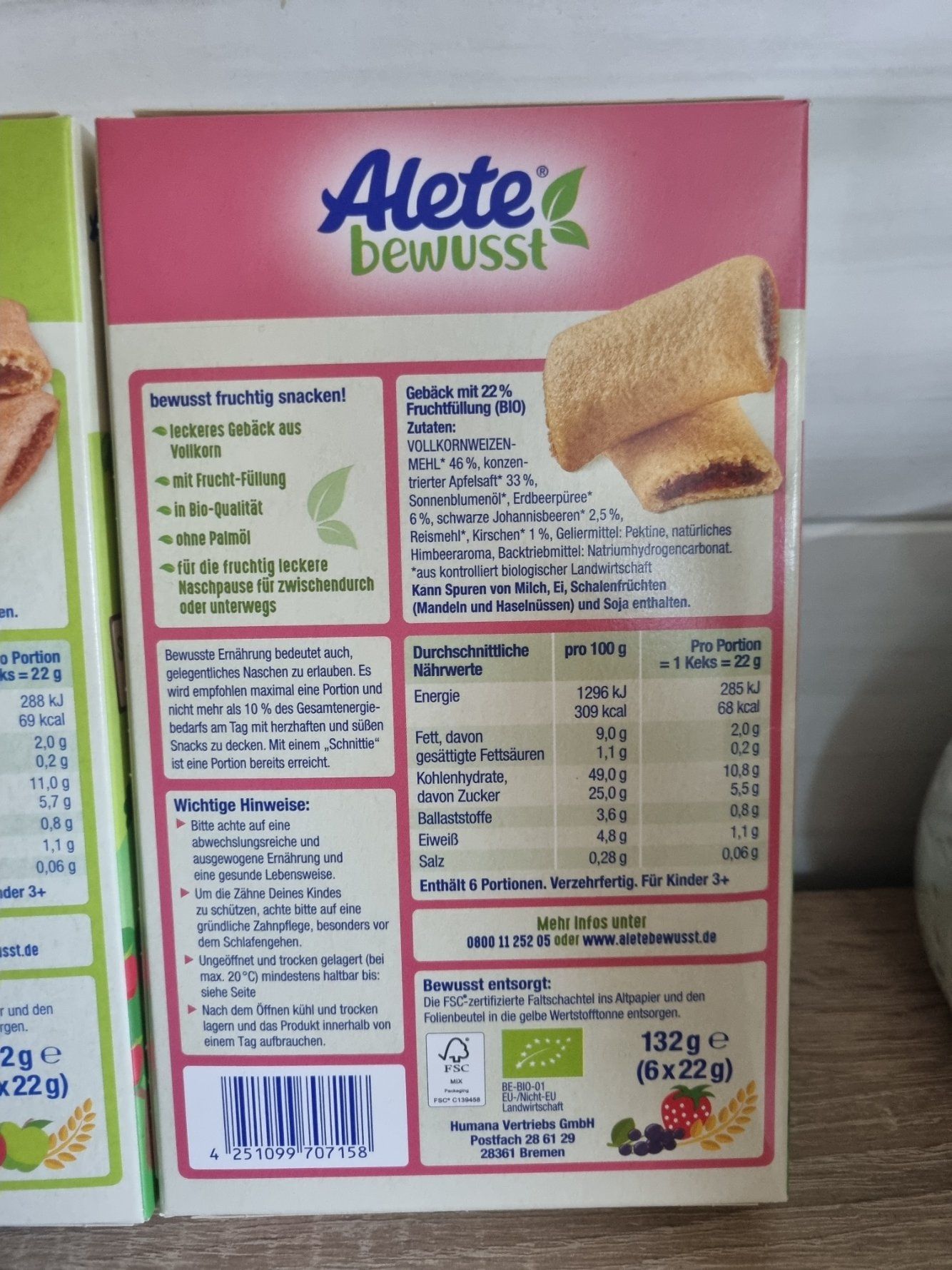 Bestehend aus 100%igen Bioprodukten wie Vollkornmehl & Obst. Ohne Palmöl.