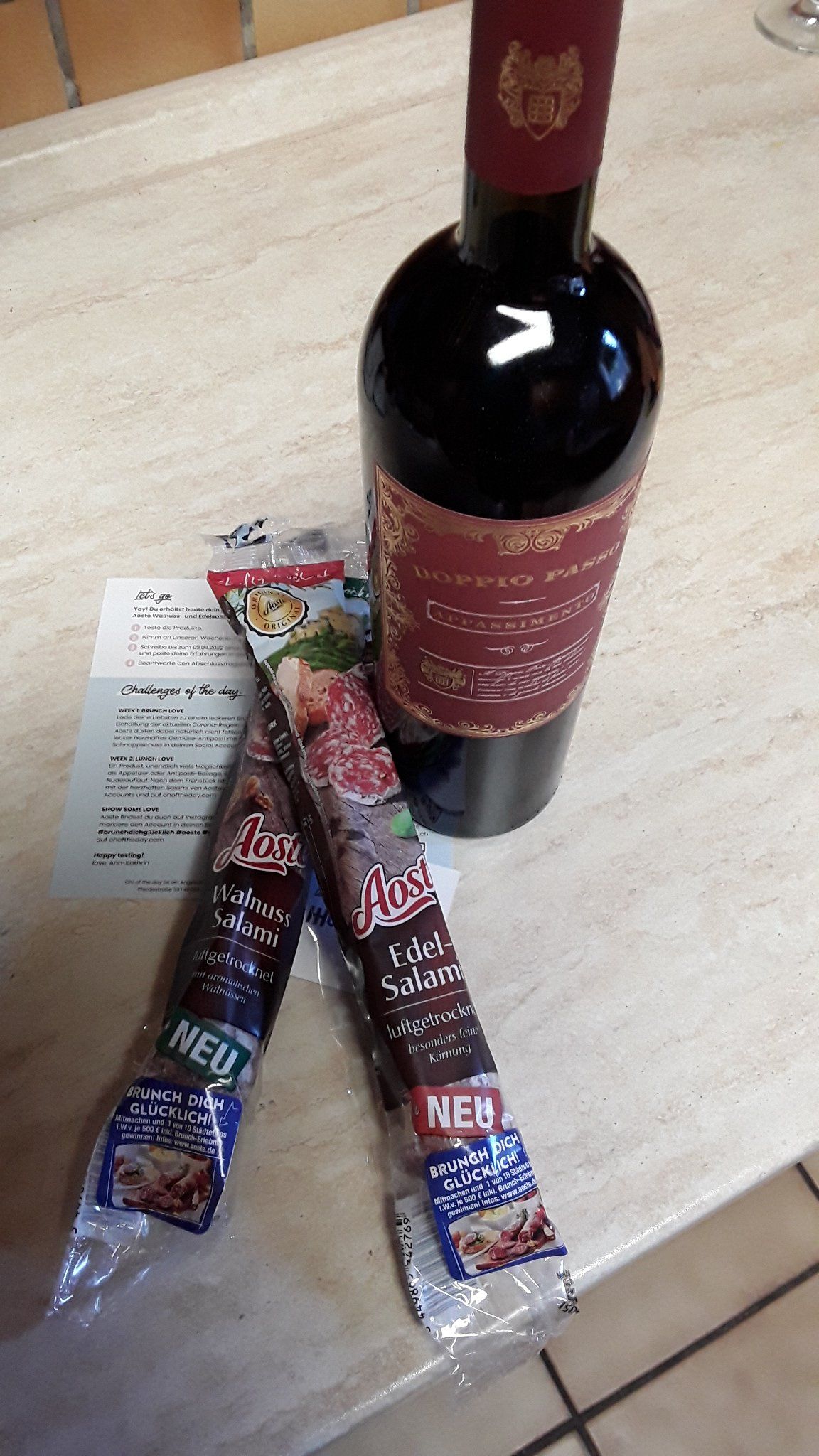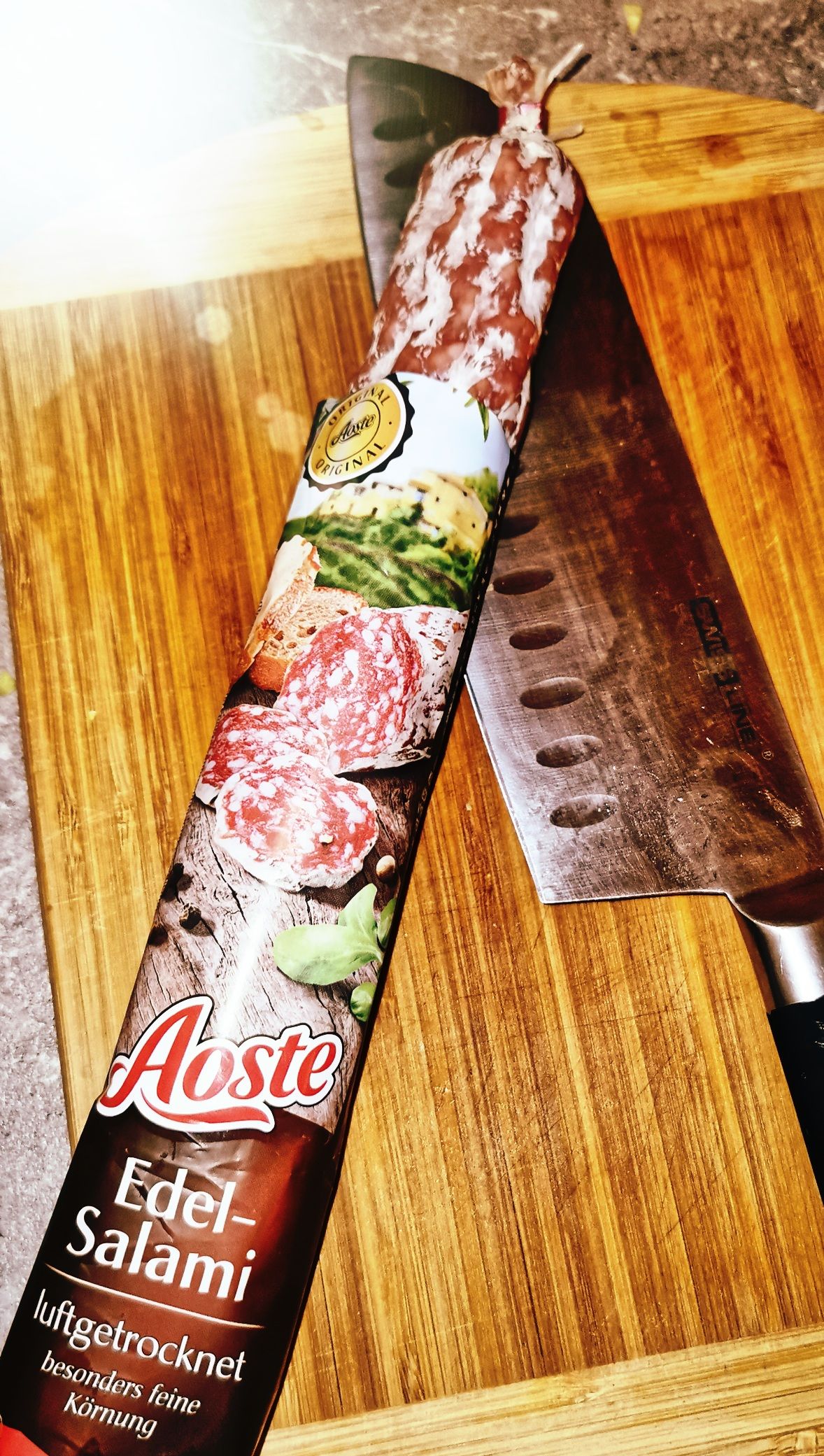 Bei uns gab es die Aoste Dauerwurst Edelsalami in Scheiben aufgeschnitten zusammen mit Parmesan, Oliven und Crackern zu einem guten Glas Rotwein - und das wirklich eine leckere Sache 😋! Der Geschmack der Edel-Salami ist gut, könnte aber für meinen Geschmack etwas kräftiger sein.