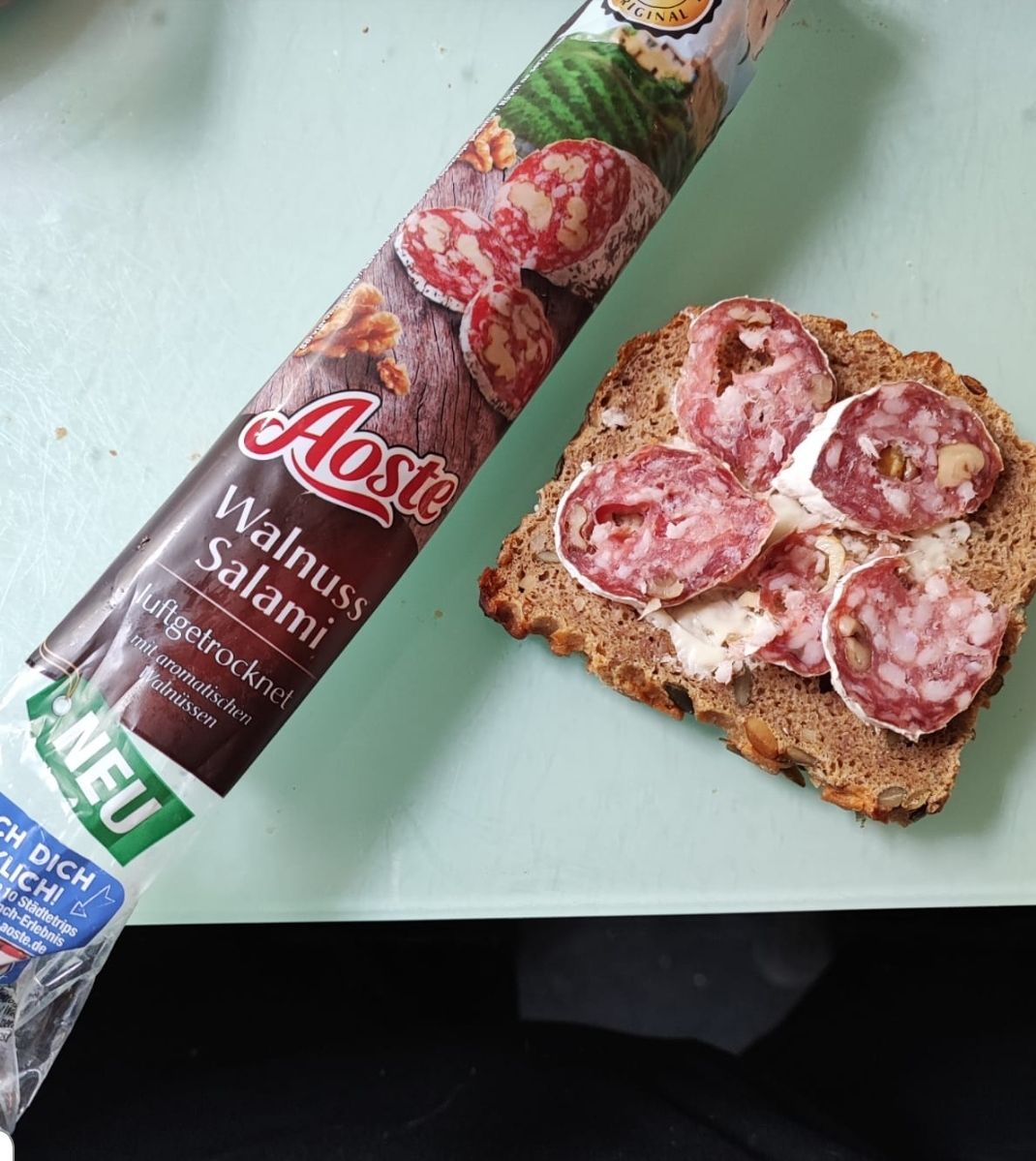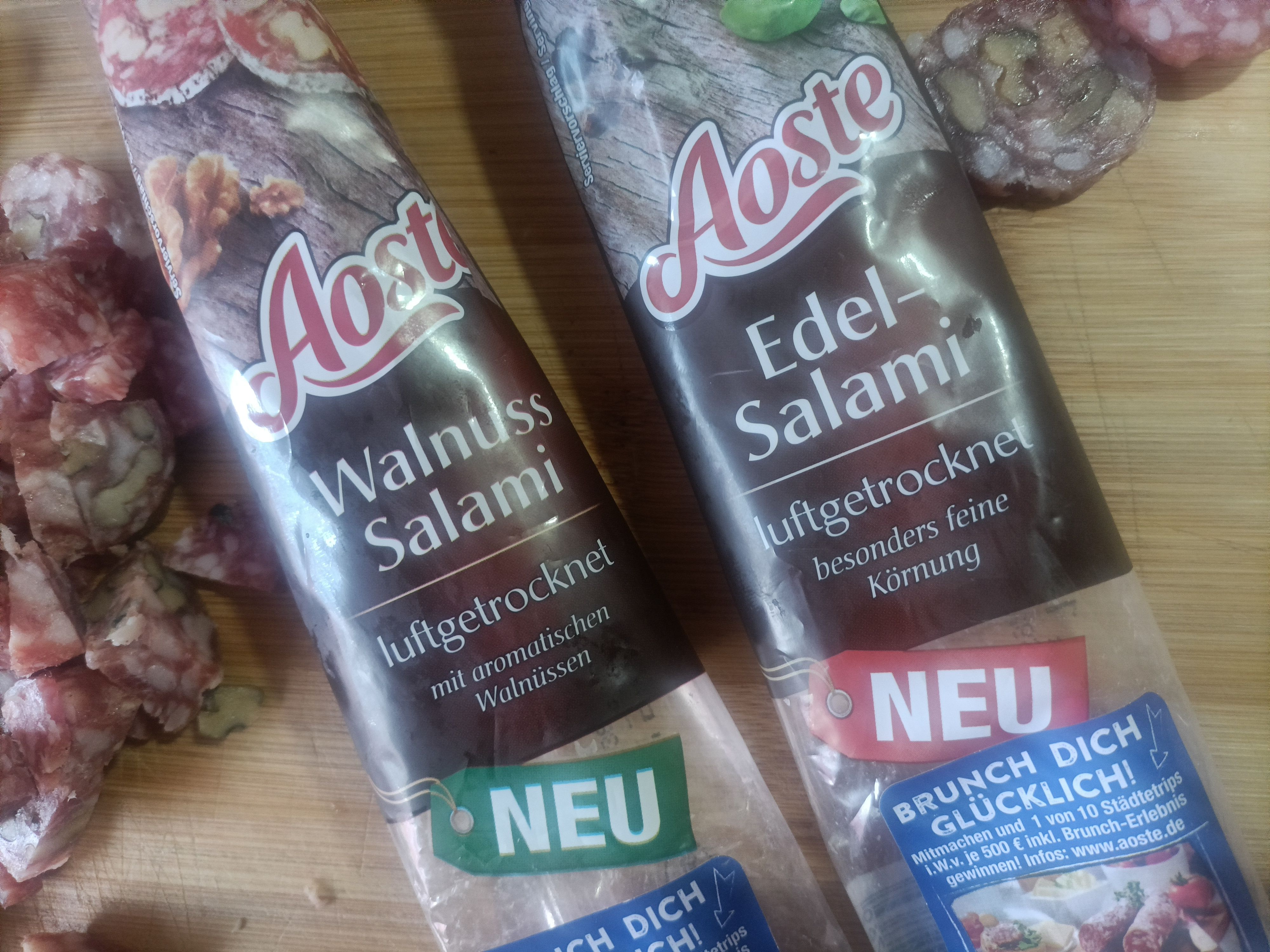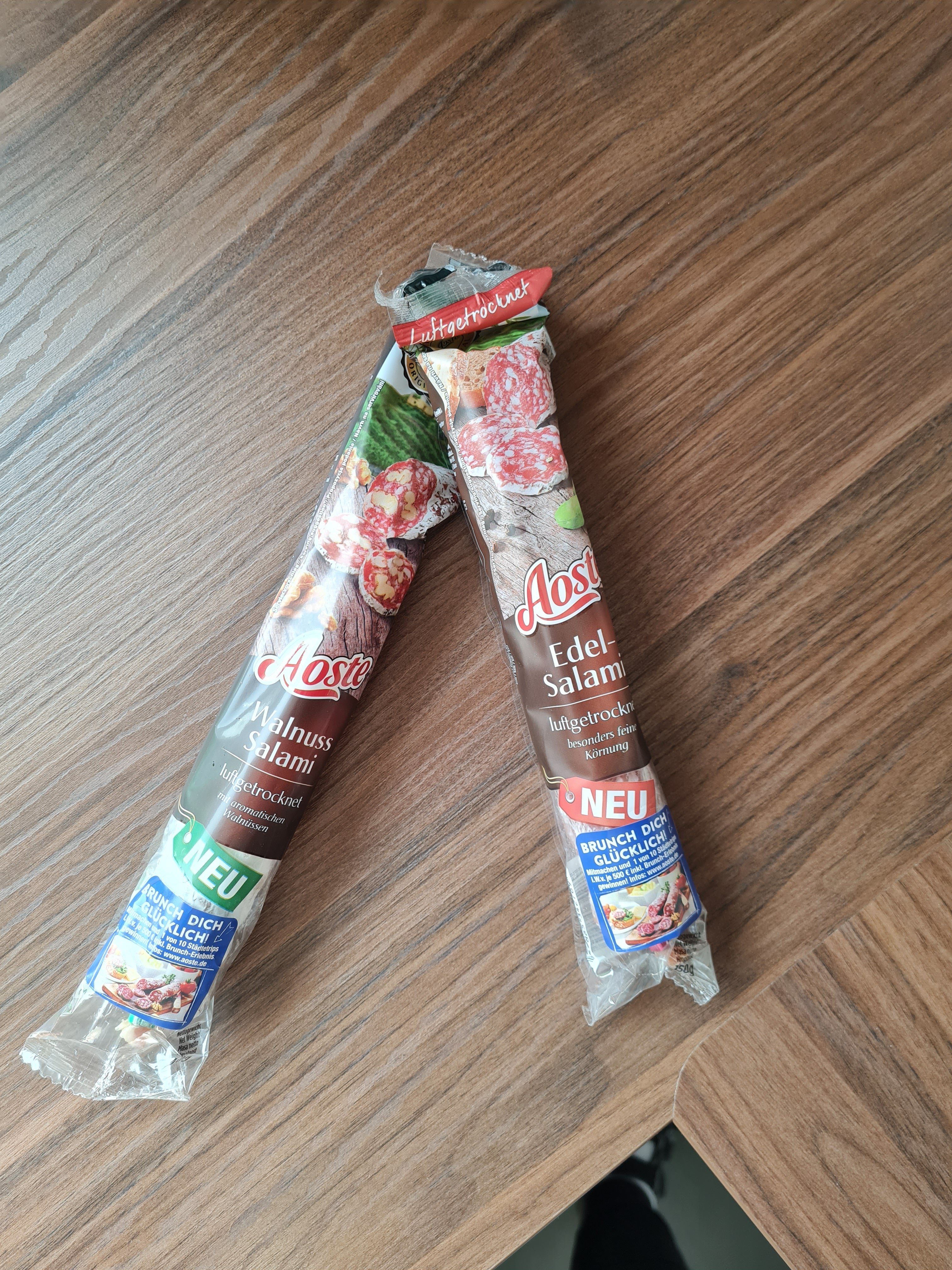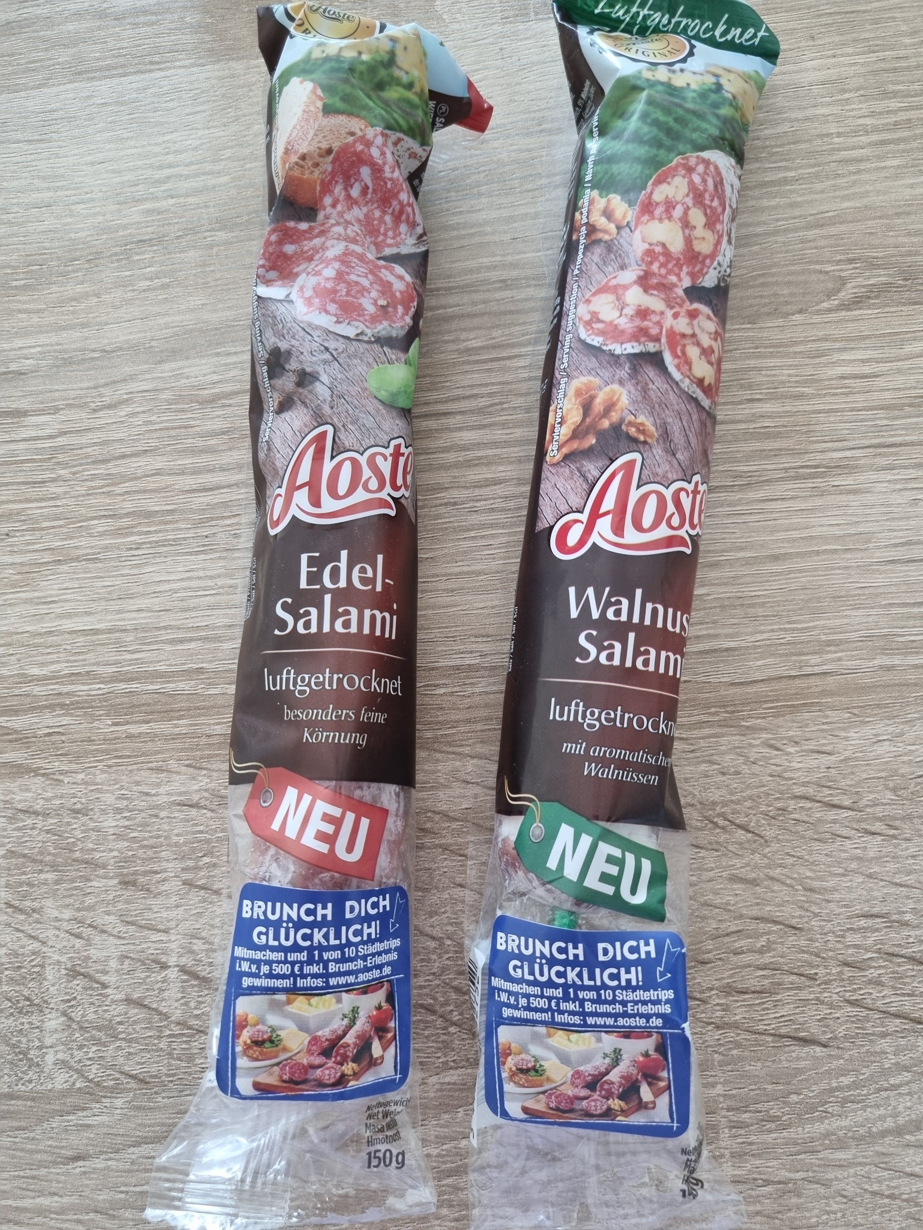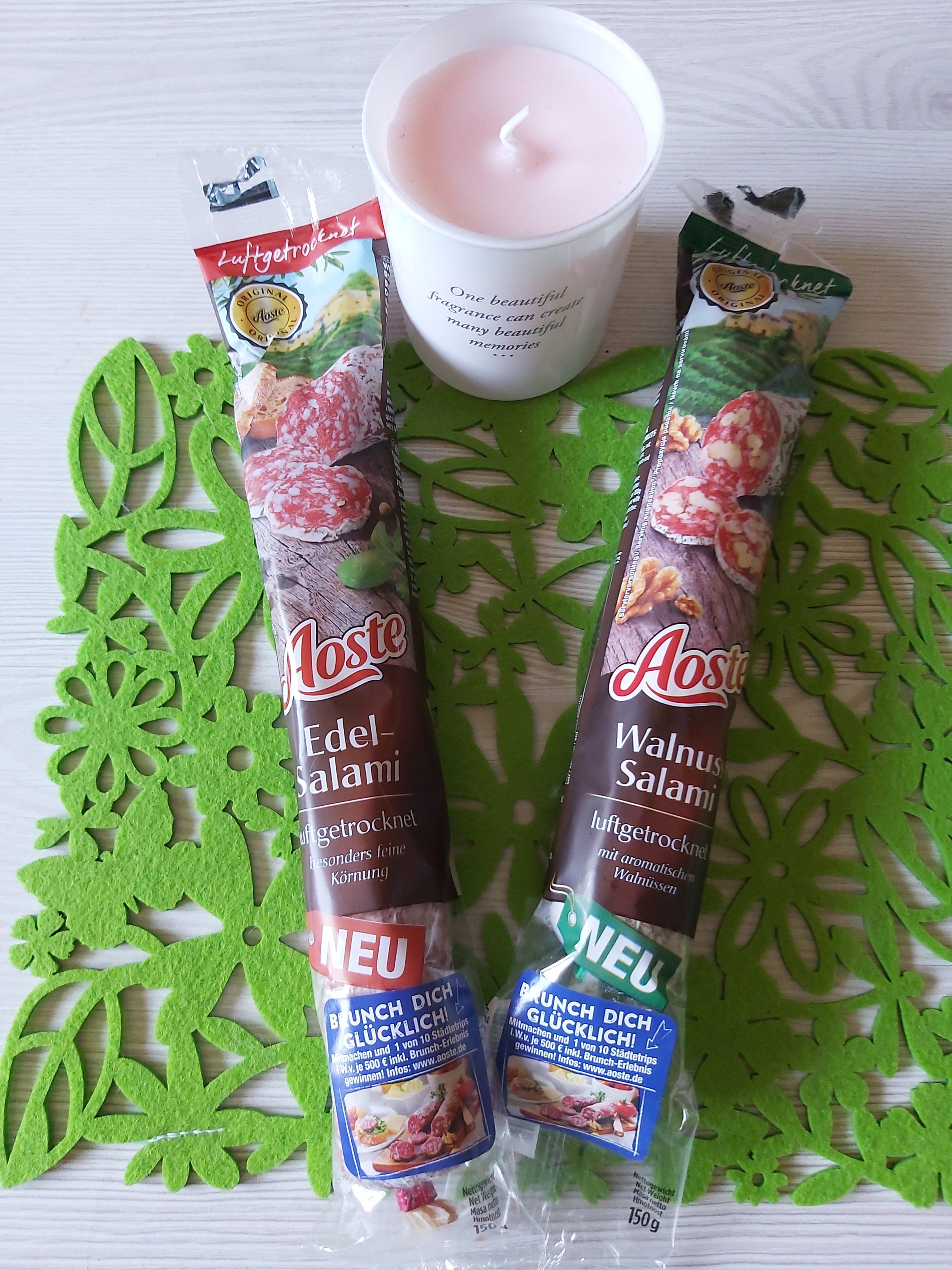 Ich durfte die Wurst von Aoste testen. Einmal die Classic und einmal die Sorte Walnuss. Ich bin ein absoluter Salami-Fan und kenne auch die Marke schon. Jedoch hat mir keine der beiden Sorten besonders geschmeckt. Ich persönlich würde sie nicht mehr kaufen, jedoch ist dies halt immer geschmackssache.