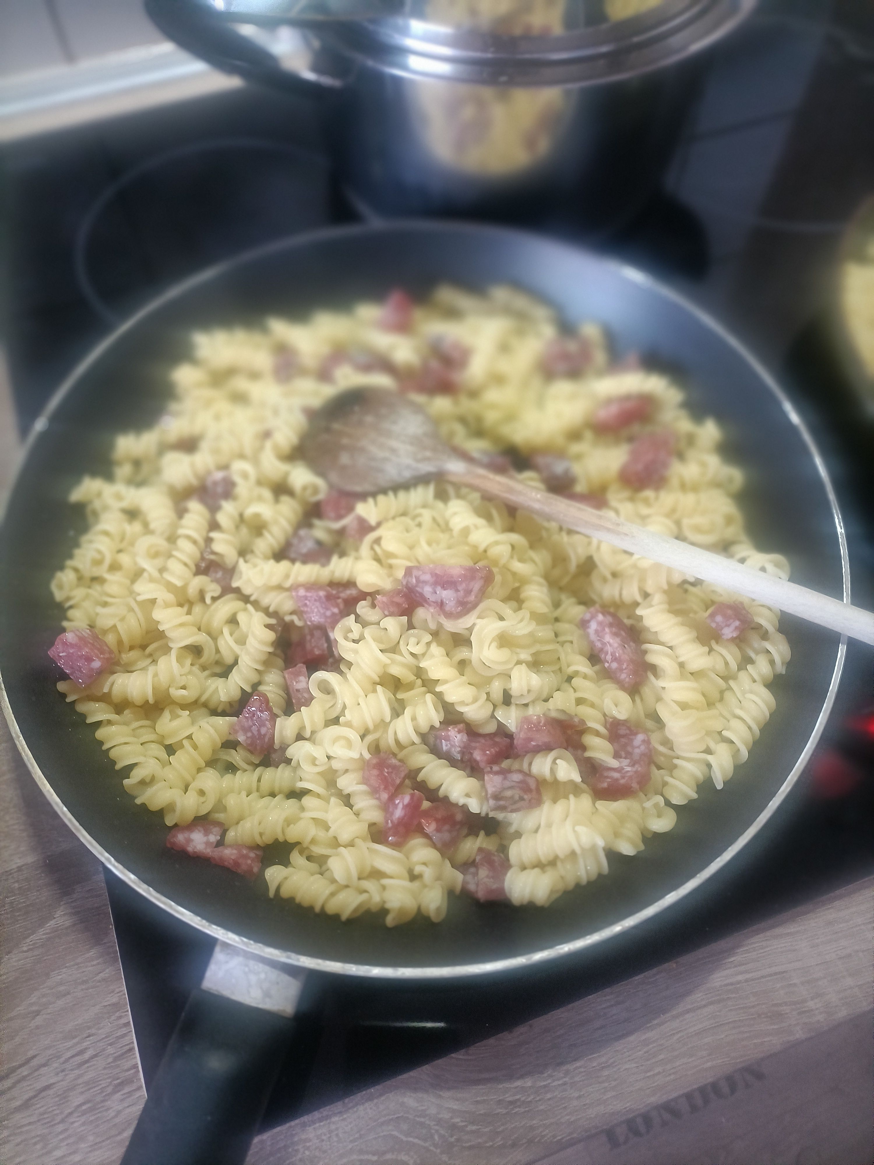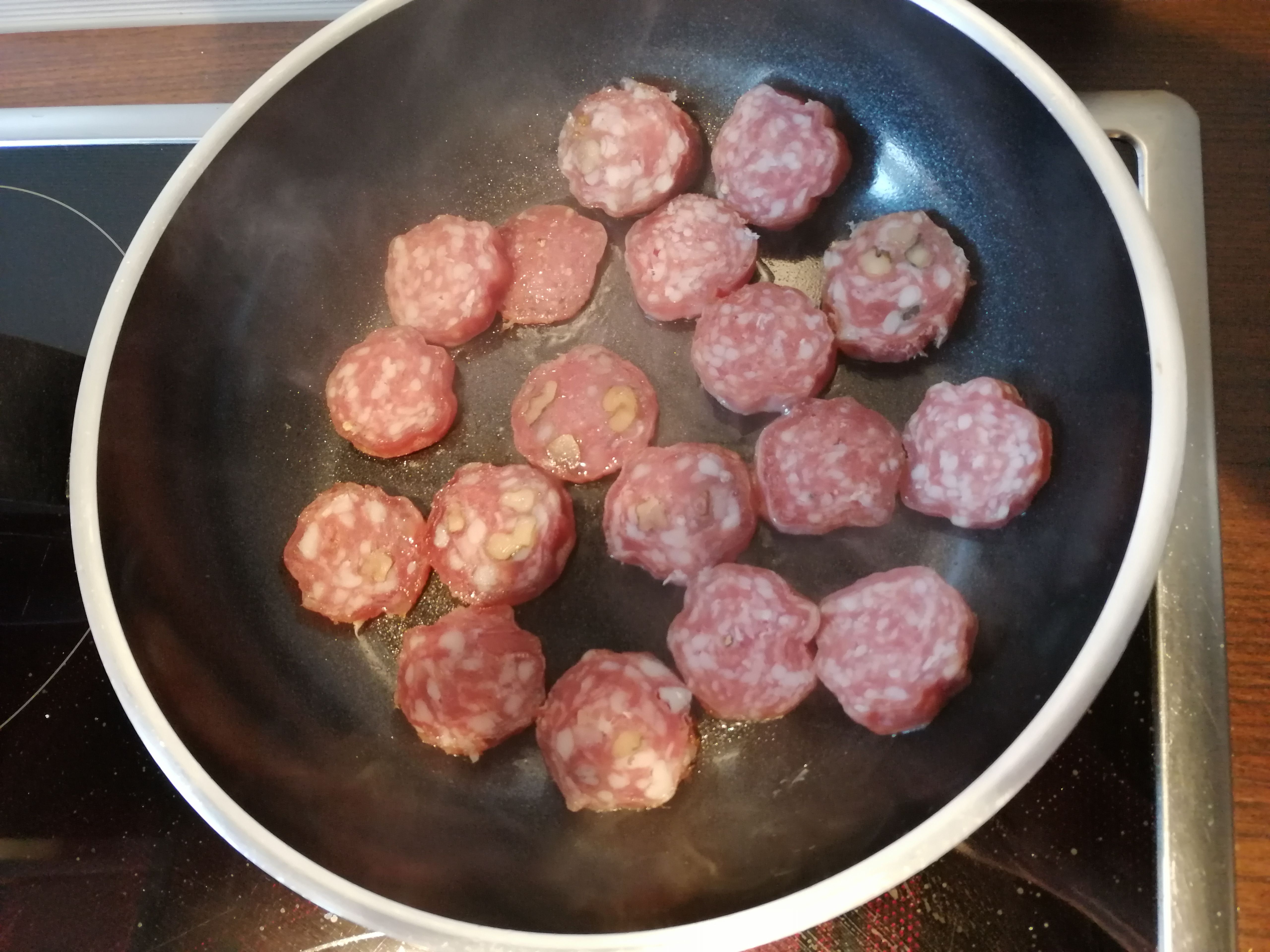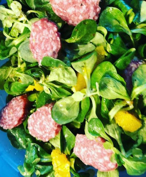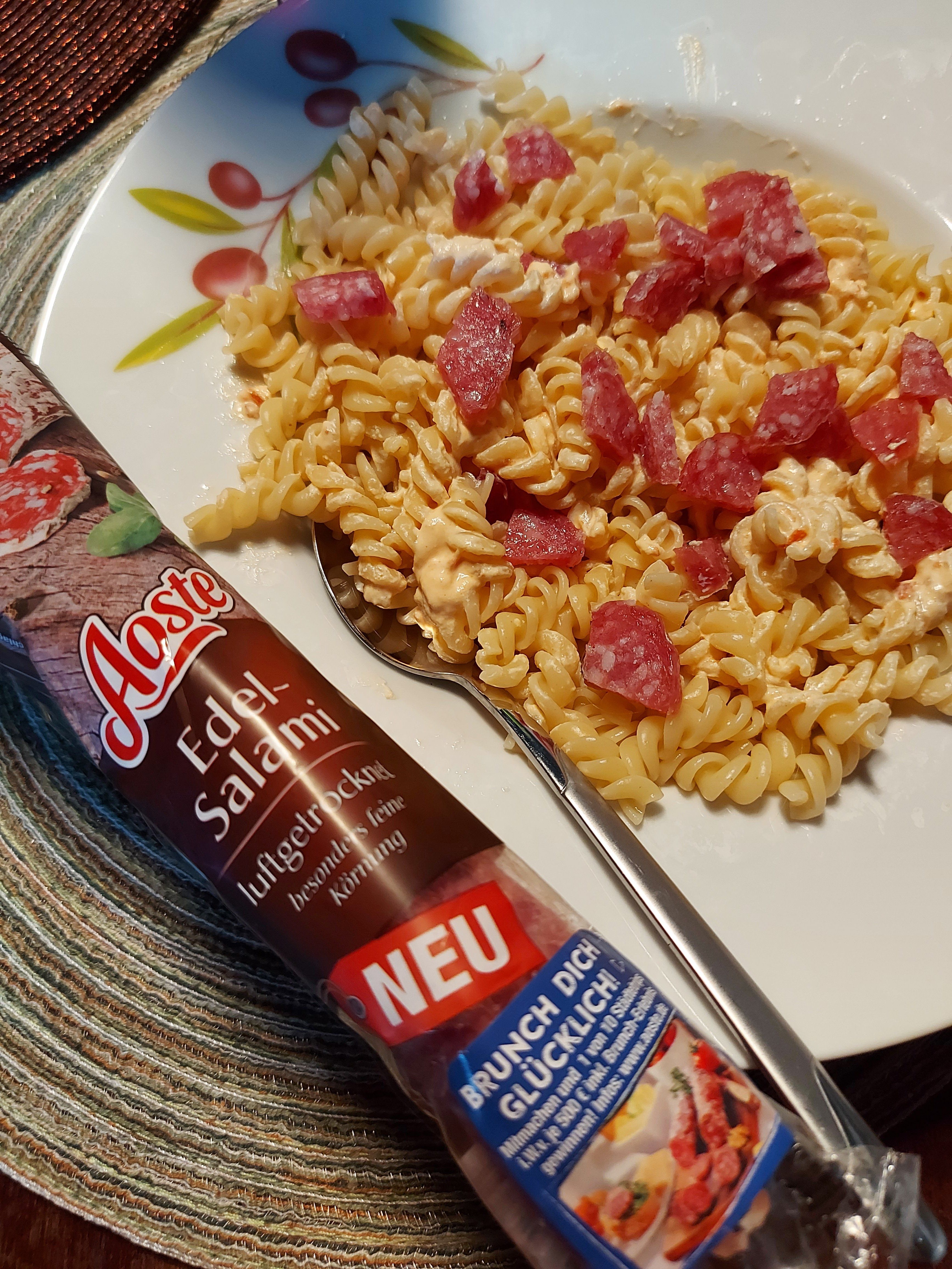 Es gab gebratene Champignons, Karotten, Tiefkühlspinat, Schupfnudeln (nur wenige, nicht die ganze Packung) und 1/4 der Aoste Salami. Die Salami hat das Gericht perfekt verfeinert, es vollkommen gemacht und prima aufgepeppt 😀