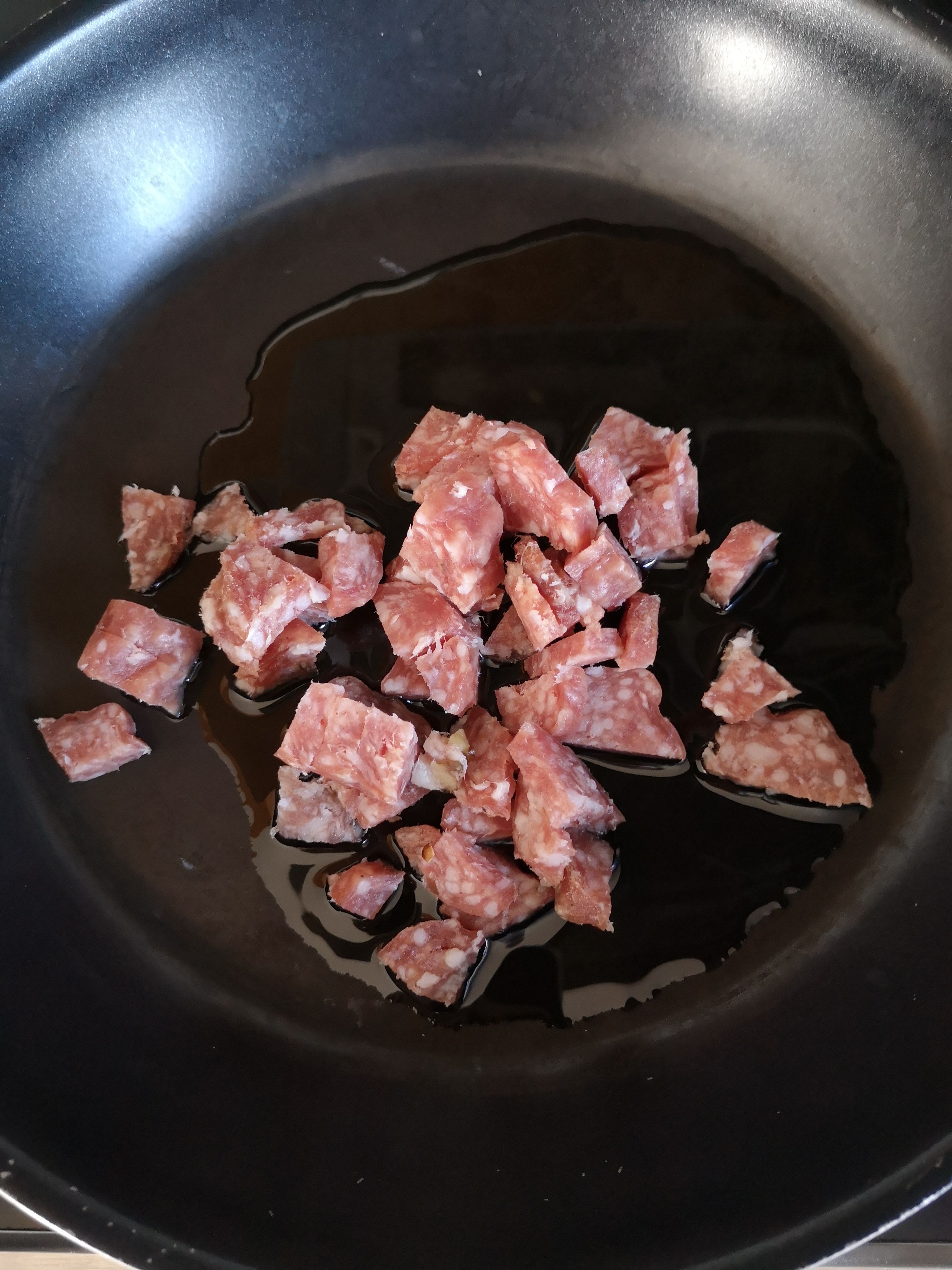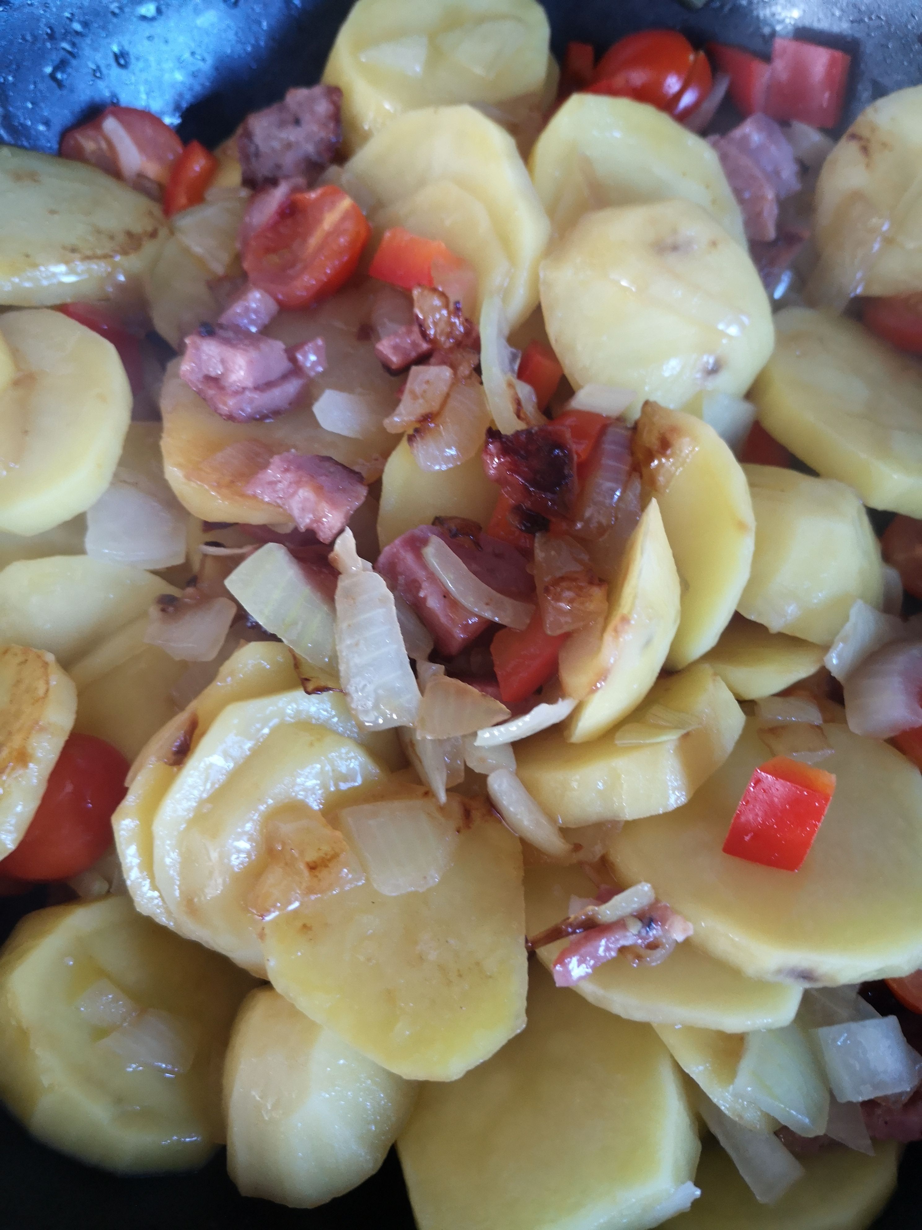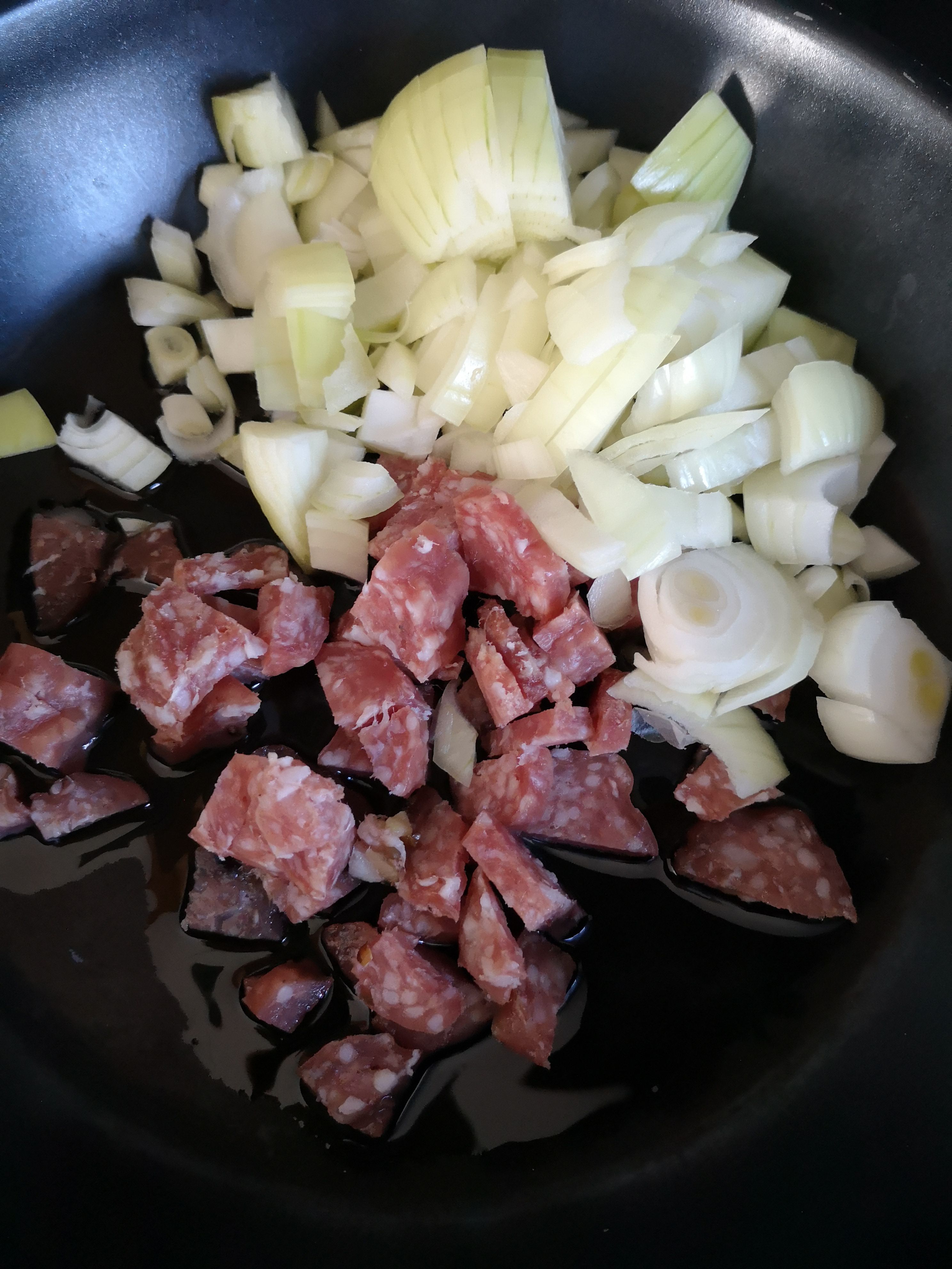 Es gab gebratene Champignons, Karotten, Tiefkühlspinat, Schupfnudeln (nur wenige, nicht die ganze Packung) und 1/4 der Aoste Salami. Die Salami hat das Gericht perfekt verfeinert, es vollkommen gemacht und prima aufgepeppt 😀