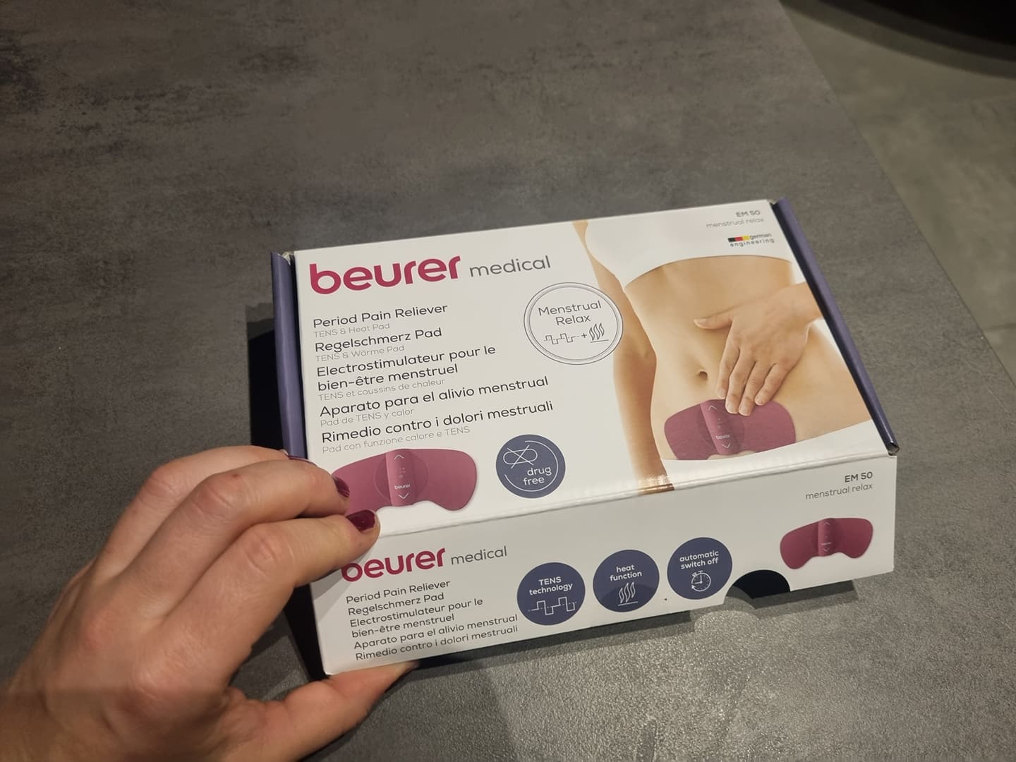 Das Beurer Menstrual Relax EM 50 habe ich freudig ausgepackt und war sehr gespannt auf die Wirkung. Positiv aufgefallen sind mir das Design und die gut verständliche Bedienungsanleitung.