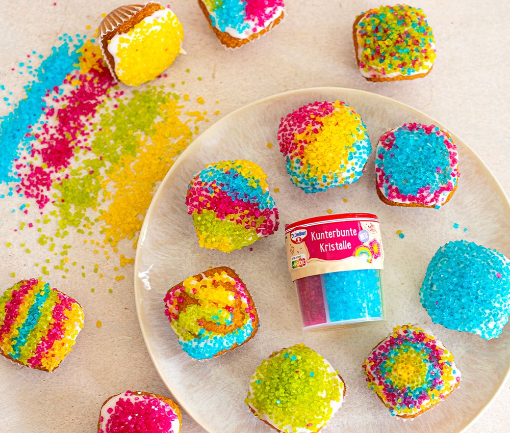 Egal ob große Torte, kleine Muffins, Plätzchen oder Dessert, egal ob einfarbig oder gemischt: Dekoriere dein frisch zubereitetes Gebäck, Eis oder Dessert mit den Kunterbunten Kristallen. Streust du sie durcheinander oder legst du ein schönes Muster? Teile Fotos deines Kunstwerks und Videos der Zubereitung auf ohoftheday.com und in deinen Social Accounts.