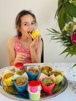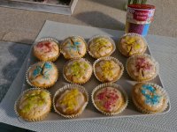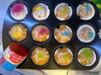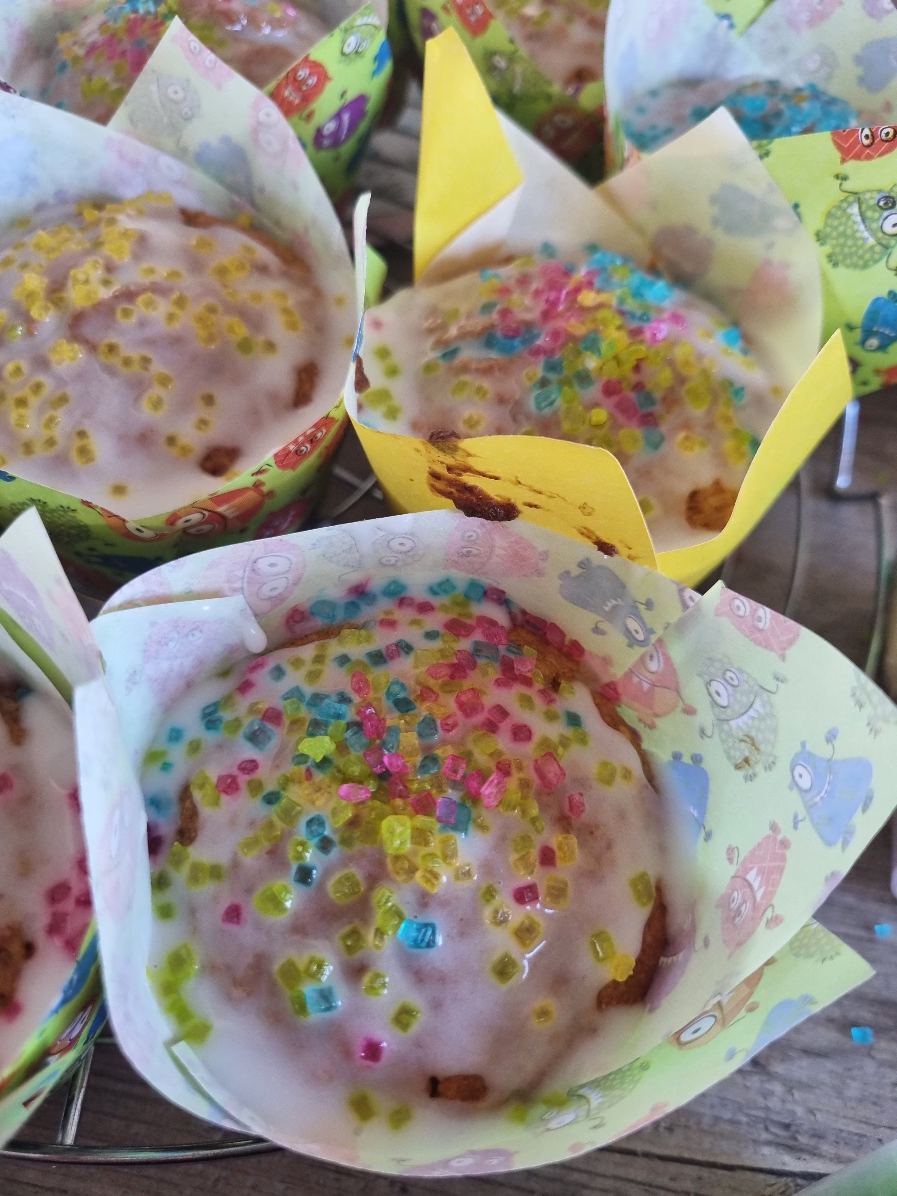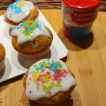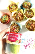 Wir haben Muffins gebacken und diese dann mit einer Puderzucker/Zitronen Glasur überzogen und darauf die Kunterbunten Kristalle verteilt. Mein 3 Jähriger Sohn hat fleißig geholfen und großen Spaß gehabt!