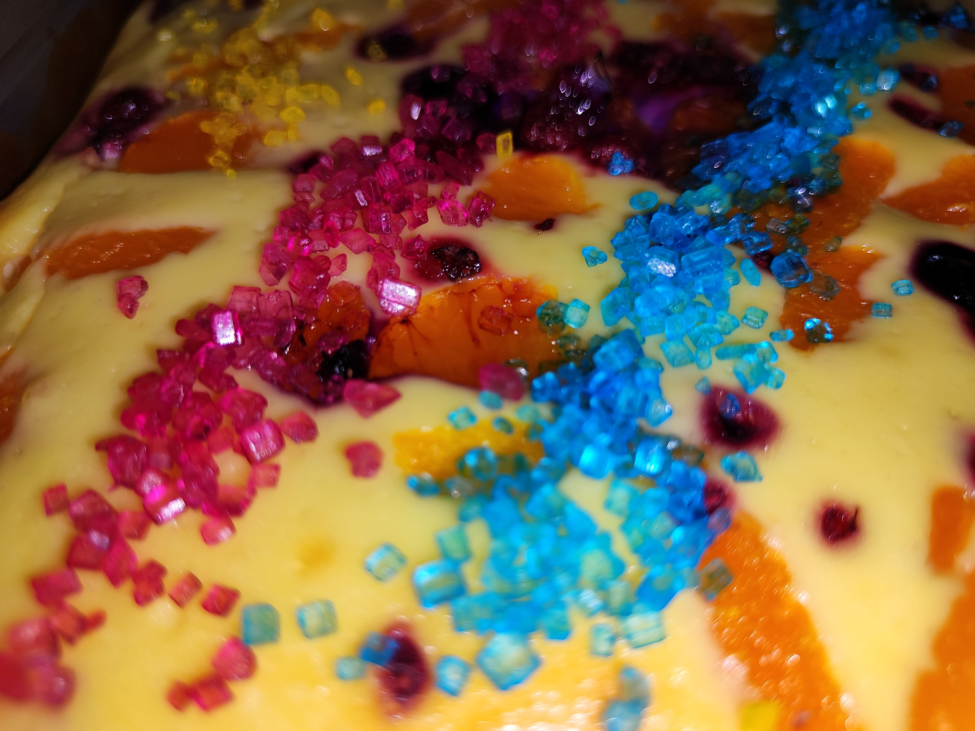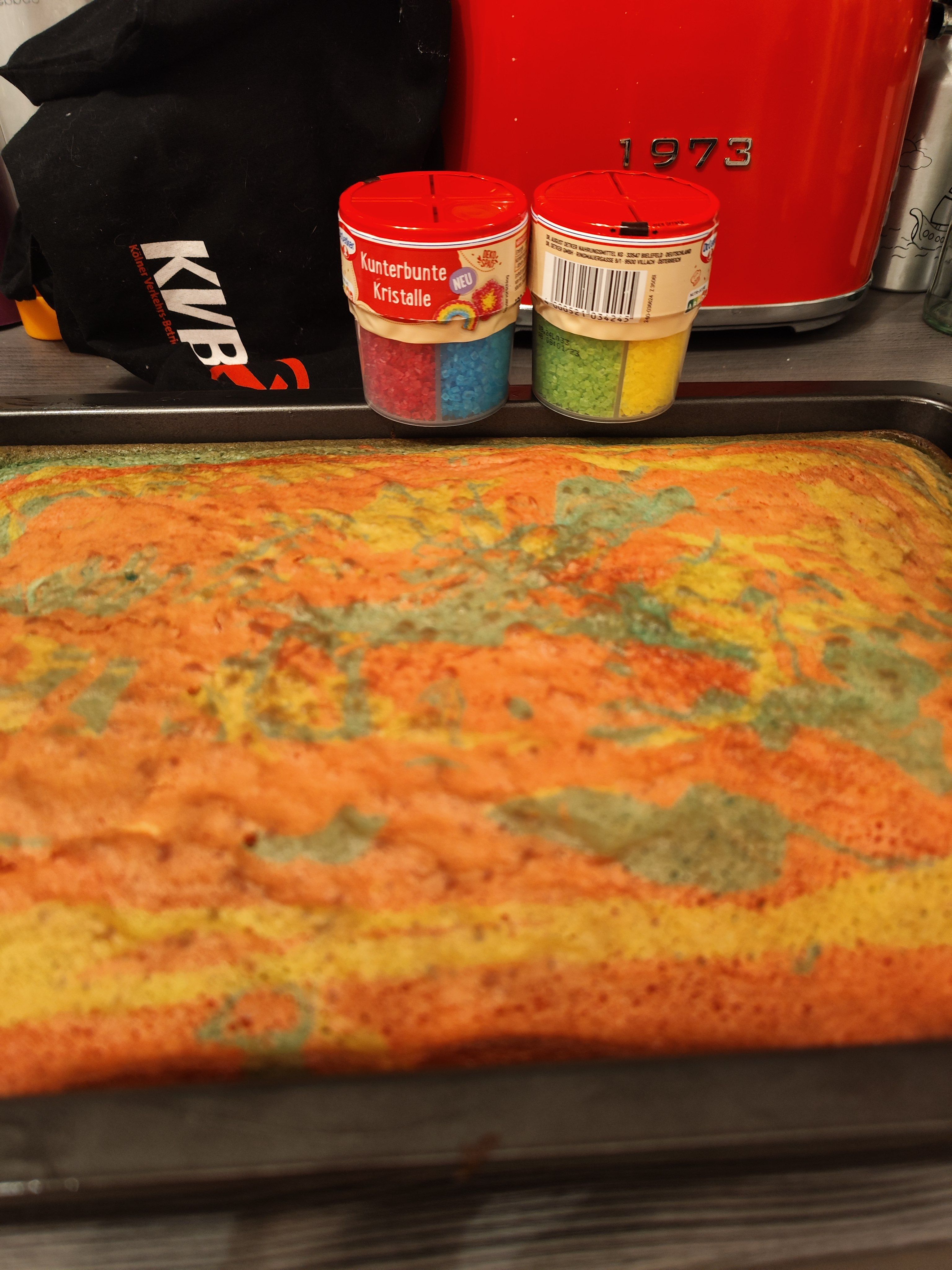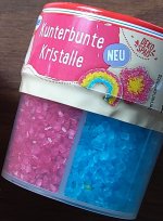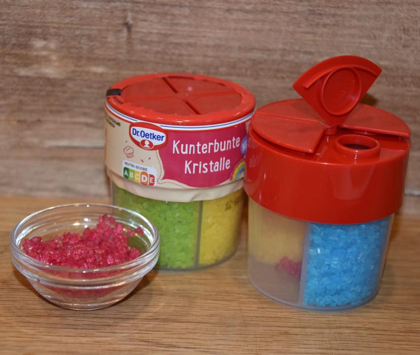 Die Farben der kunterbunten Kristalle von Dr. Oetker fallen sofort ins Auge. Sie sind sehr intensiv und leuchtend. Das gefällt mir sehr gut.