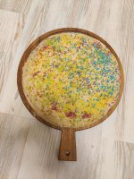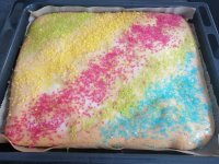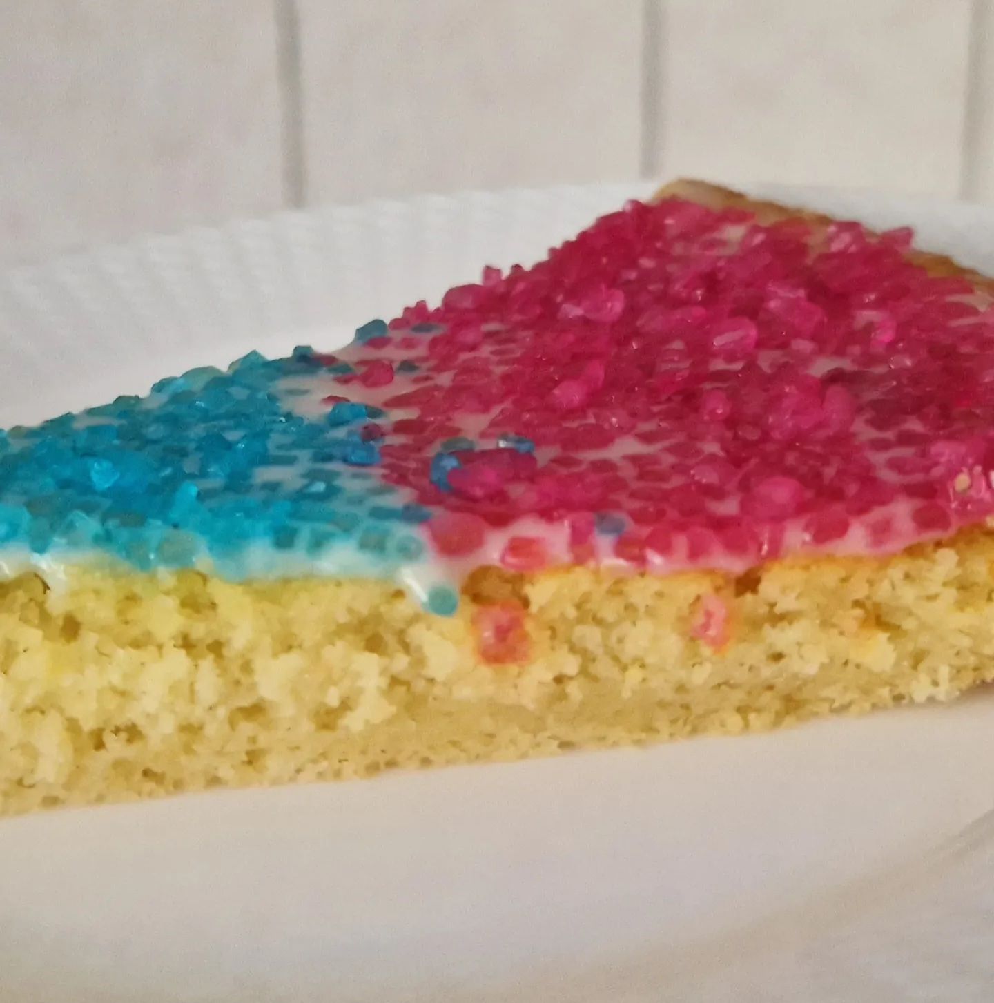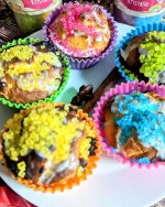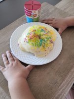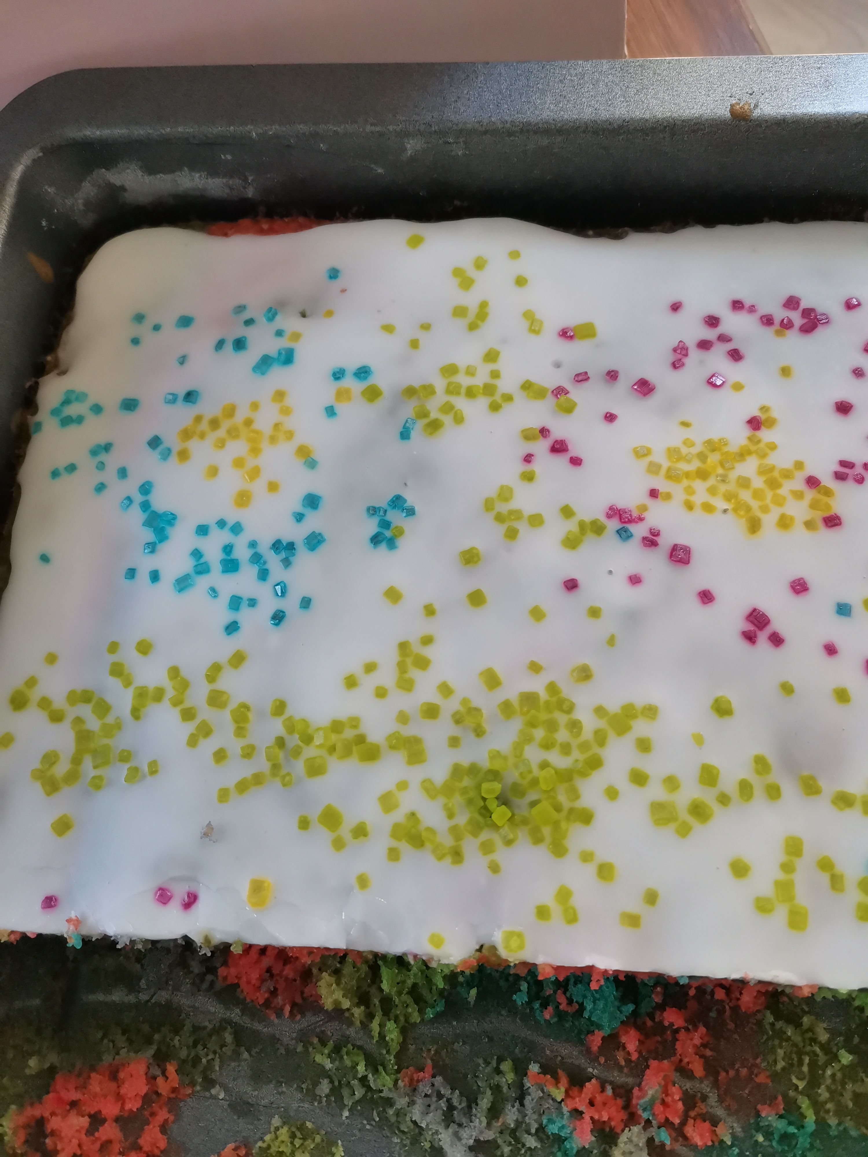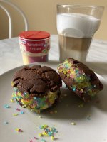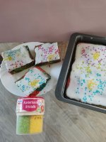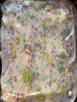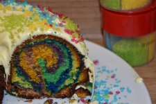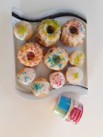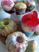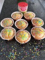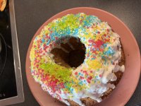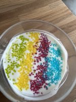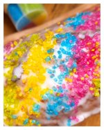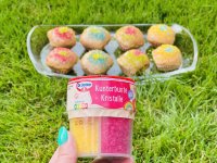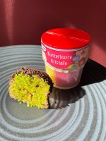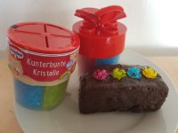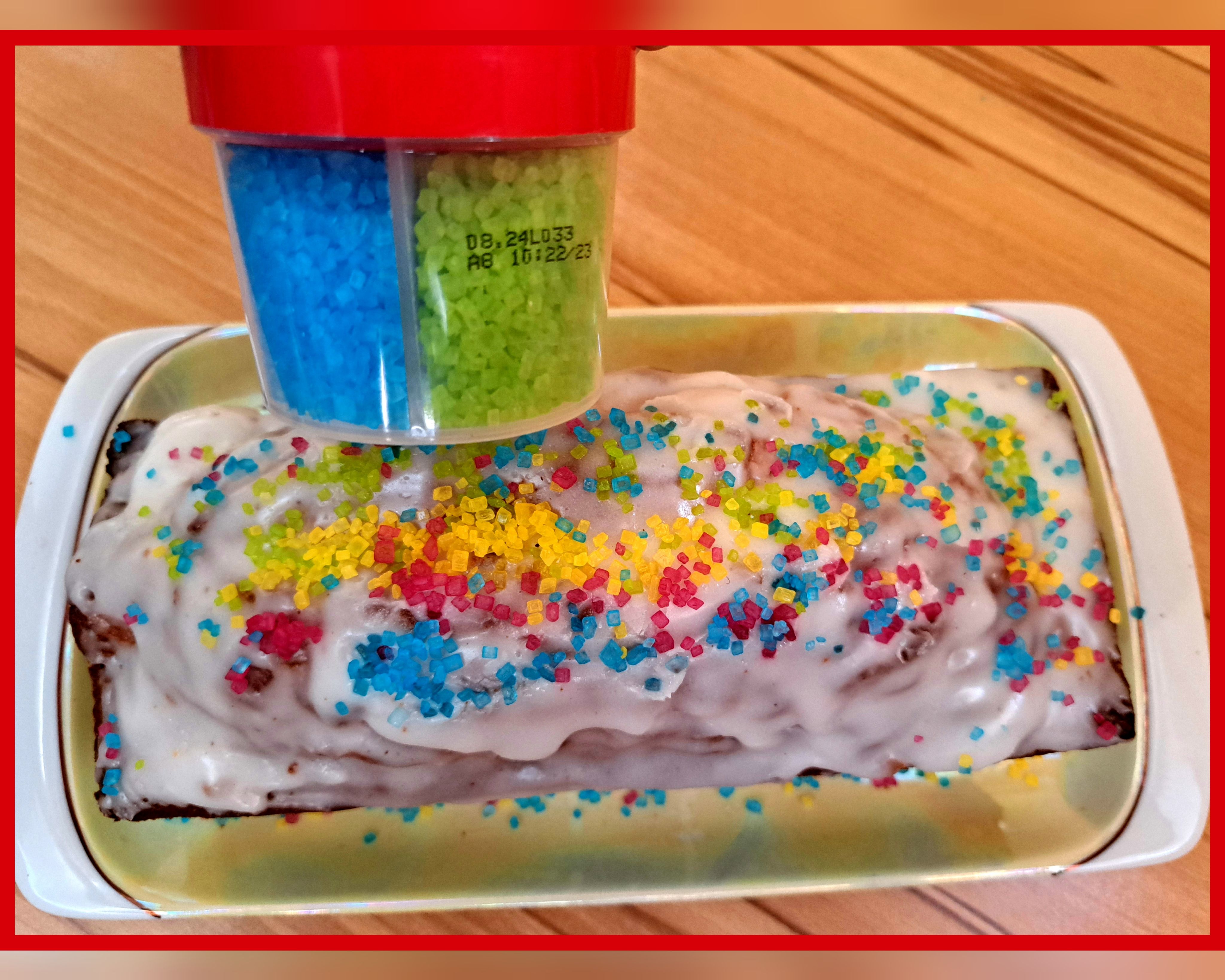 Die bunten Streusel sind echt nett anzuschauen. Leider ist es beim Essen kein gutes Gefühl. Man fühlt sich als würde man einfach nur große zuckerkristalle beisen. Selbst den Kindern ist es zu viel.