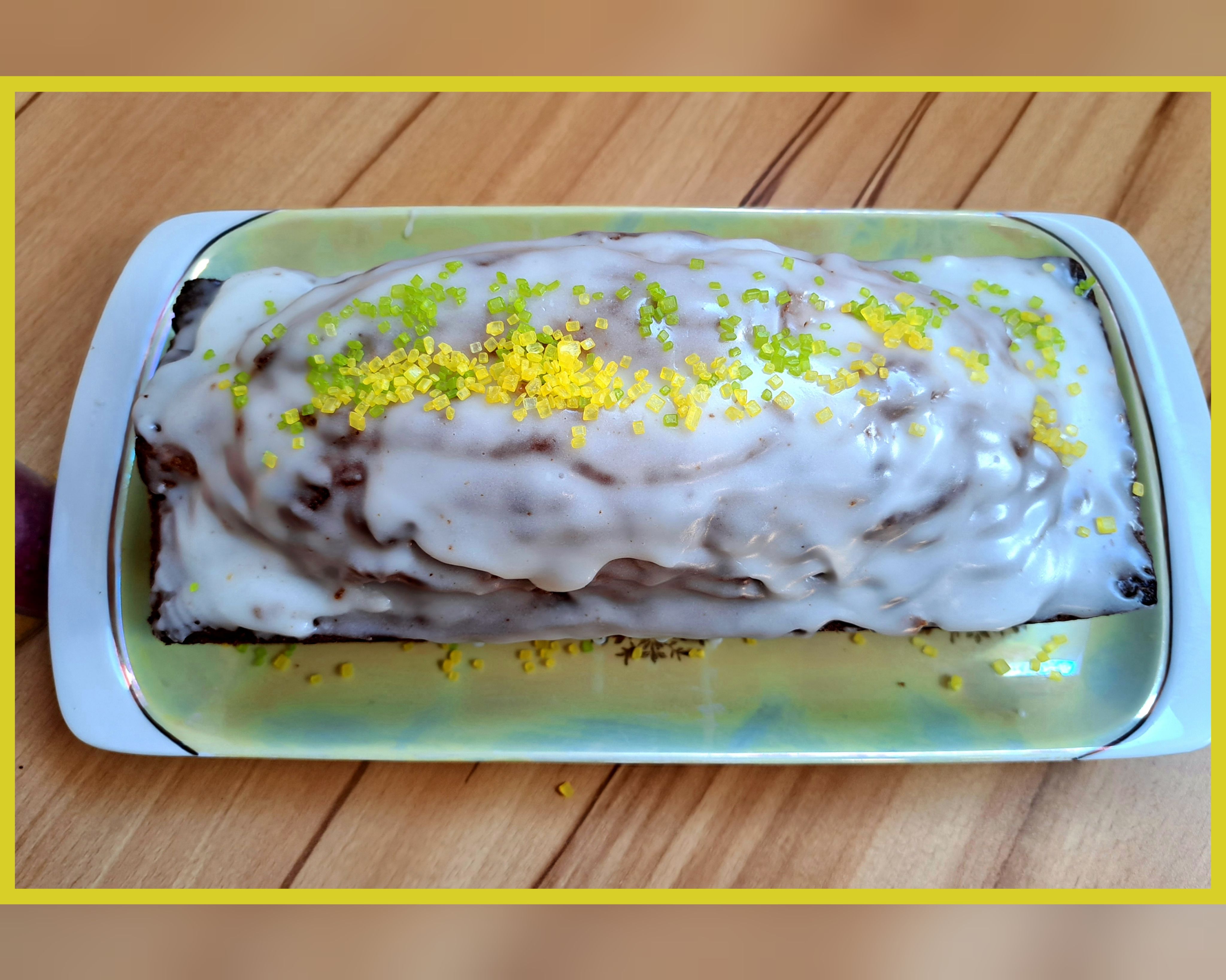Ich hatte so Lust auf einen Zitronen- Blechkuchen und mit den kunterbunten Kristallen sah er direkt viel toller aus, angerichtet auf dem Drehteller.