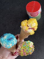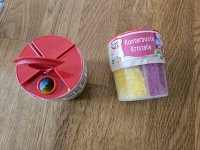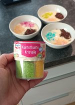 Die Kunterbunten Kristalle haben tolle kräftige Farben, und sehen natürlich tatsächlich wie Kristalle aus. Super dass direkt vier verschiedene Farben in einer Box, aber dennoch jeweils in separaten Fächern sind. So kann man sich für einzelne Farben entscheiden oder eben doch kunterbunt mixen. Teilweise waren die Streusel
