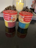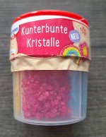 Die "Kunterbunten Kristalle" machen aus einem einfachen Gebäck ein Highlight für die Kaffeetafel. Ein schlichter Amerikaner wird zu einem echten Hingucker. Die Farben sind toll und Kinder können damit beim Dekorieren ihrer Fantasie freuen Lauf lassen. Die Verpackung ist toll, man kann jede Farbe einzeln streuen. Es ist gut das die Deckel nicht irgendwie zusammen hängen. Es wäre toll, wenn es die Kristalle als Nachfüllpackung geben würde, jede Farbe für sich.
