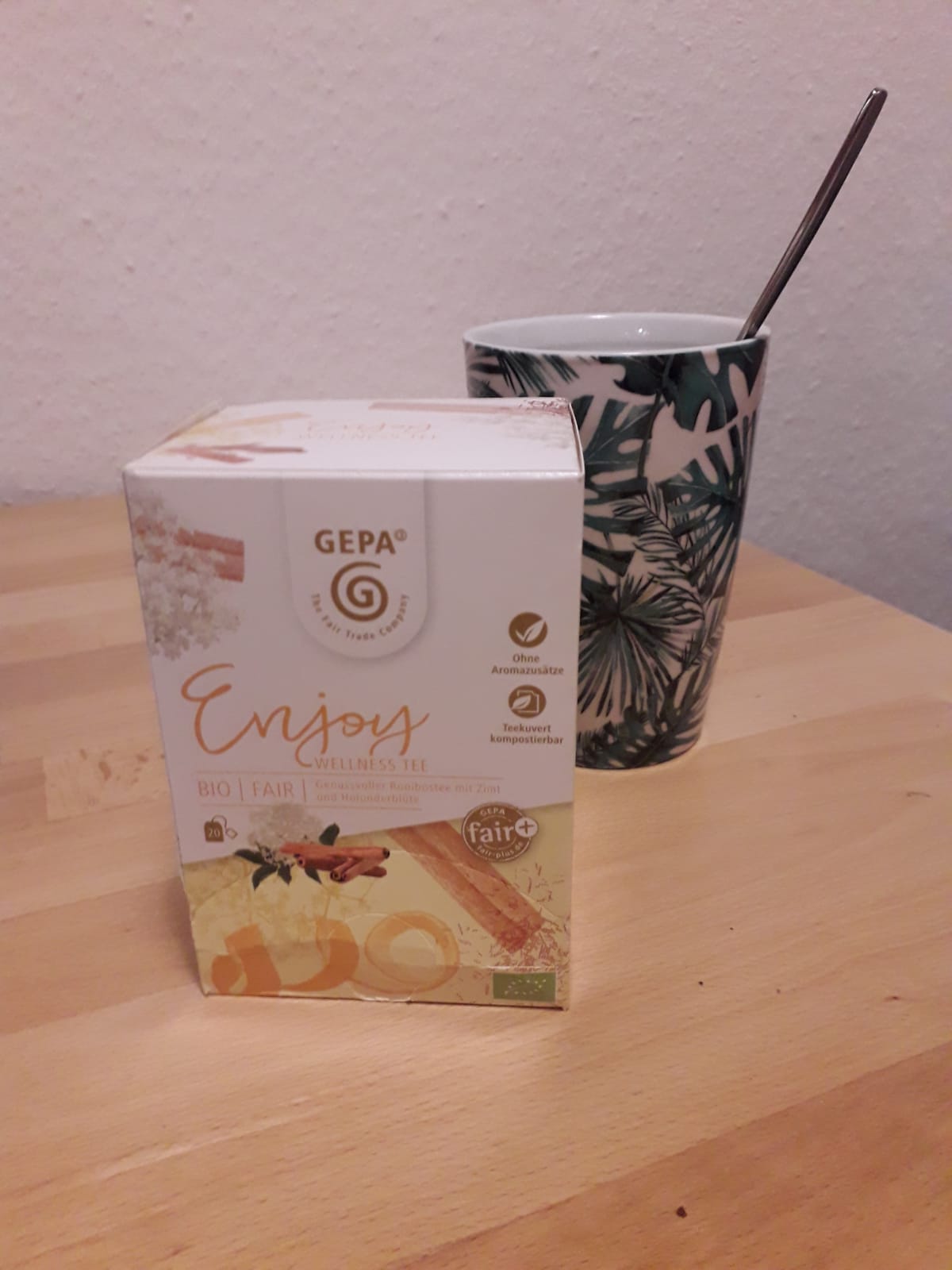 Ich habe den Gepa Power Wellness Tee mir heute gemacht bevor ich arbeiten musste. Mein Hund wollte noch etwas kuscheln. Ich war überrascht wie gut der Tee schmeckte (der Geruch war nicht ansprechent). Aber er war lecker und ich ein gutes Gefühl danach.