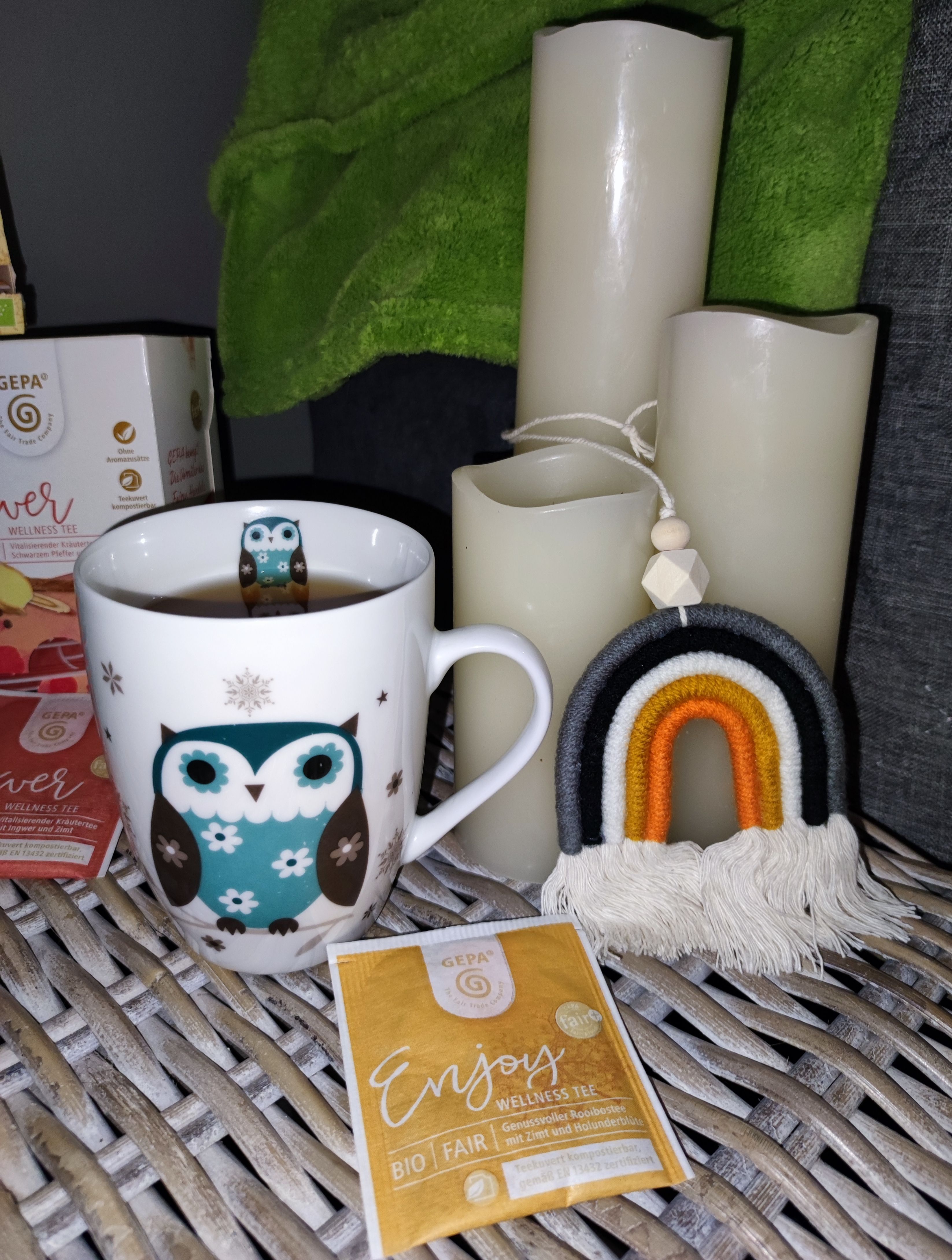 Herbstzeit ist für mich Tee-Zeit. Da kam das tolle Testpaket genau richtig. Ich habe es mir gleich mit meinem Kuschelpulli, meiner Kuscheldecke und einer Tasse dem ENJOY Tee auf der Couch gemütlich gemacht.