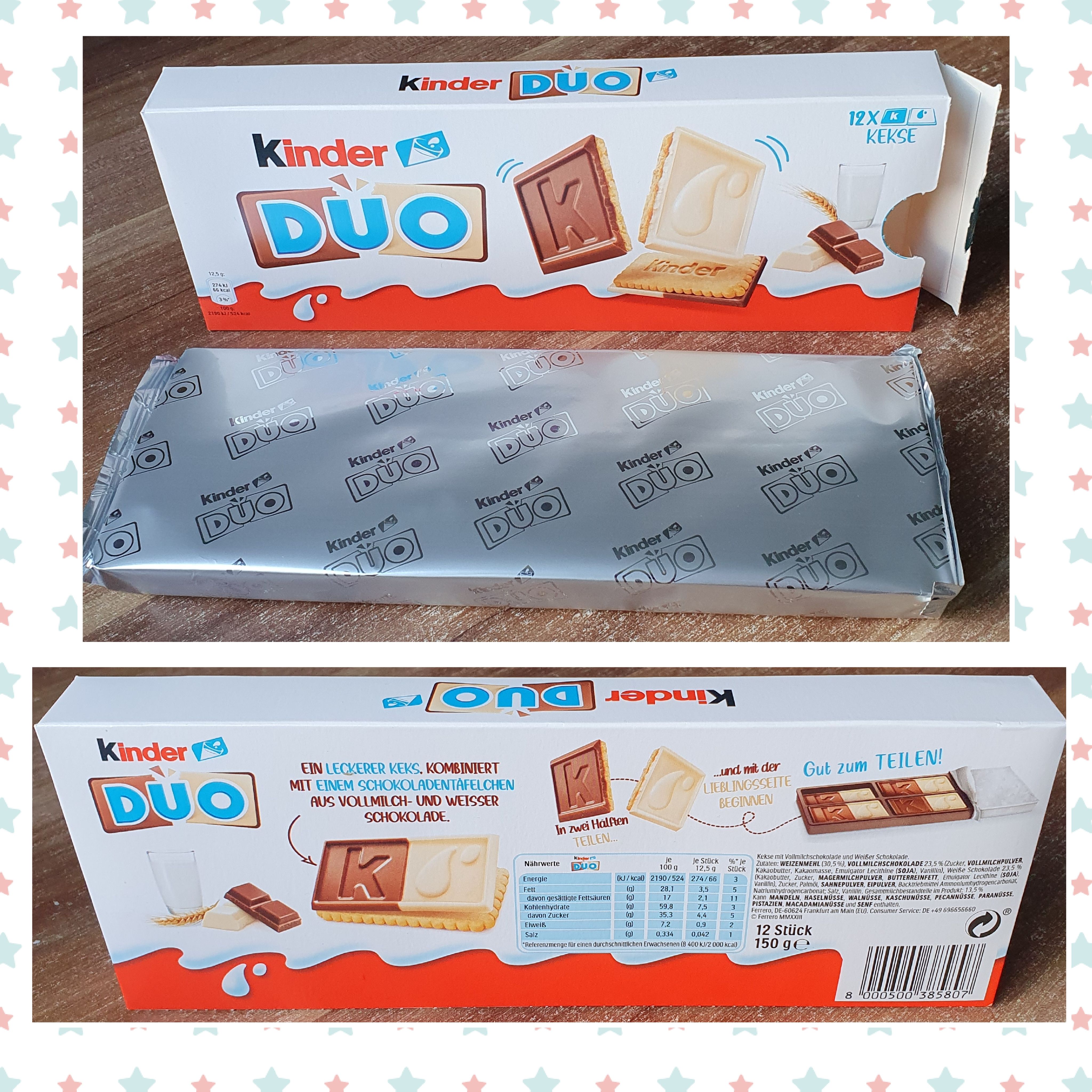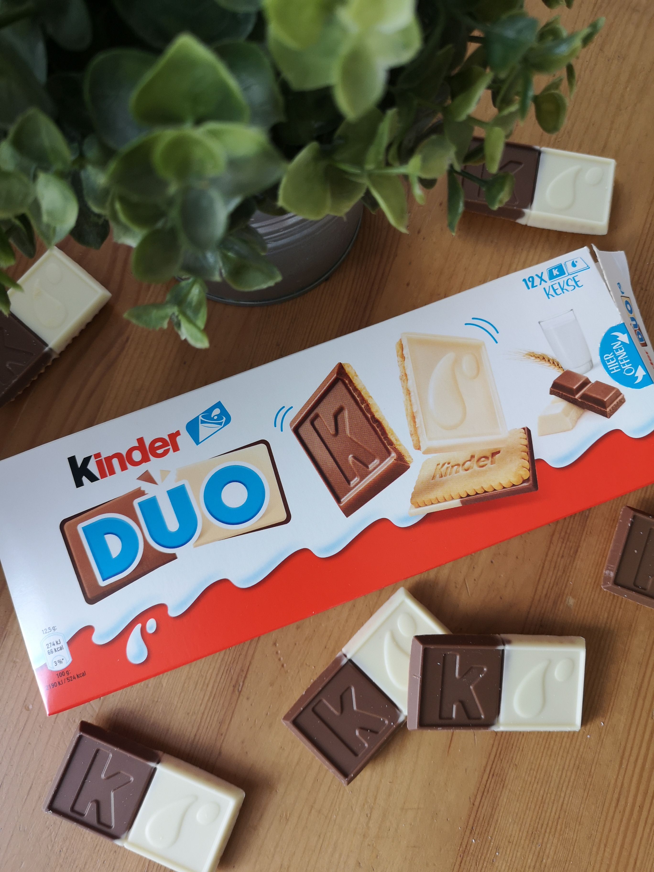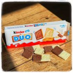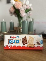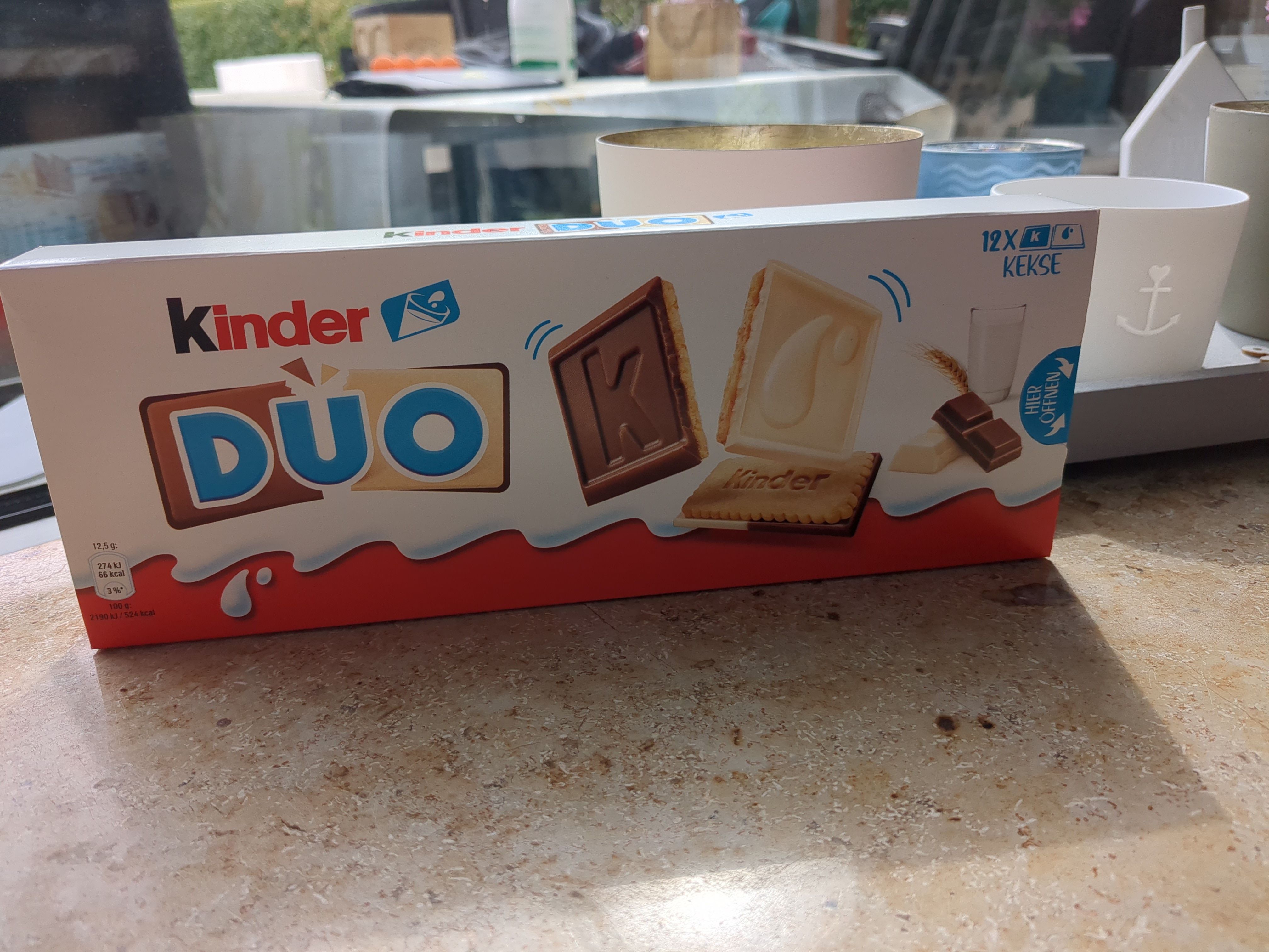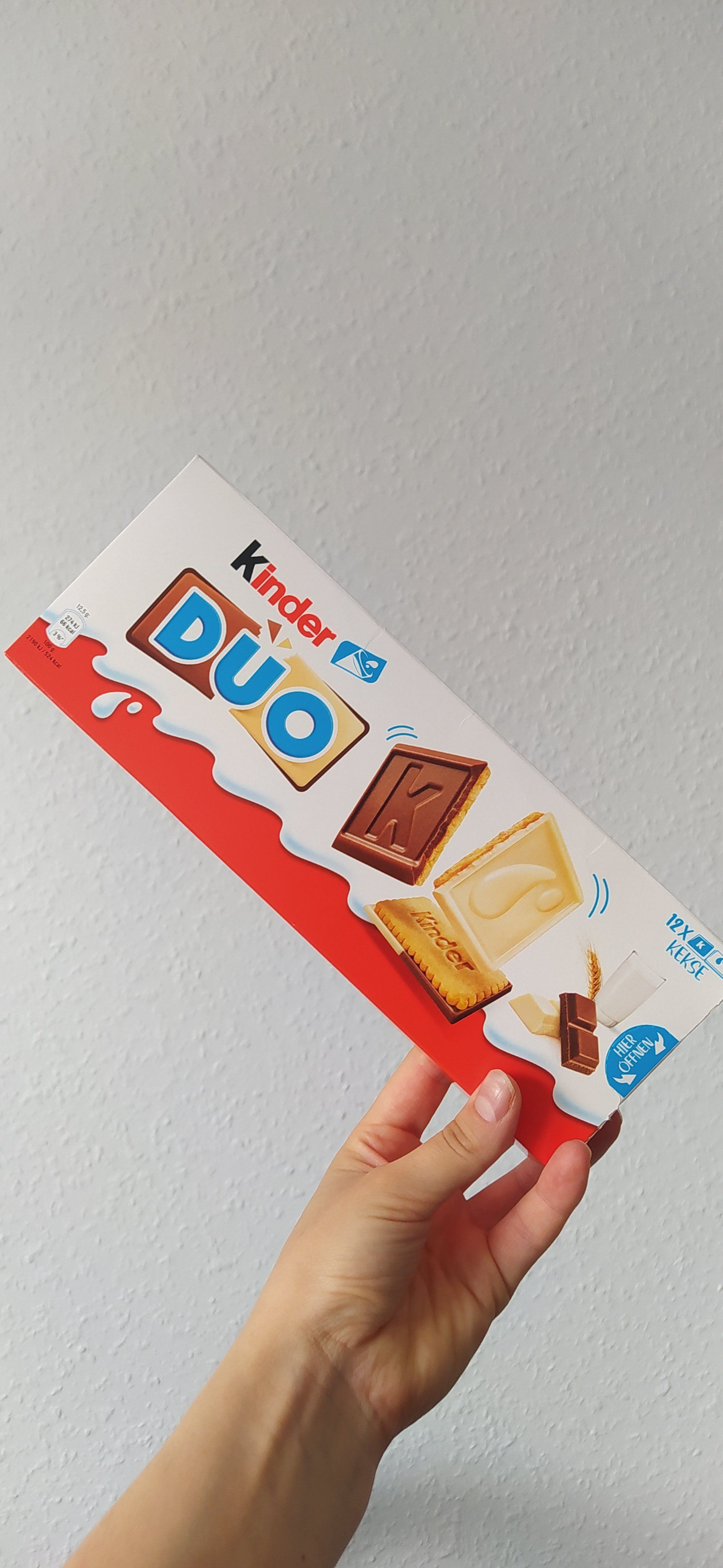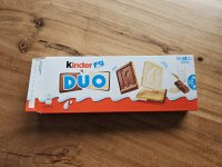 Kinder Duo der Marke Kinder Schoko trifft weiße Schokolade auf einen Keks ein Hochgenuss ideal zum Tee oder Kaffee oder in Milch getaucht einfach lecker. Der Keks ist schön knusprig leckere Schokolade in weiß und in braun... ideal auch zum Teilen