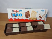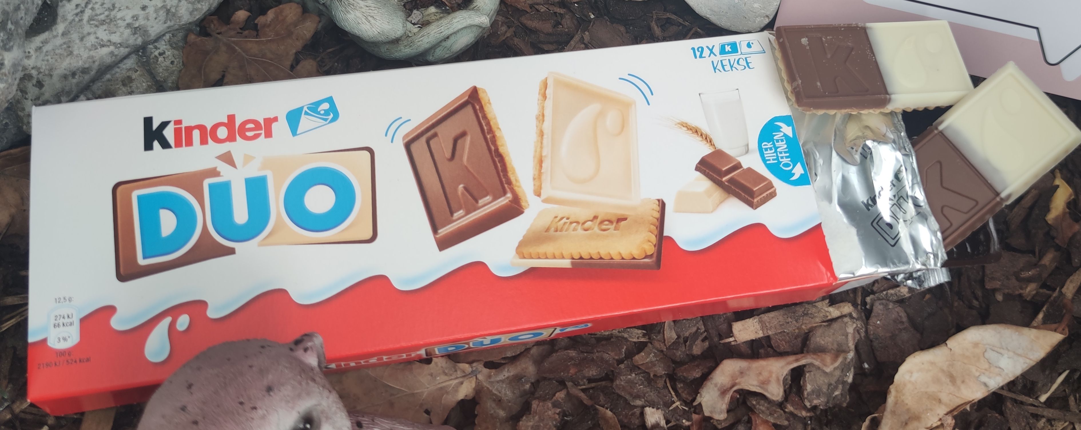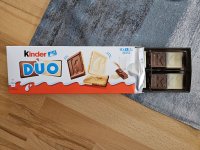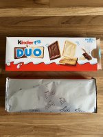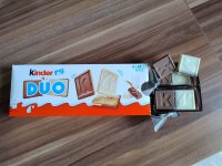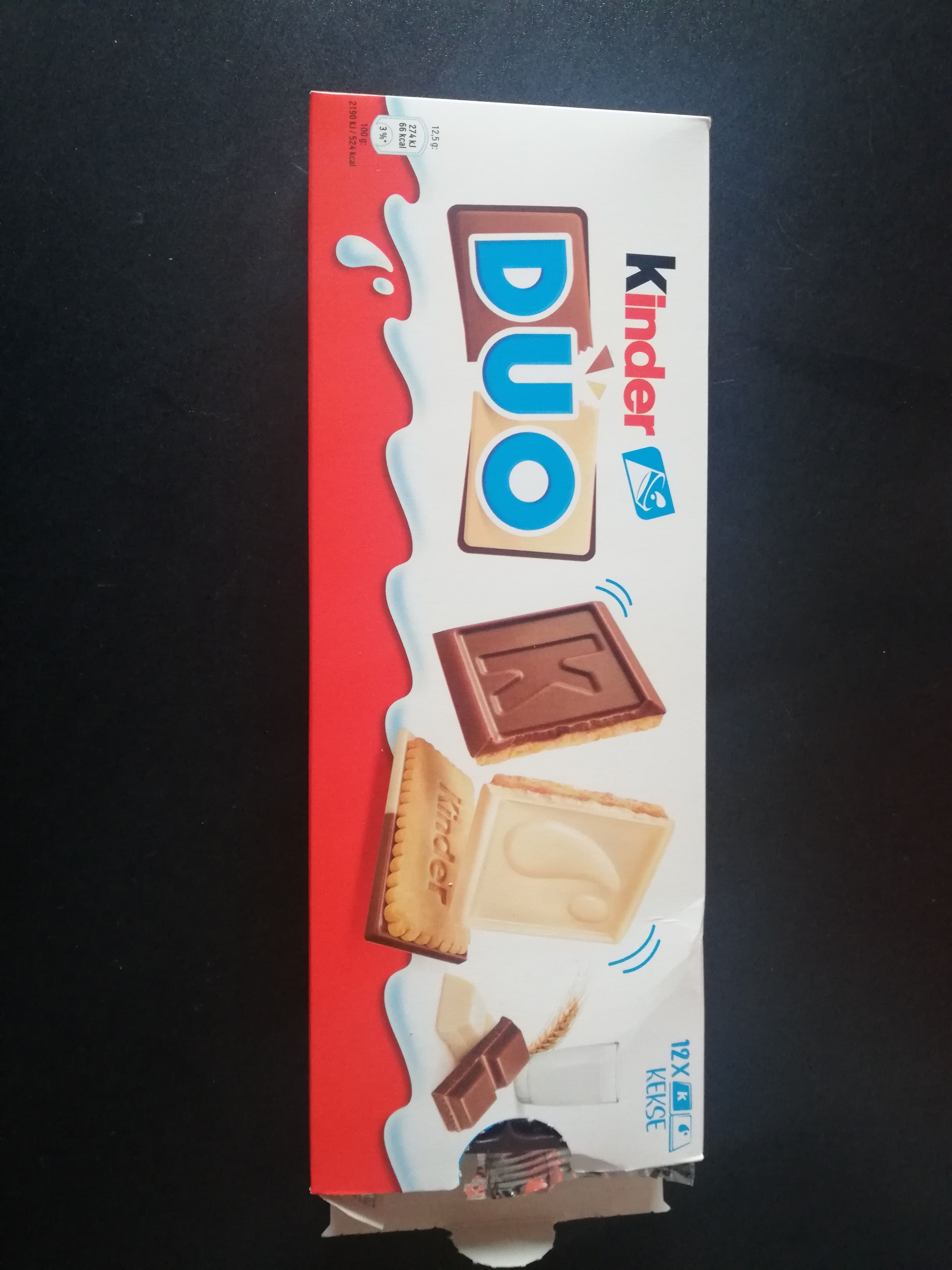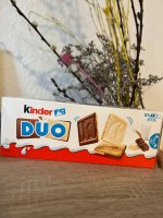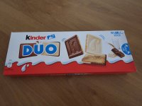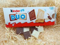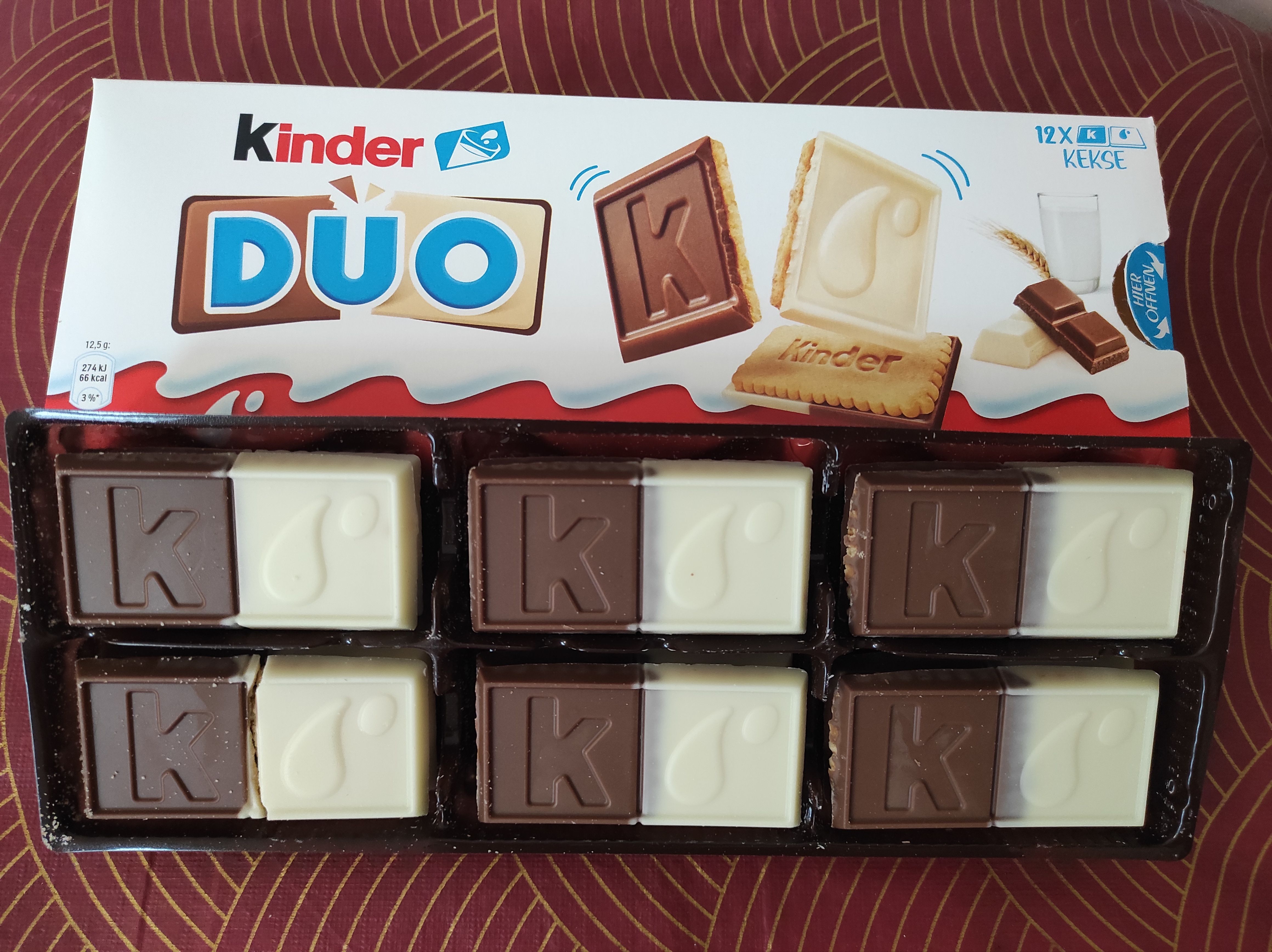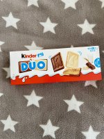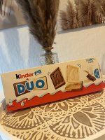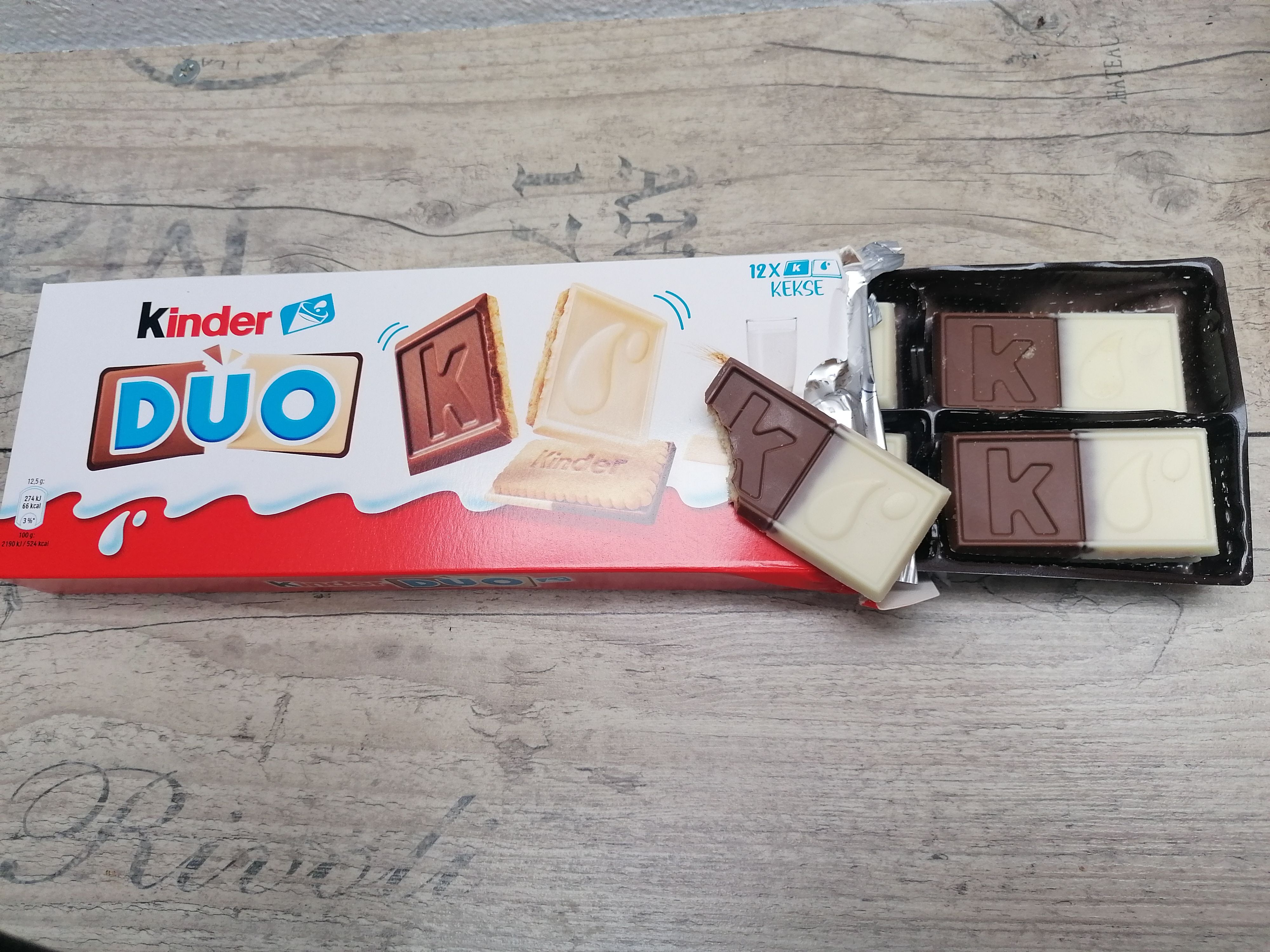 Kinder Duo der Marke Kinder Schoko trifft weiße Schokolade auf einen Keks ein Hochgenuss ideal zum Tee oder Kaffee oder in Milch getaucht einfach lecker. Der Keks ist schön knusprig leckere Schokolade in weiß und in braun... ideal auch zum Teilen