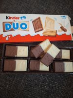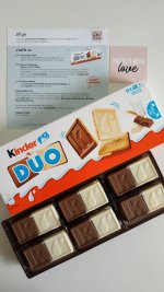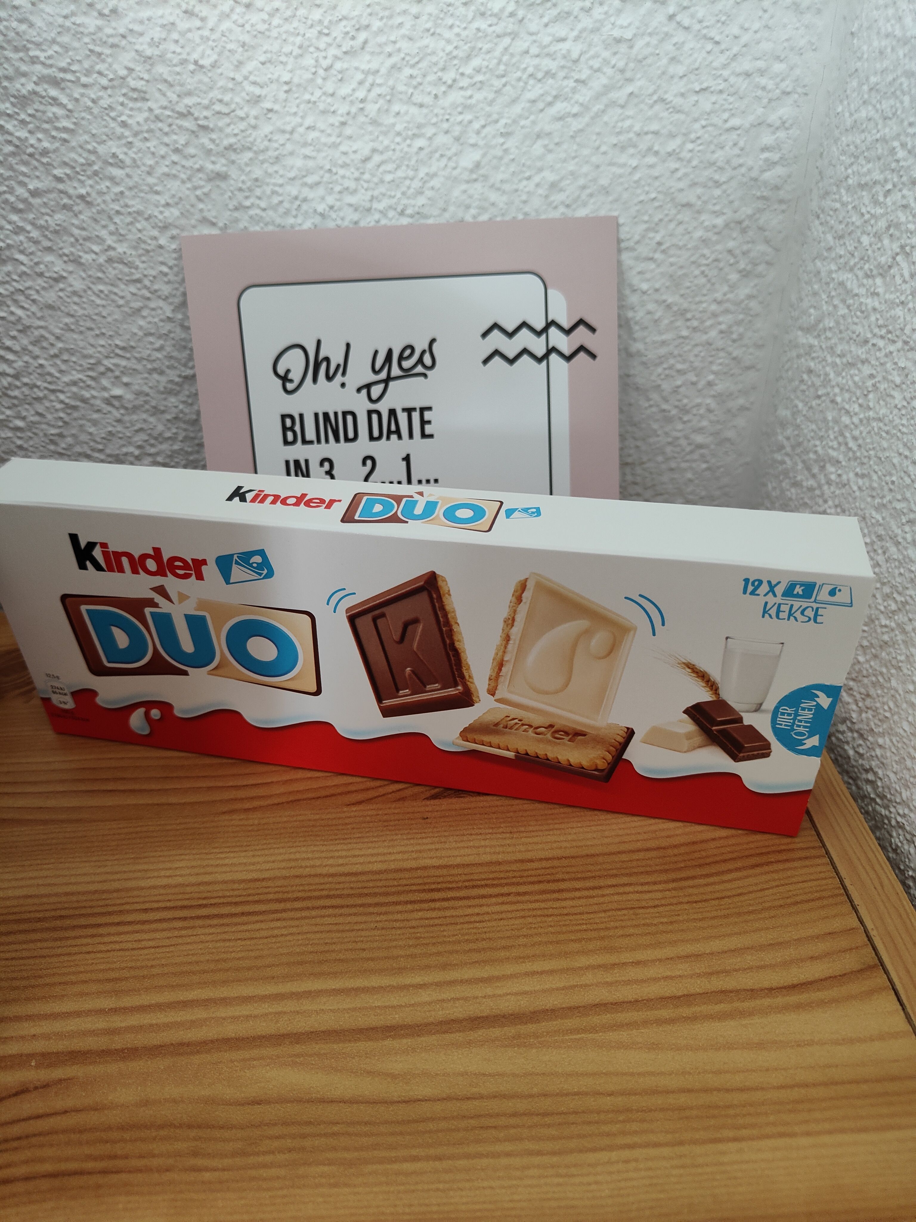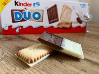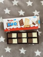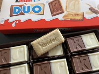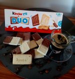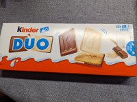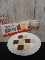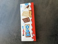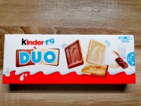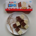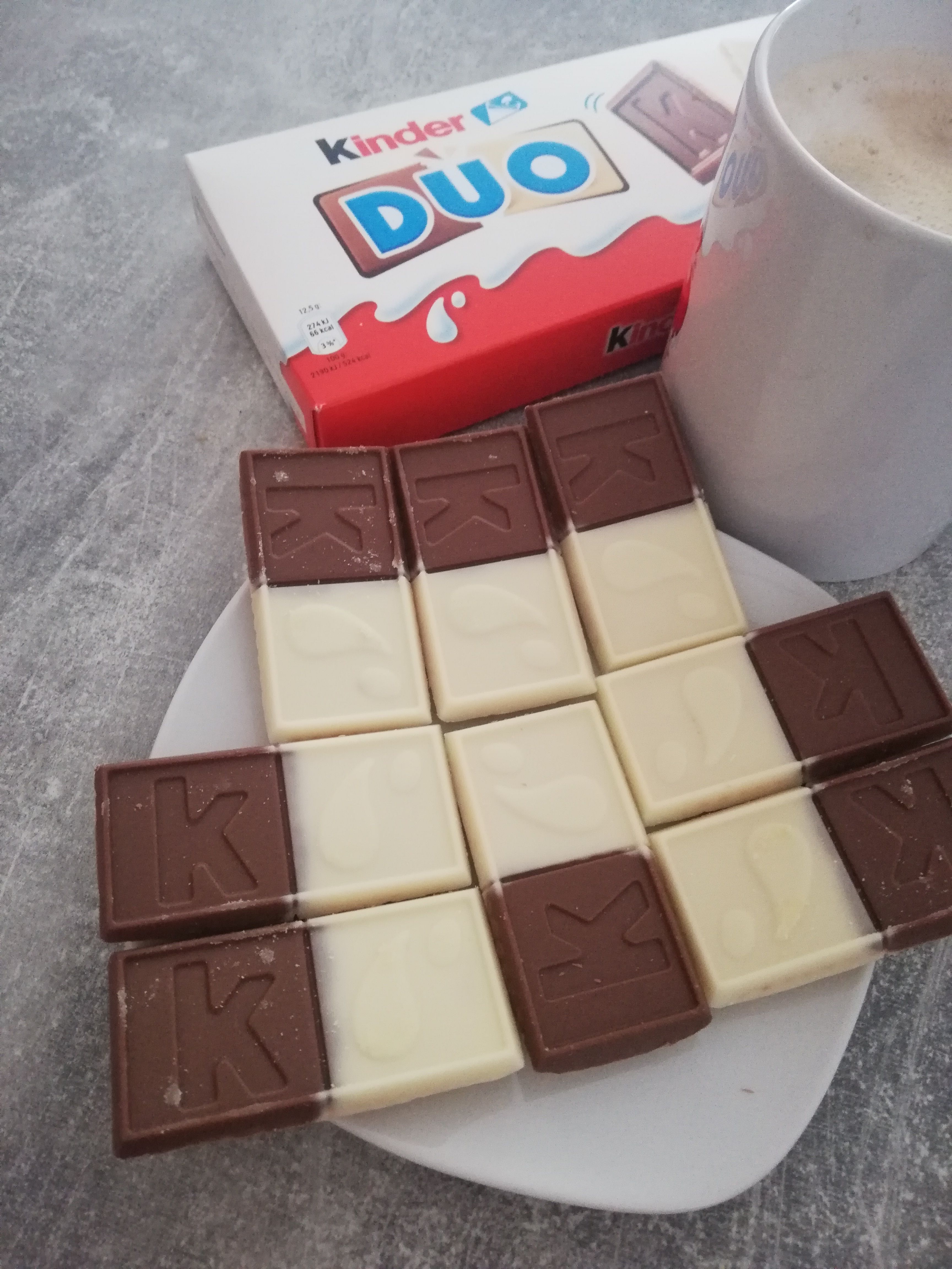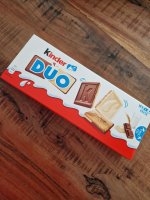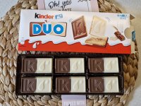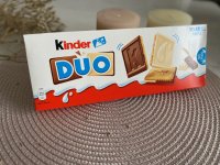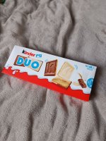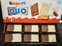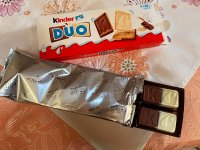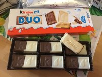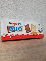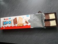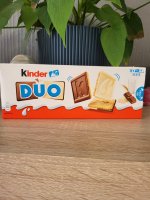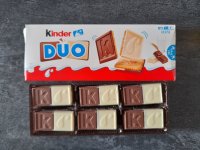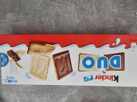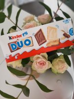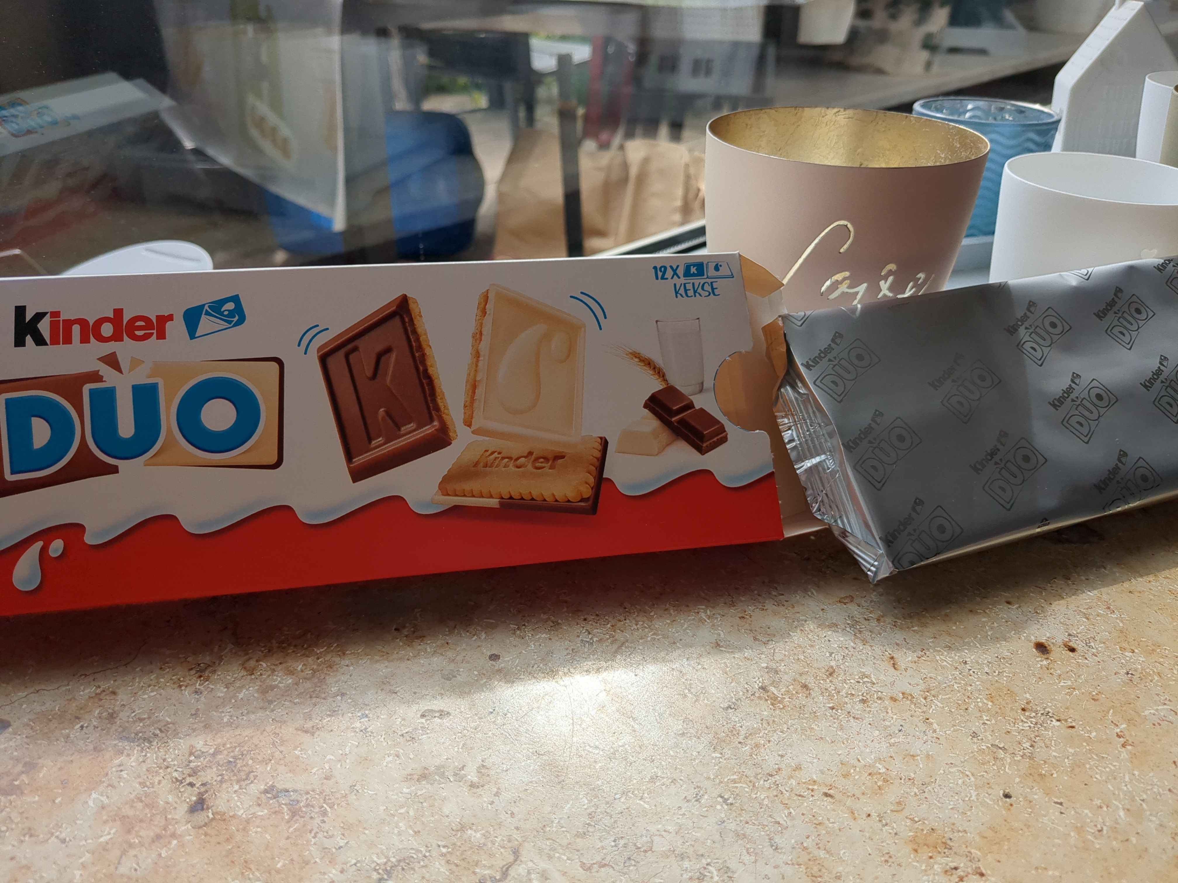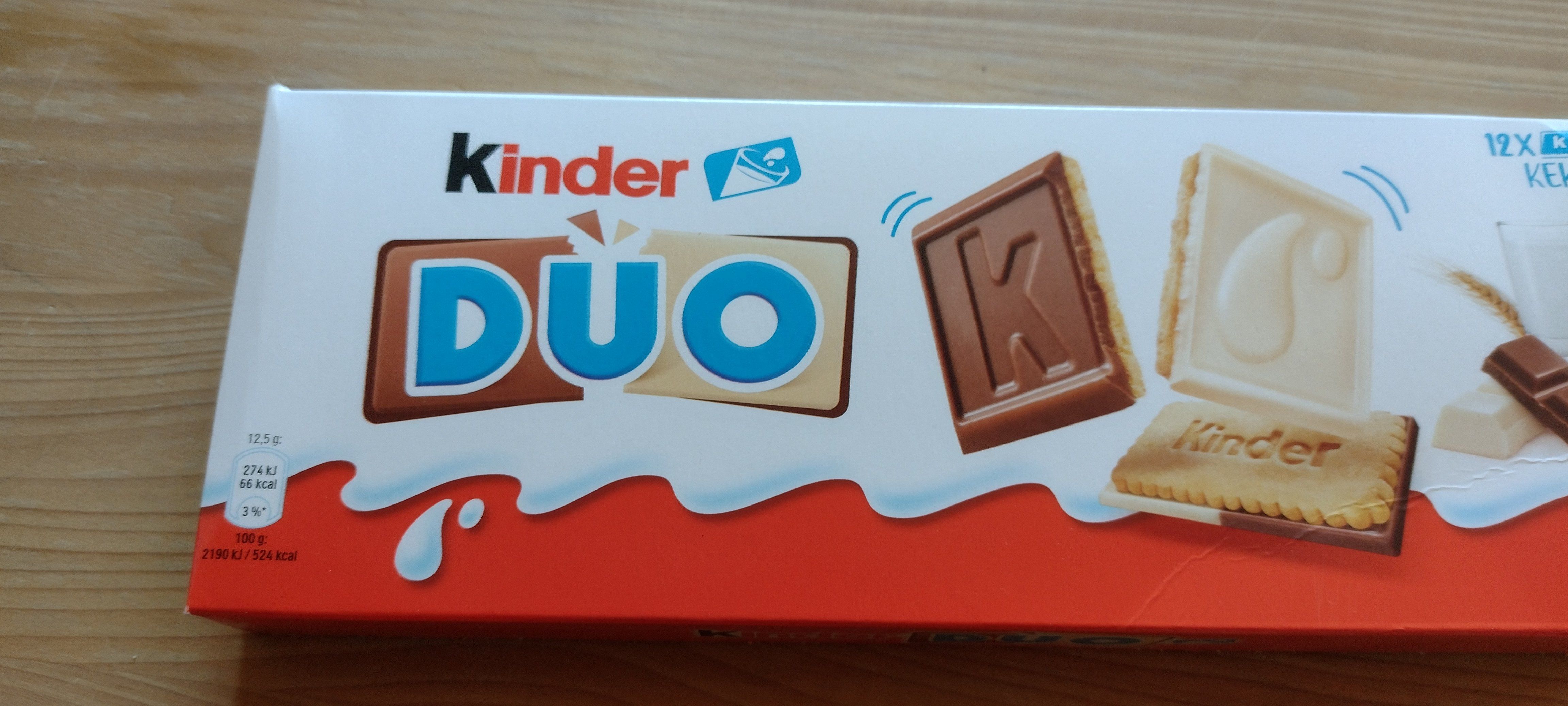 Kinder Duo der Marke Kinder Schoko trifft weiße Schokolade auf einen Keks ein Hochgenuss ideal zum Tee oder Kaffee oder in Milch getaucht einfach lecker. Der Keks ist schön knusprig leckere Schokolade in weiß und in braun... ideal auch zum Teilen