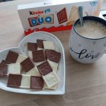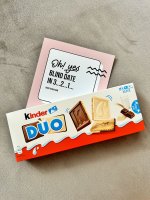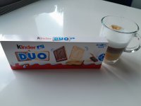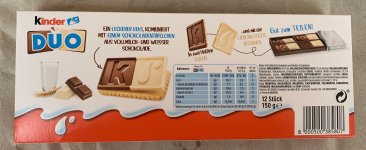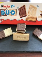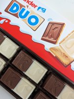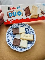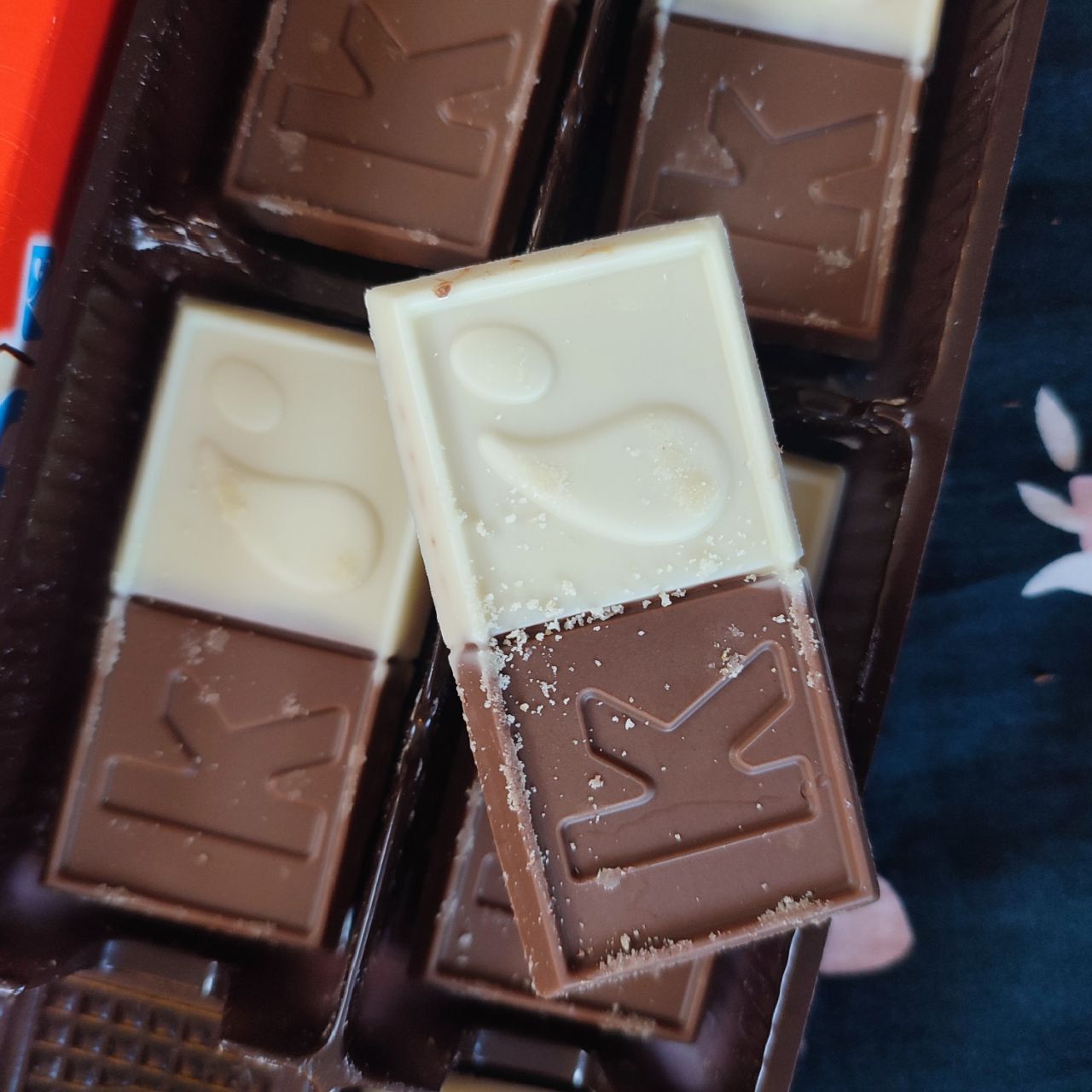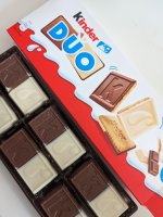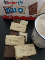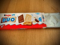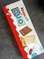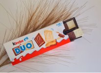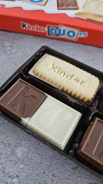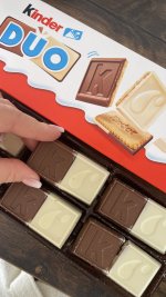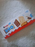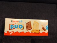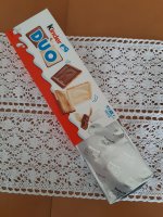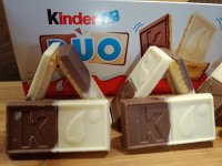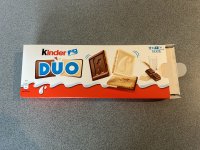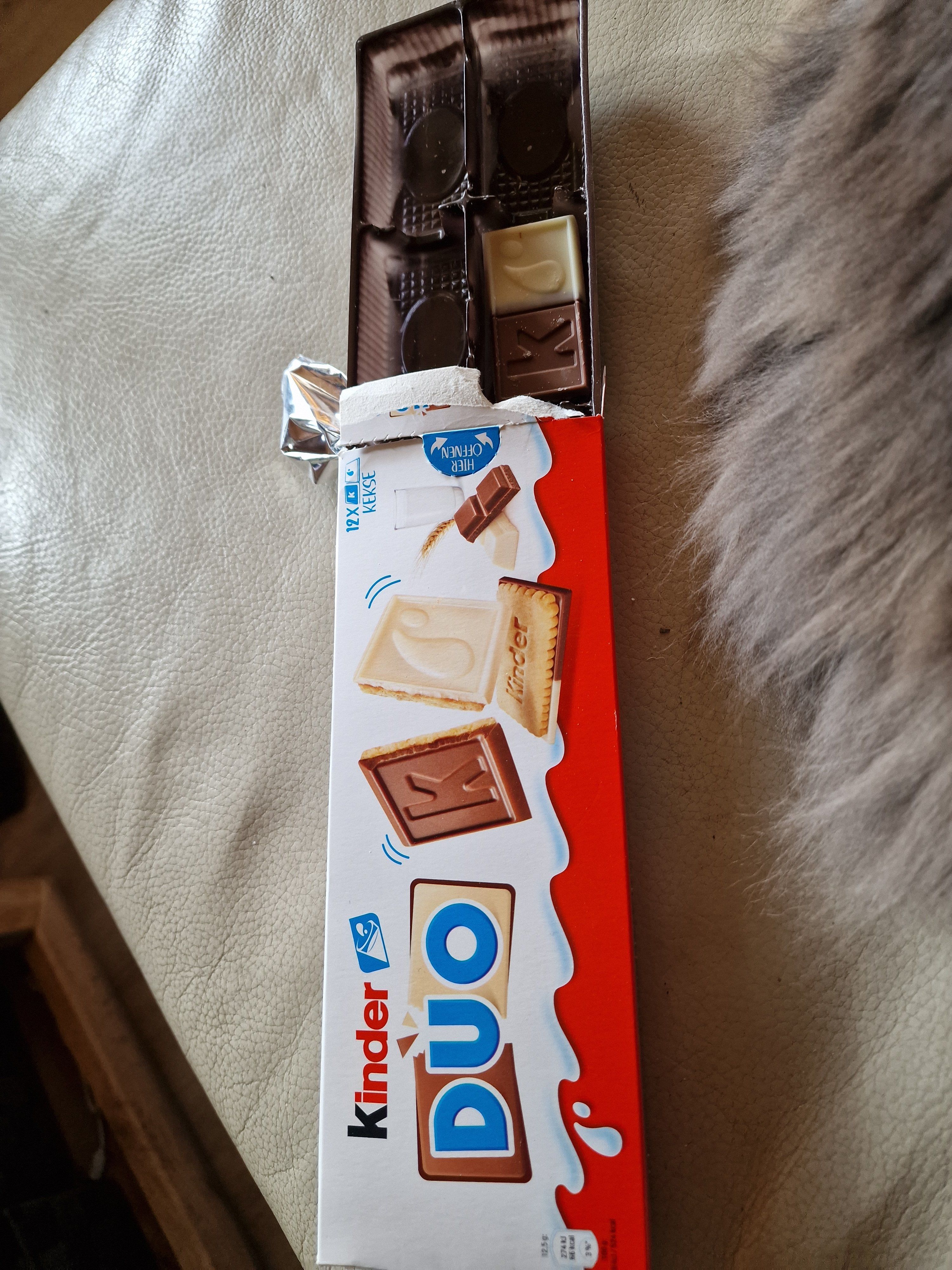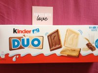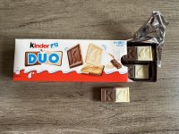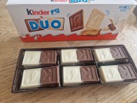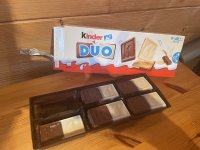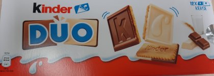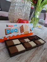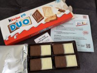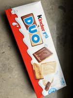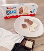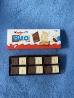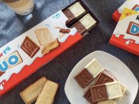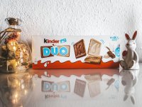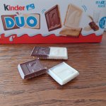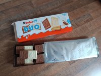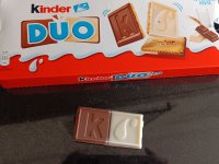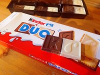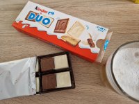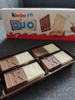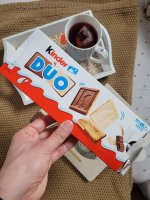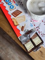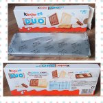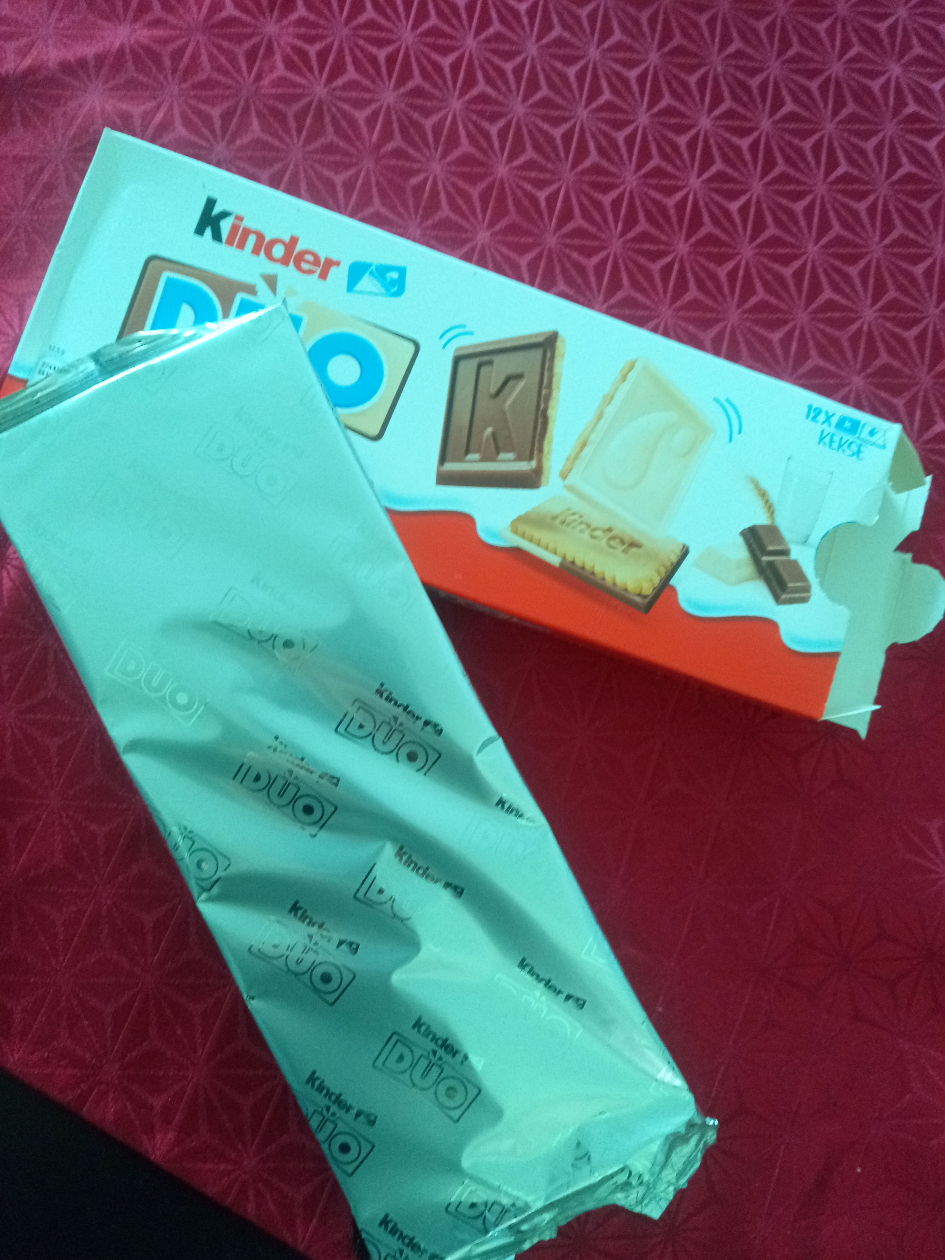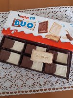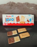 Kinder Duo der Marke Kinder Schoko trifft weiße Schokolade auf einen Keks ein Hochgenuss ideal zum Tee oder Kaffee oder in Milch getaucht einfach lecker. Der Keks ist schön knusprig leckere Schokolade in weiß und in braun... ideal auch zum Teilen