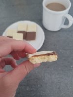 Grundsätzlich liebe ich die Kombination von Keks mit Schokolade, aber dann muss es auch süß schmecken. Zum Kaffee sind die Kekse okay, aber pur würde ich sie mir etwas Süßer wünschen.