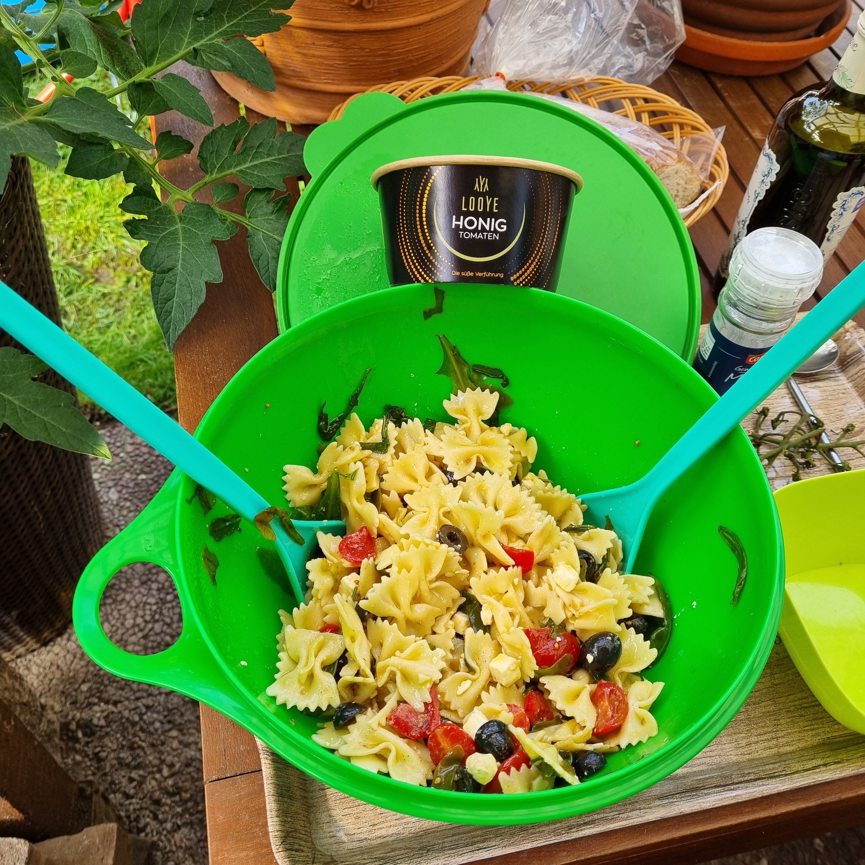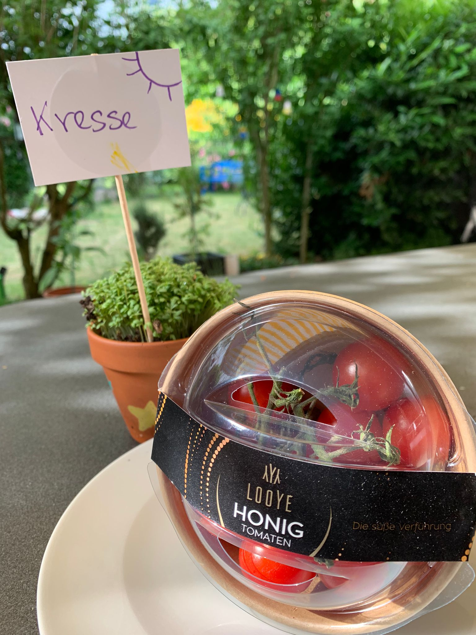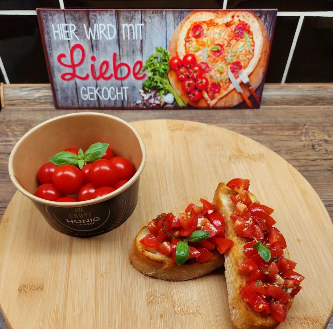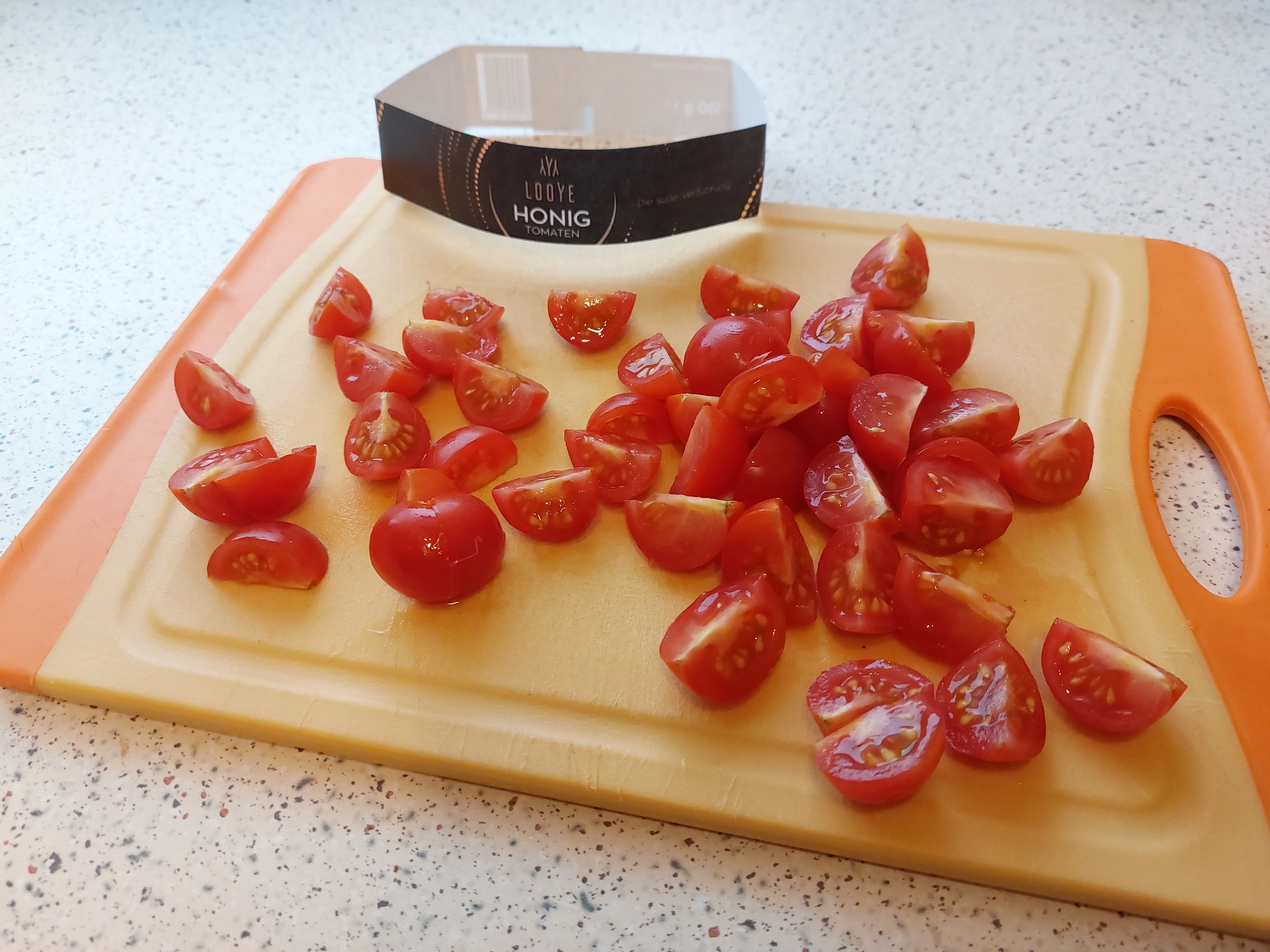 Die Looye Honigtomaten kamen gut verpackt und super frisch bei uns an, trotz der 37°. Verglichen mit den anderen Tomaten, die ich noch da hatte wirken die Looye Tomaten wie eine Farbexplosion. Ein richtig kräftiges rot, prall und knackig. Wir haben sie in die Vesperdose gepackt, auf den Salat verteilt und Bruschetta damit gemacht. Alles war sehr lecker. Als ich gerade noch am überlegen war, wer die zweite Packung bekommt, haben meine Kinder diese blitzschnell leer genascht.