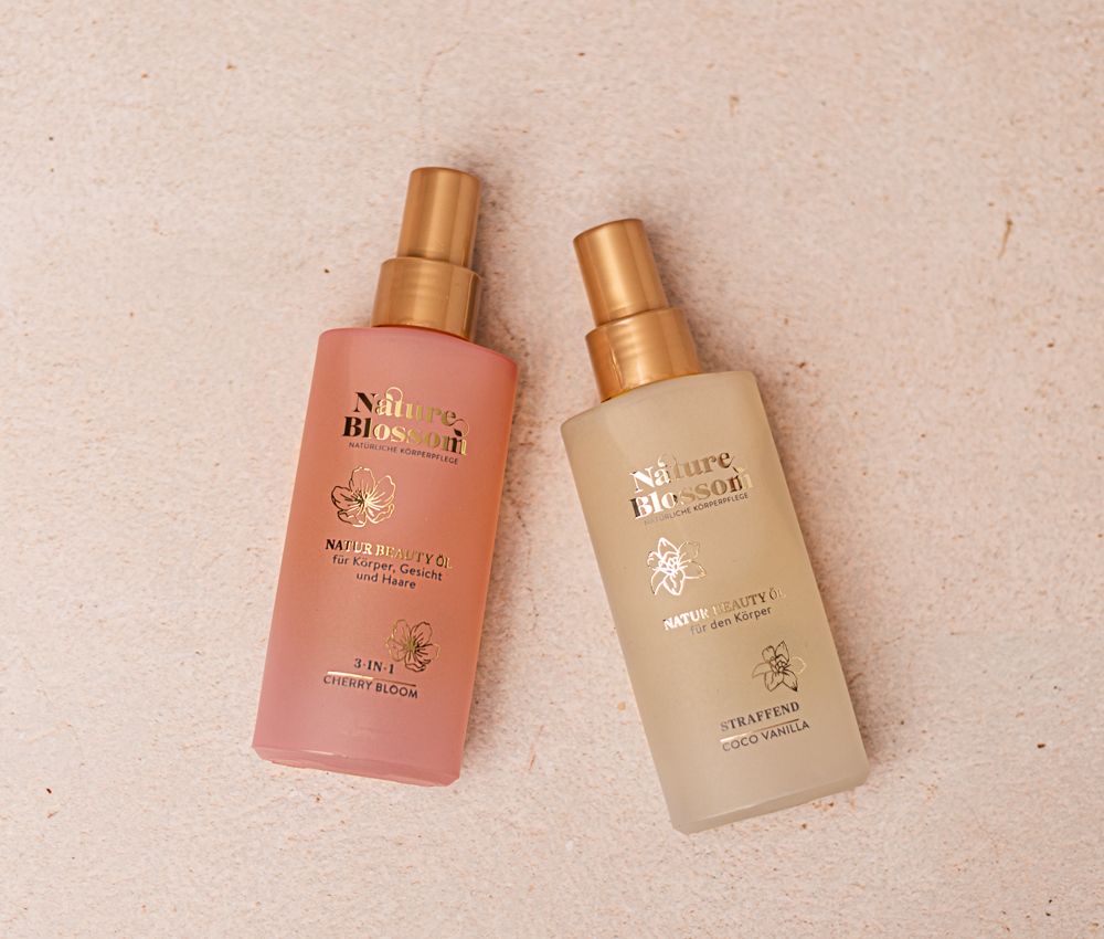 Erlebe den Zauber der Natur in verschiedenen Duftrichtungen. Passend zu den Bestsellerdüften von Nature Blossom sind ab sofort die Natur Beauty Öle Coco Vanilla und Cherry Bloom erhältlich. Auf Trockenölbasis und ebenfalls naturzertifiziert runden die Öle das perfekte Beauty Erlebnis ab.