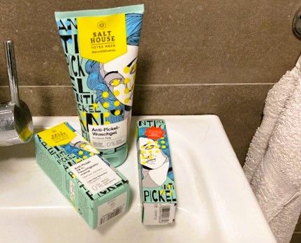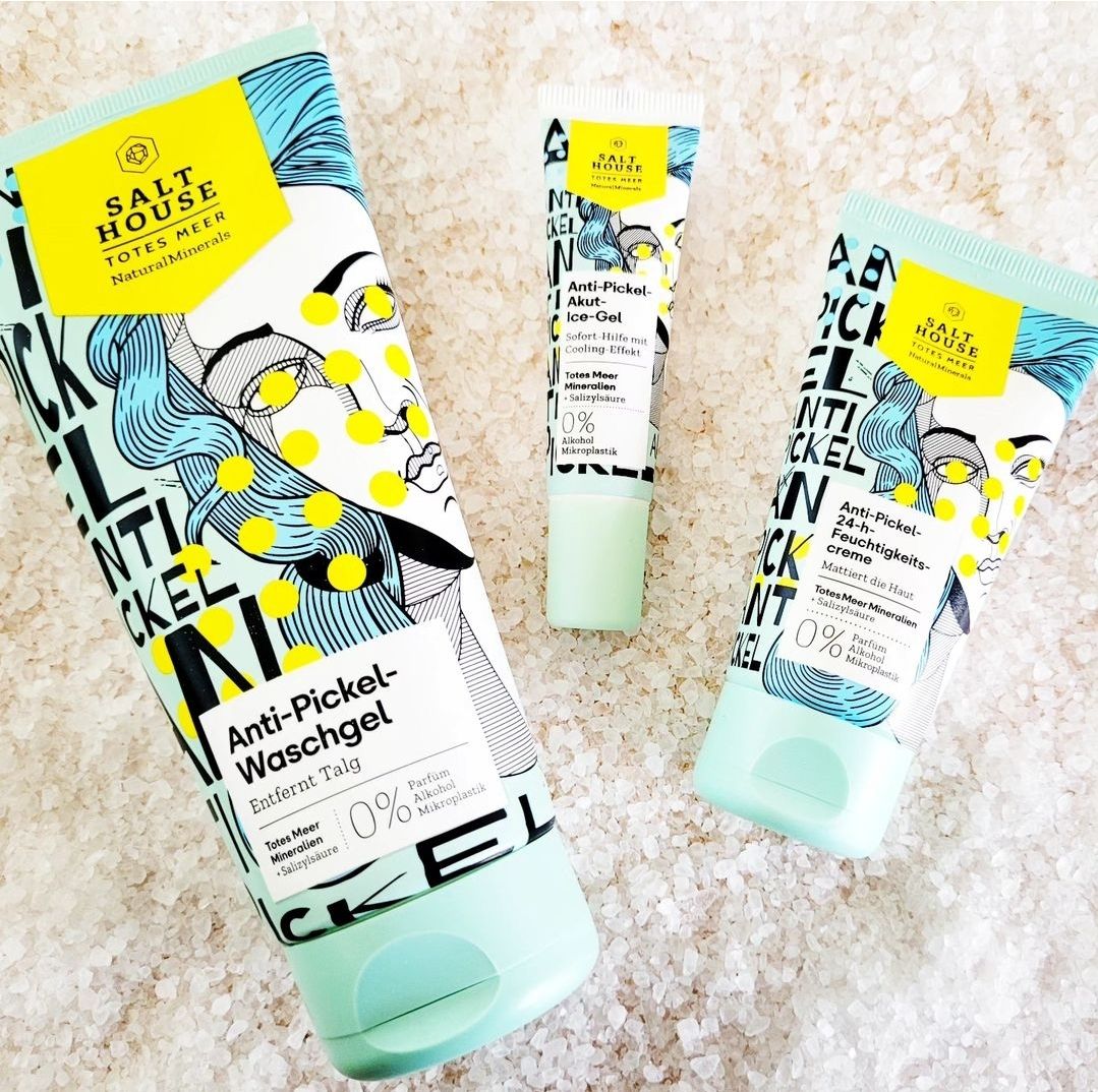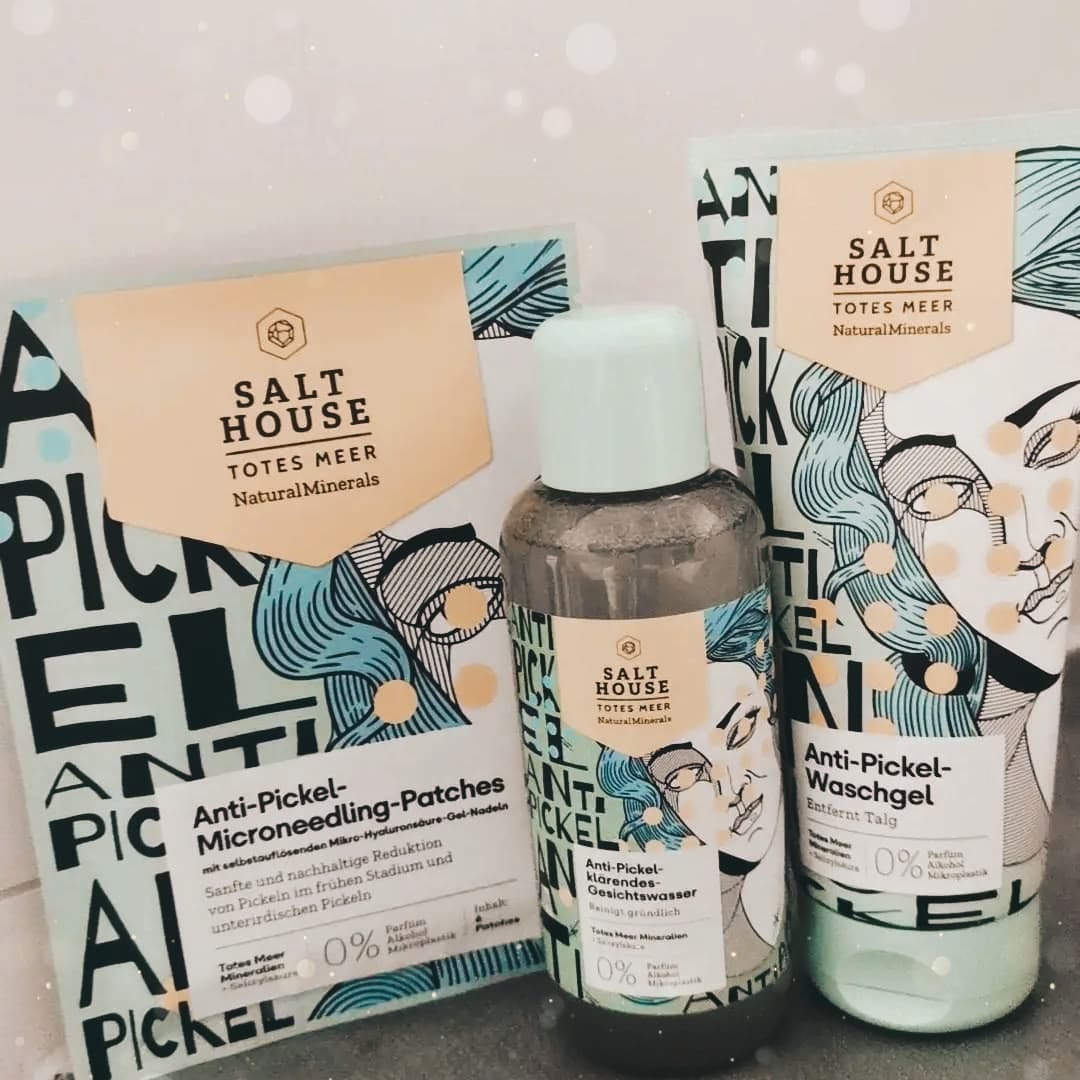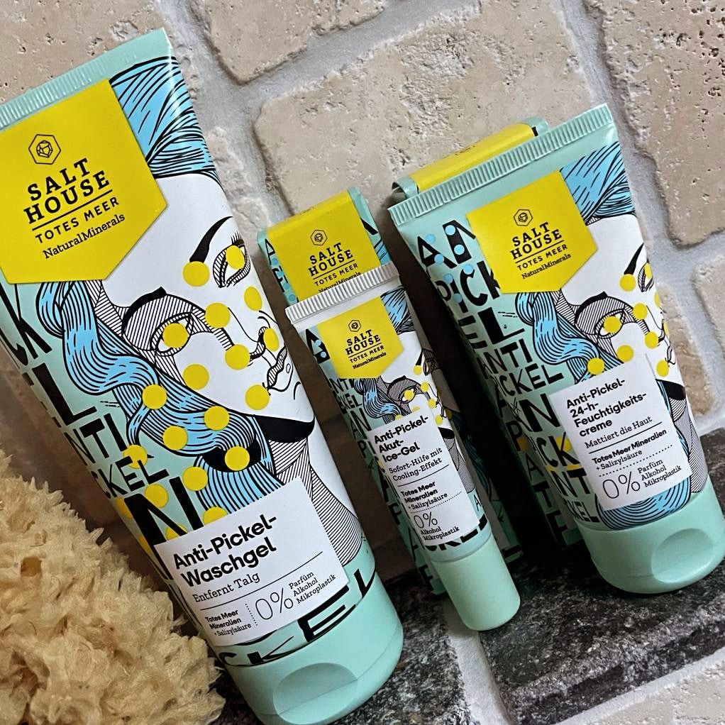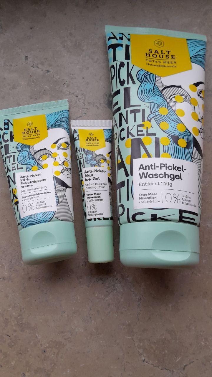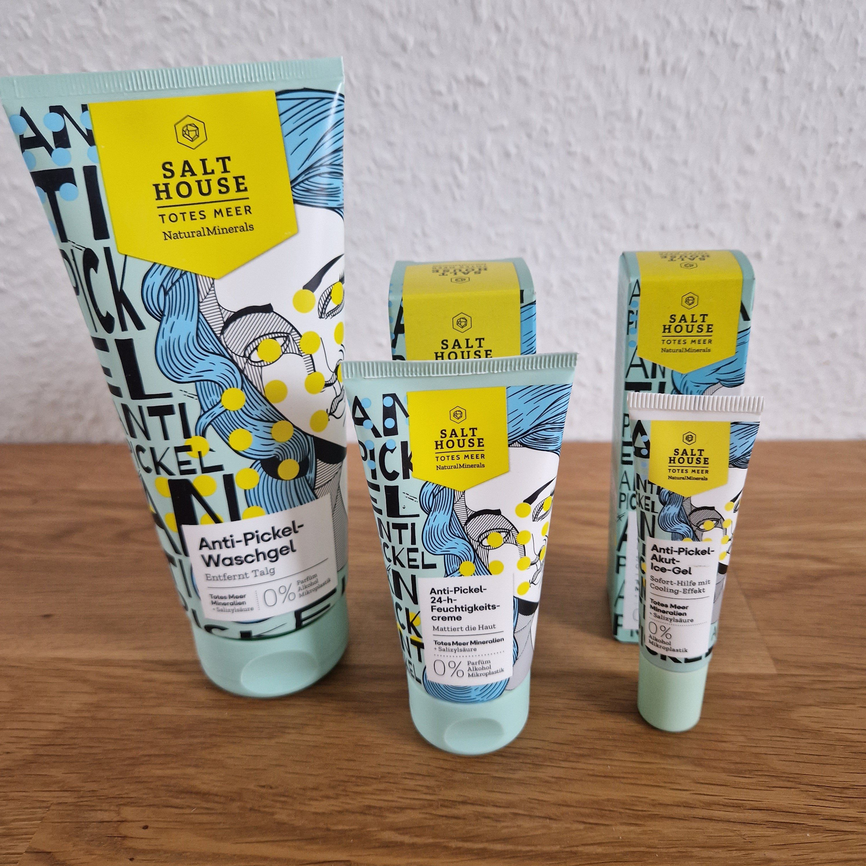 Ich bin begeistert von der salthouse pflegeroutine. Das Waschgel ist in einer tollen große verpackt und verhindert ganz gut das neu entstehen von weiteren Pickeln. Es reinigt die Haut fast gut, allerdings ist es nicht unbedingt für Mitesser geeignet. Die Creme ist leider nicht so toll. Sie ist leider in Phasen geteilt und riecht sehr abgestanden. Da weiß uch leider nicht was los ist. Die antipickel schnelle Hilfe kleine Tube ist super. Sie hält neue Pickel in Schach und trocknet sie gut weg. Toll