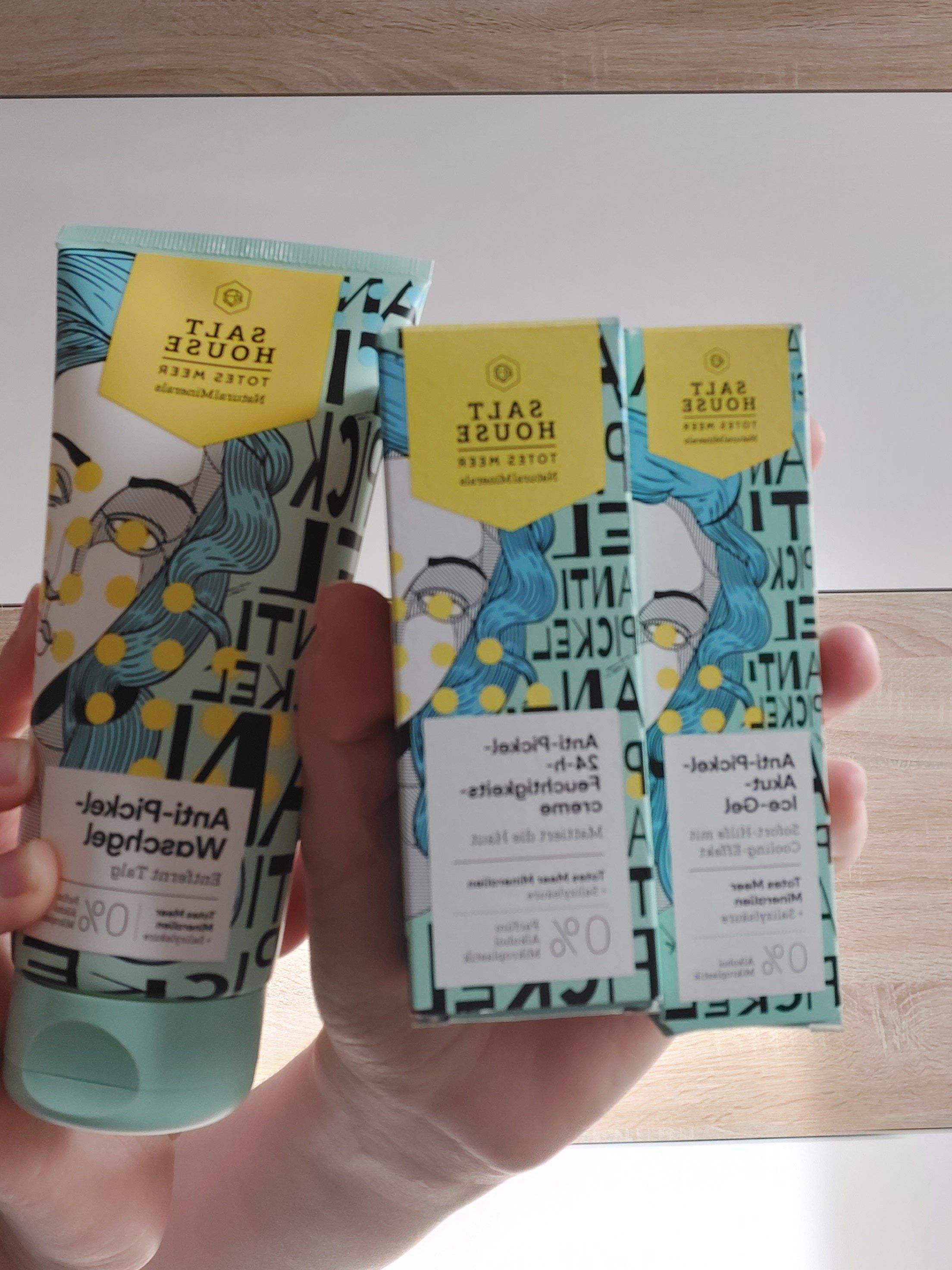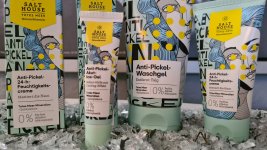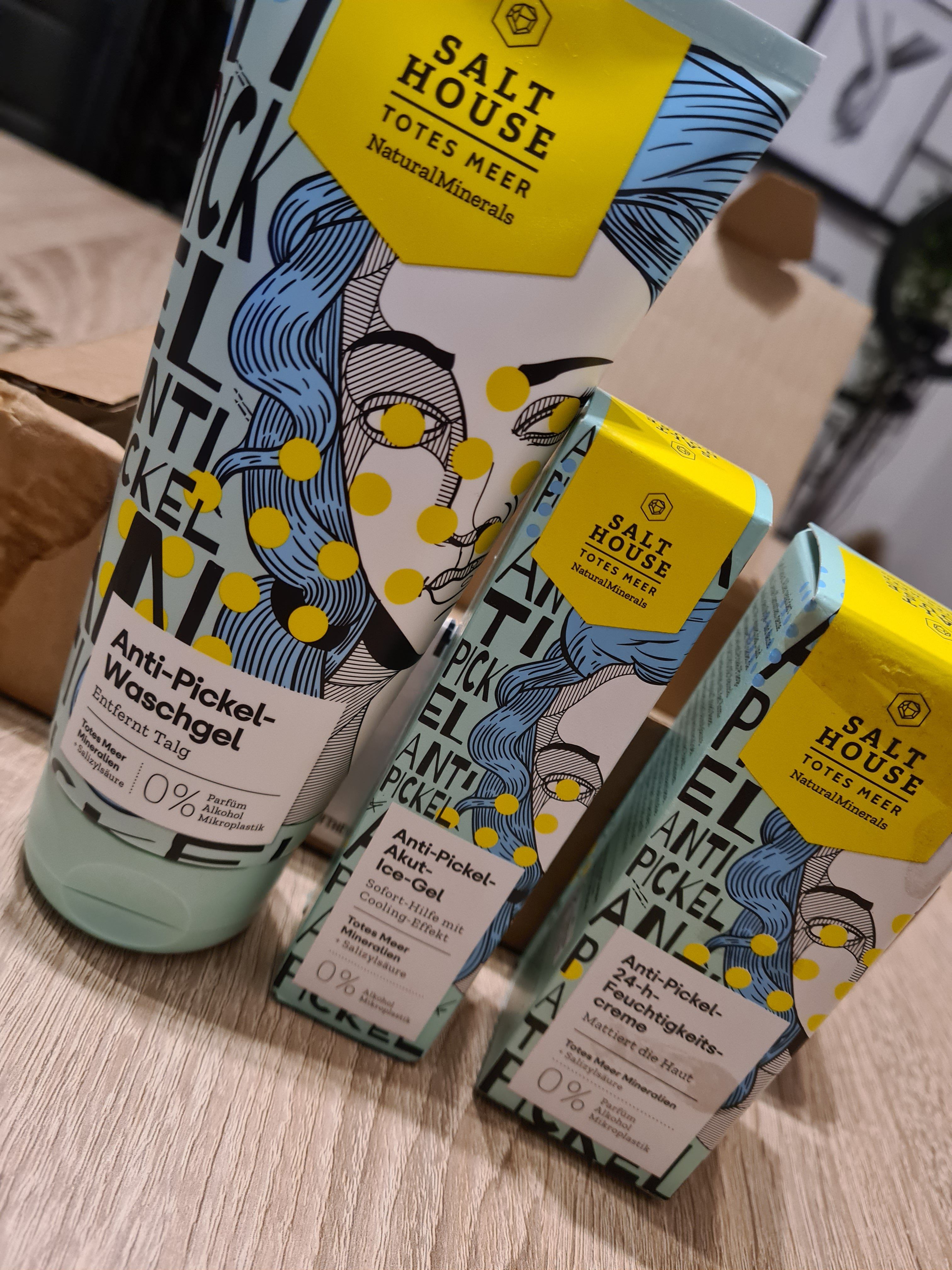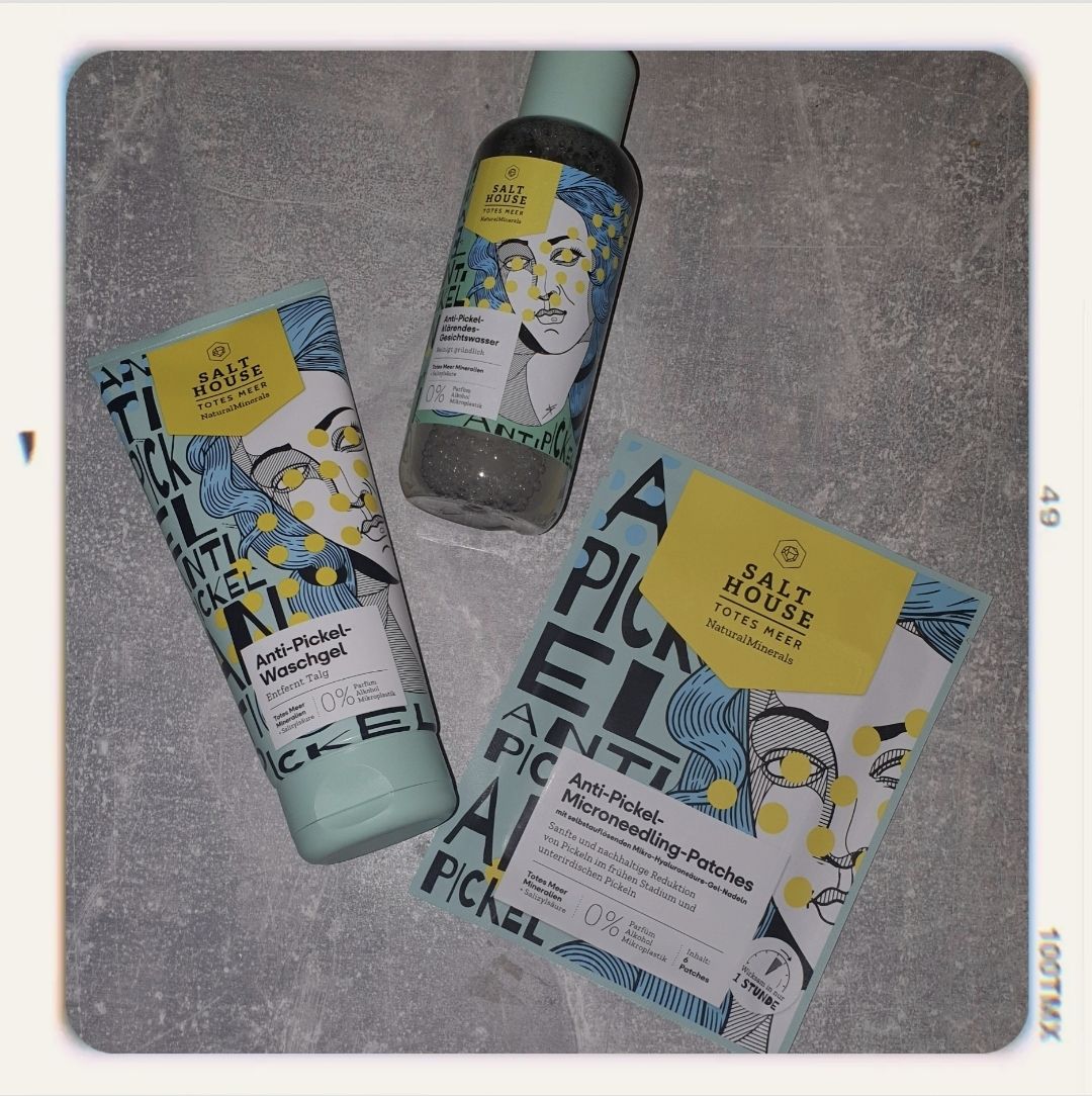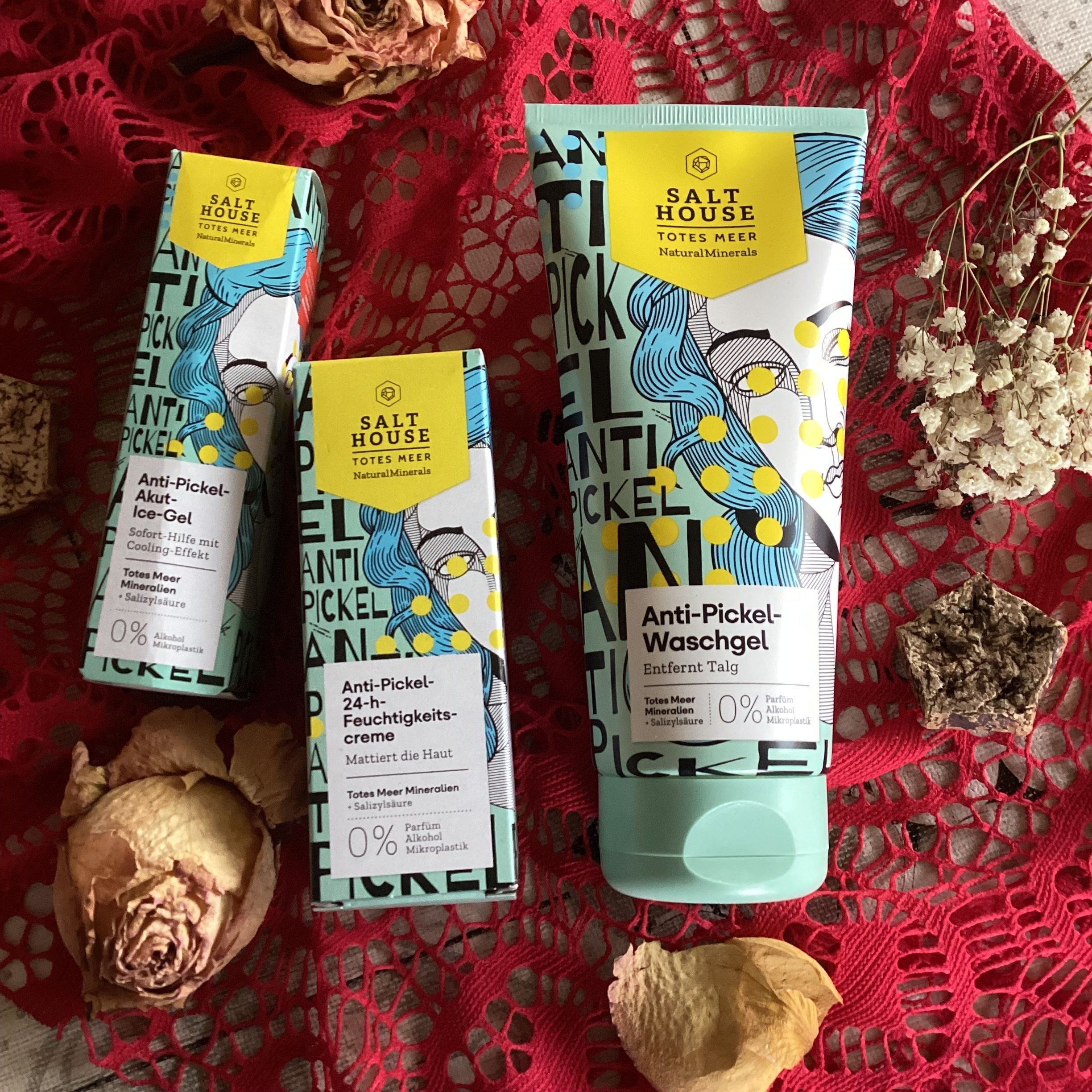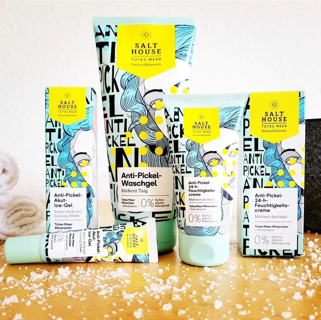 Ich bin begeistert von der salthouse pflegeroutine. Das Waschgel ist in einer tollen große verpackt und verhindert ganz gut das neu entstehen von weiteren Pickeln. Es reinigt die Haut fast gut, allerdings ist es nicht unbedingt für Mitesser geeignet. Die Creme ist leider nicht so toll. Sie ist leider in Phasen geteilt und riecht sehr abgestanden. Da weiß uch leider nicht was los ist. Die antipickel schnelle Hilfe kleine Tube ist super. Sie hält neue Pickel in Schach und trocknet sie gut weg. Toll
