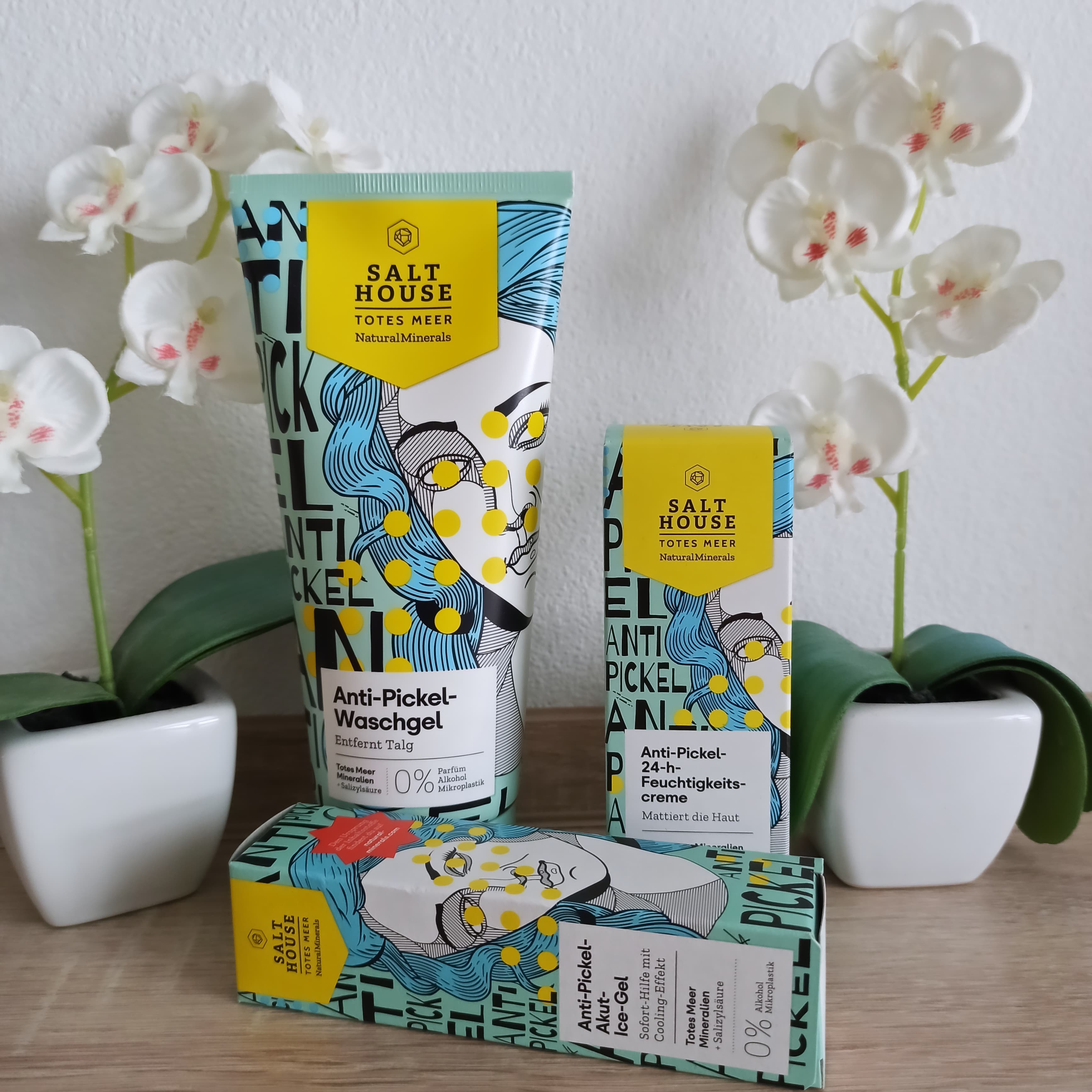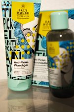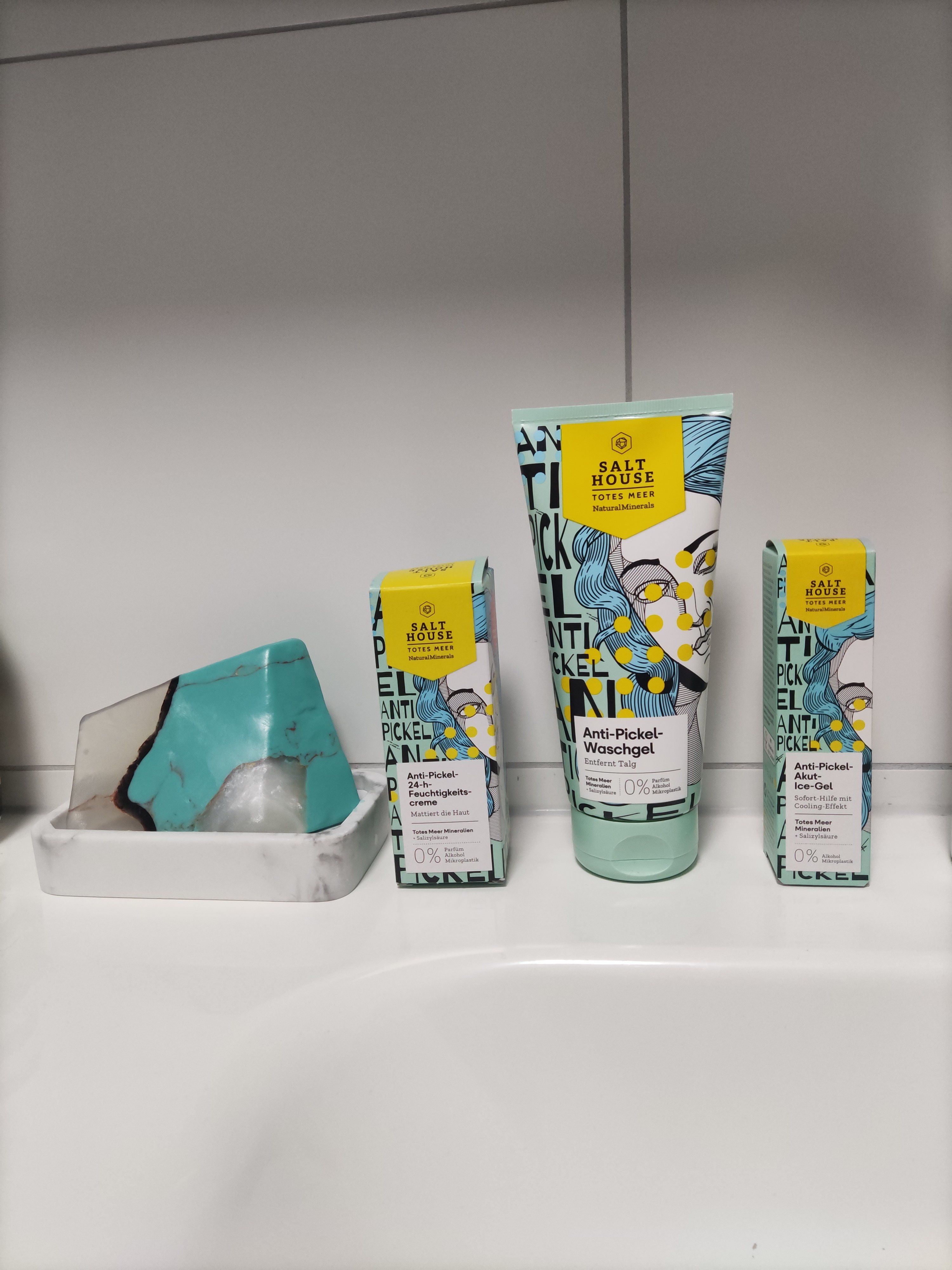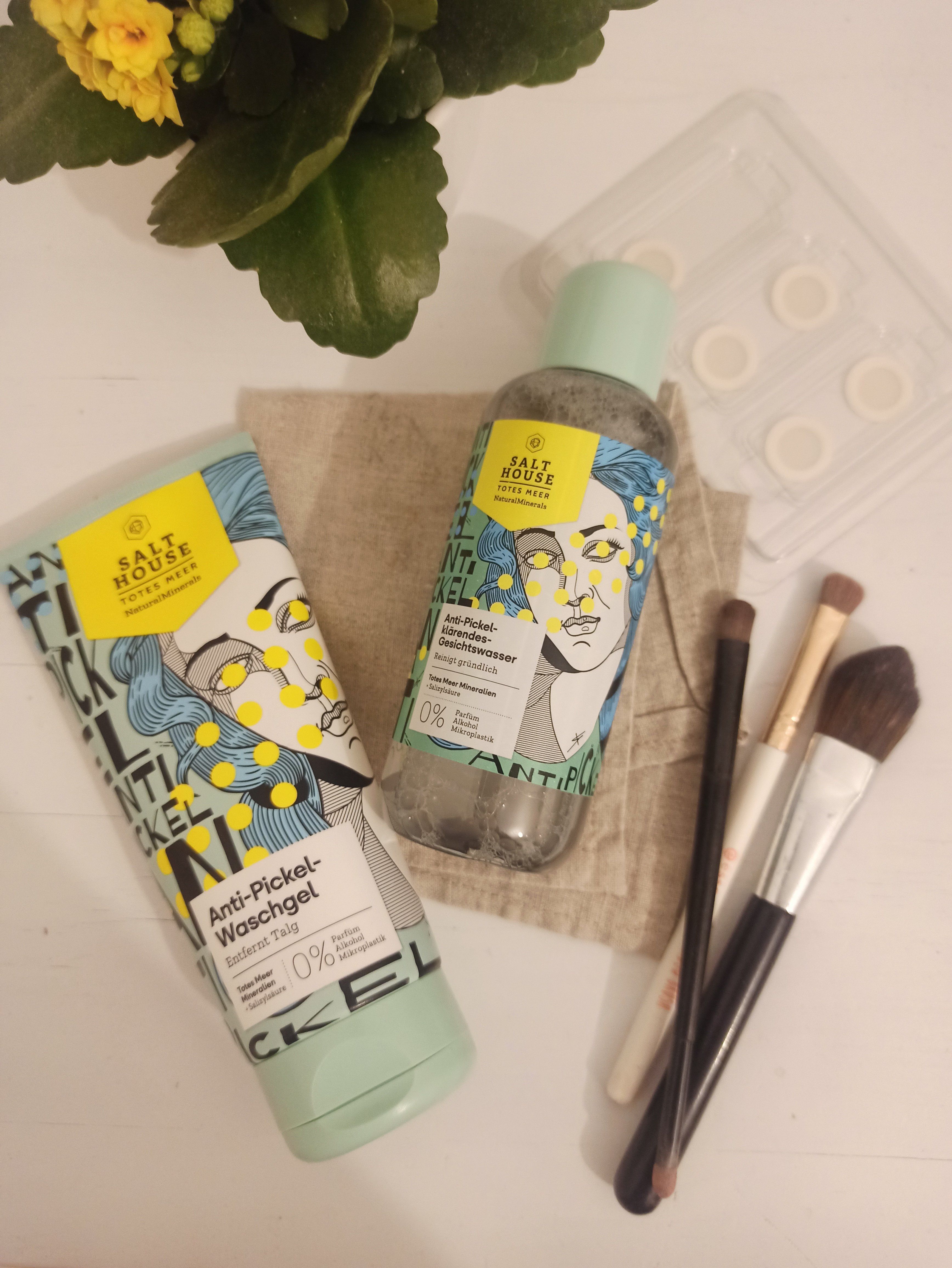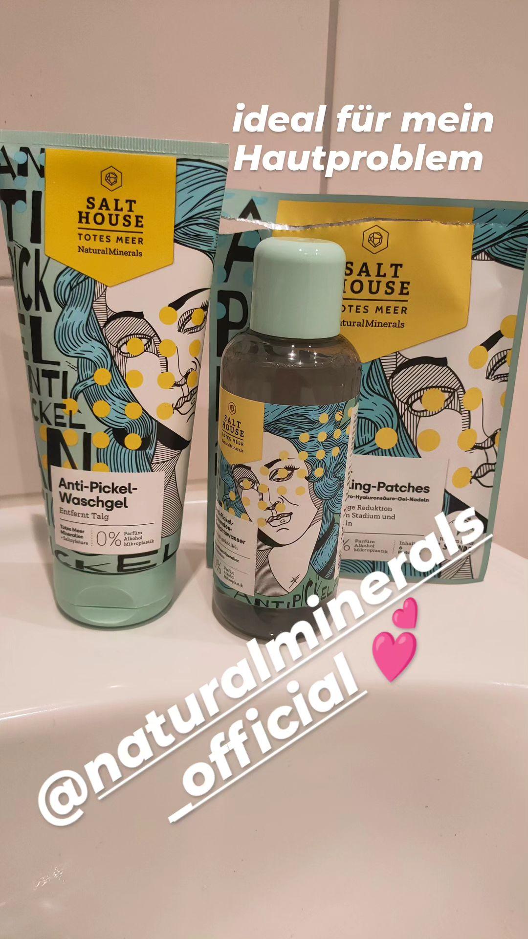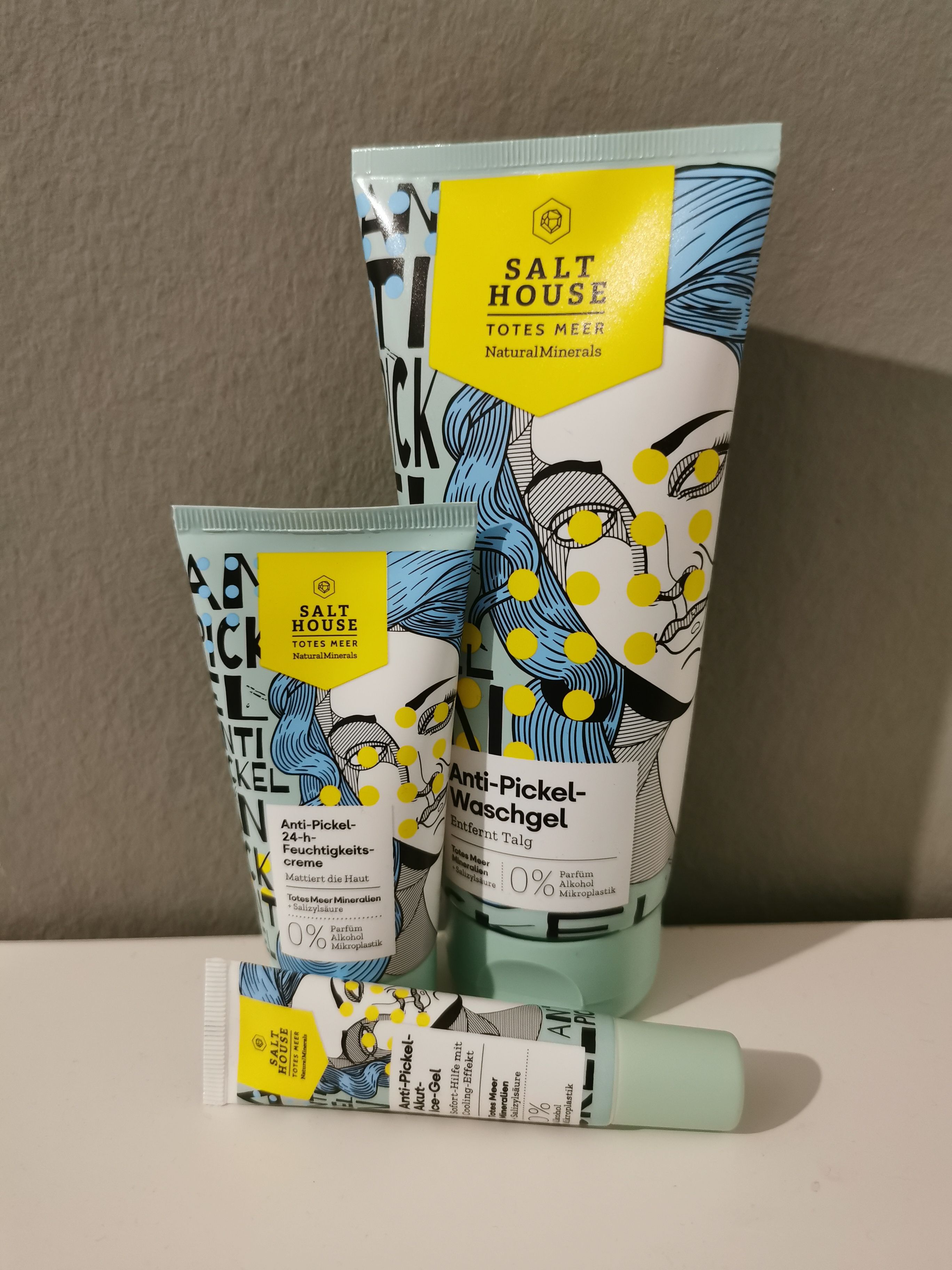 Ich bin begeistert von der salthouse pflegeroutine. Das Waschgel ist in einer tollen große verpackt und verhindert ganz gut das neu entstehen von weiteren Pickeln. Es reinigt die Haut fast gut, allerdings ist es nicht unbedingt für Mitesser geeignet. Die Creme ist leider nicht so toll. Sie ist leider in Phasen geteilt und riecht sehr abgestanden. Da weiß uch leider nicht was los ist. Die antipickel schnelle Hilfe kleine Tube ist super. Sie hält neue Pickel in Schach und trocknet sie gut weg. Toll
