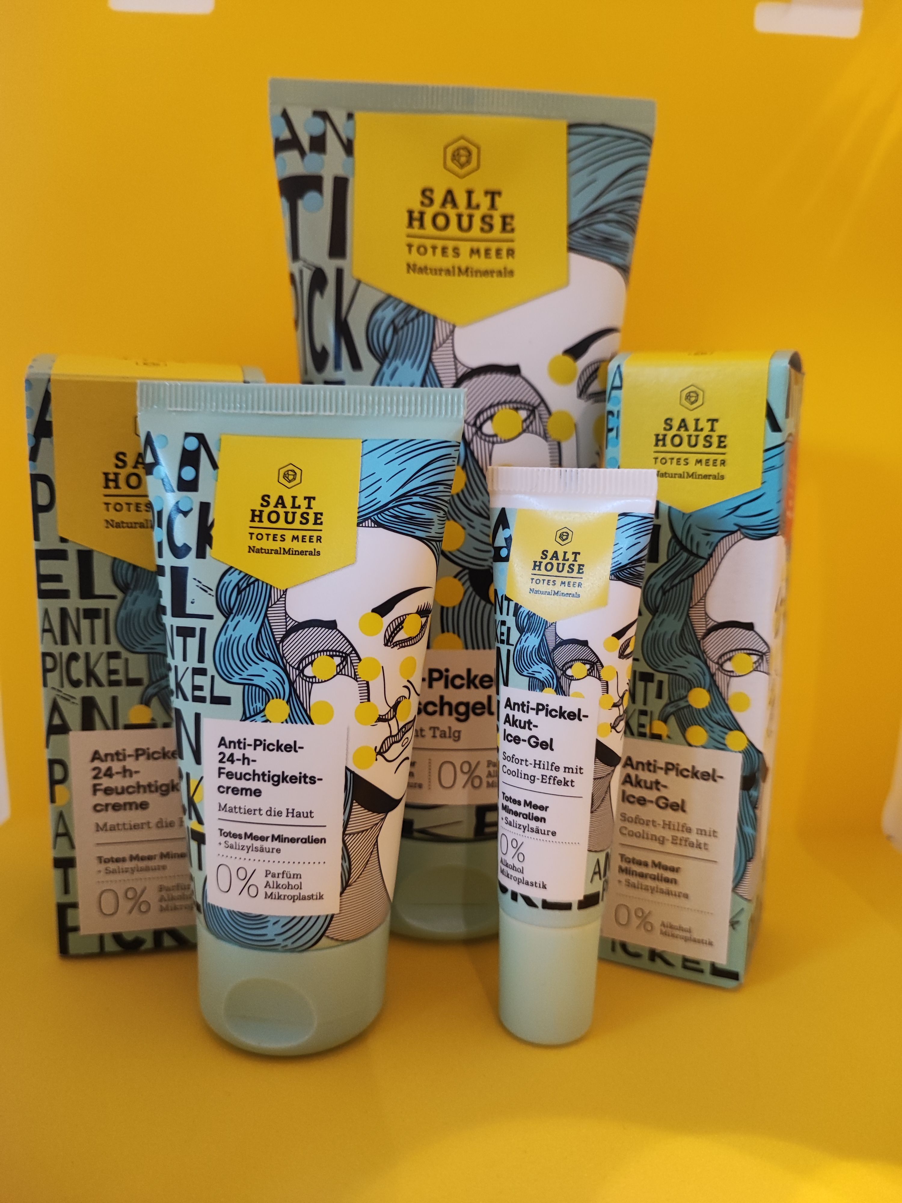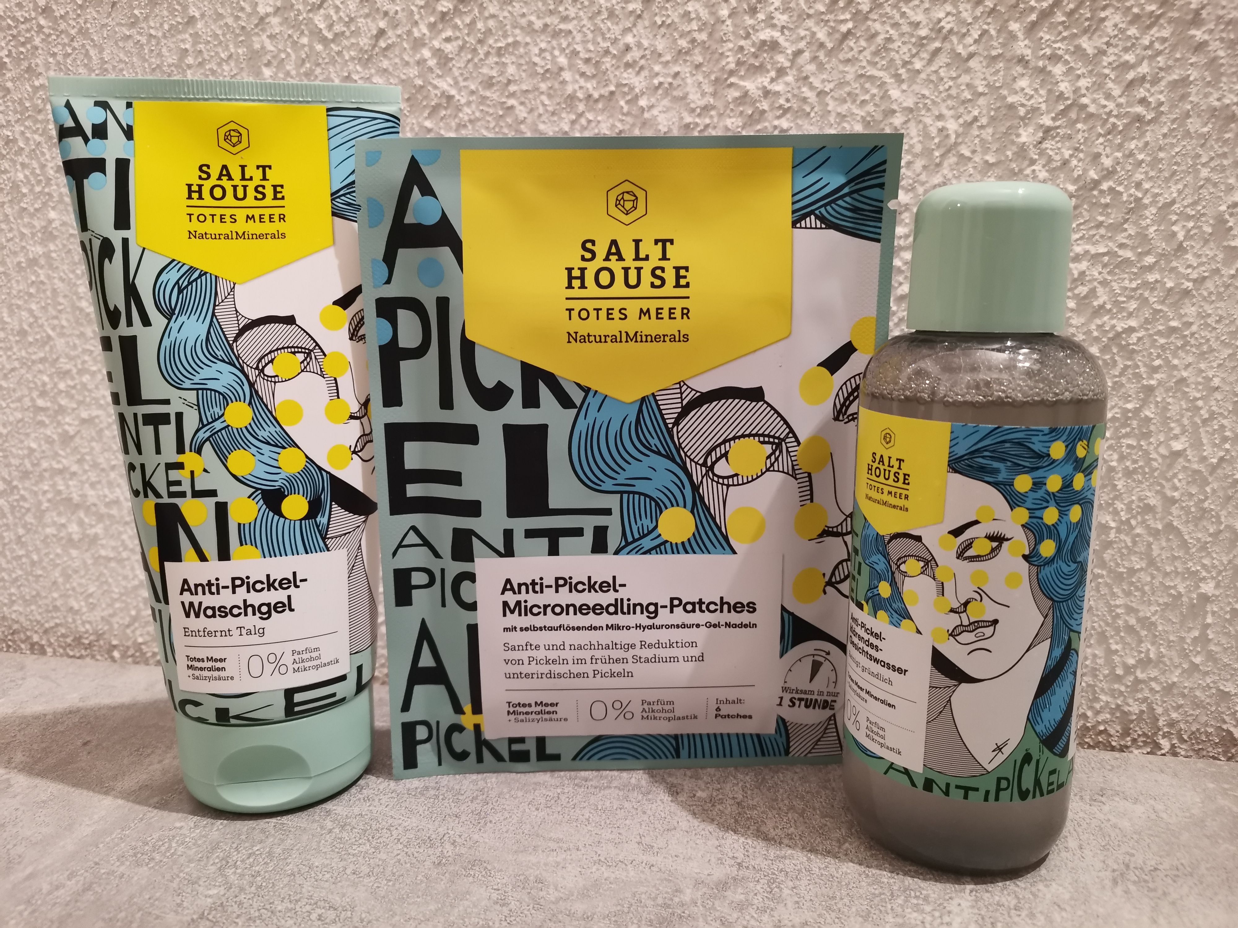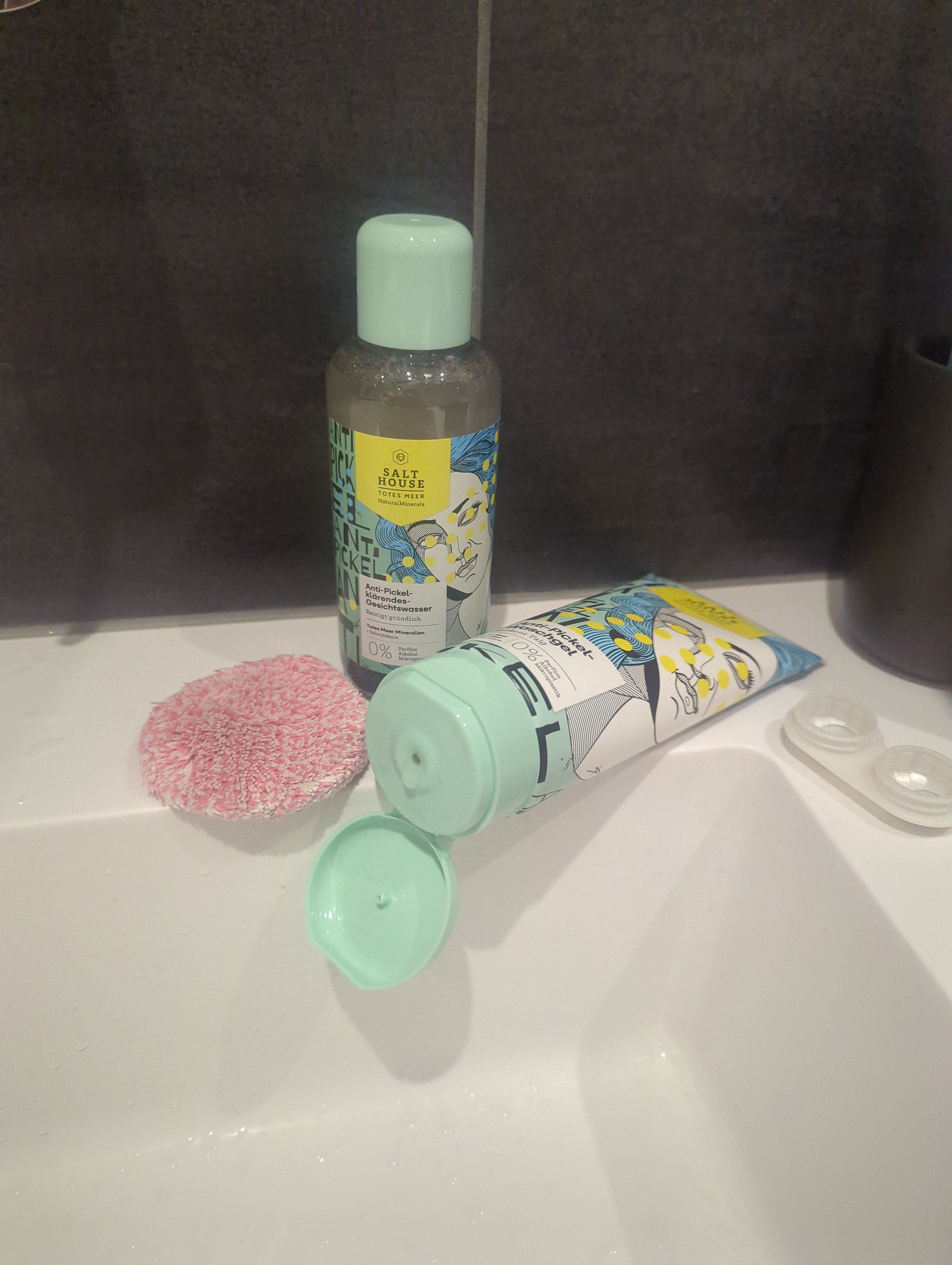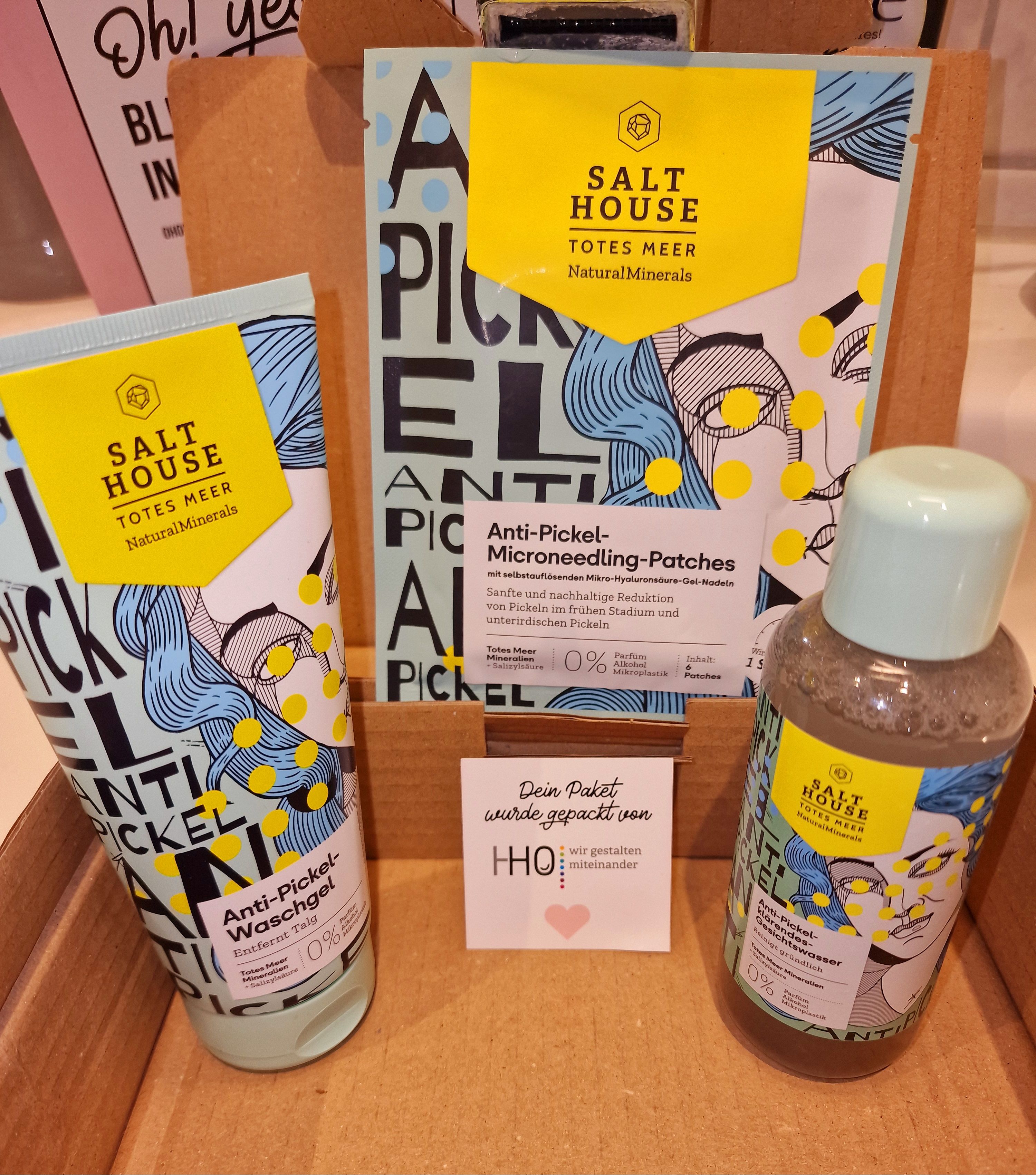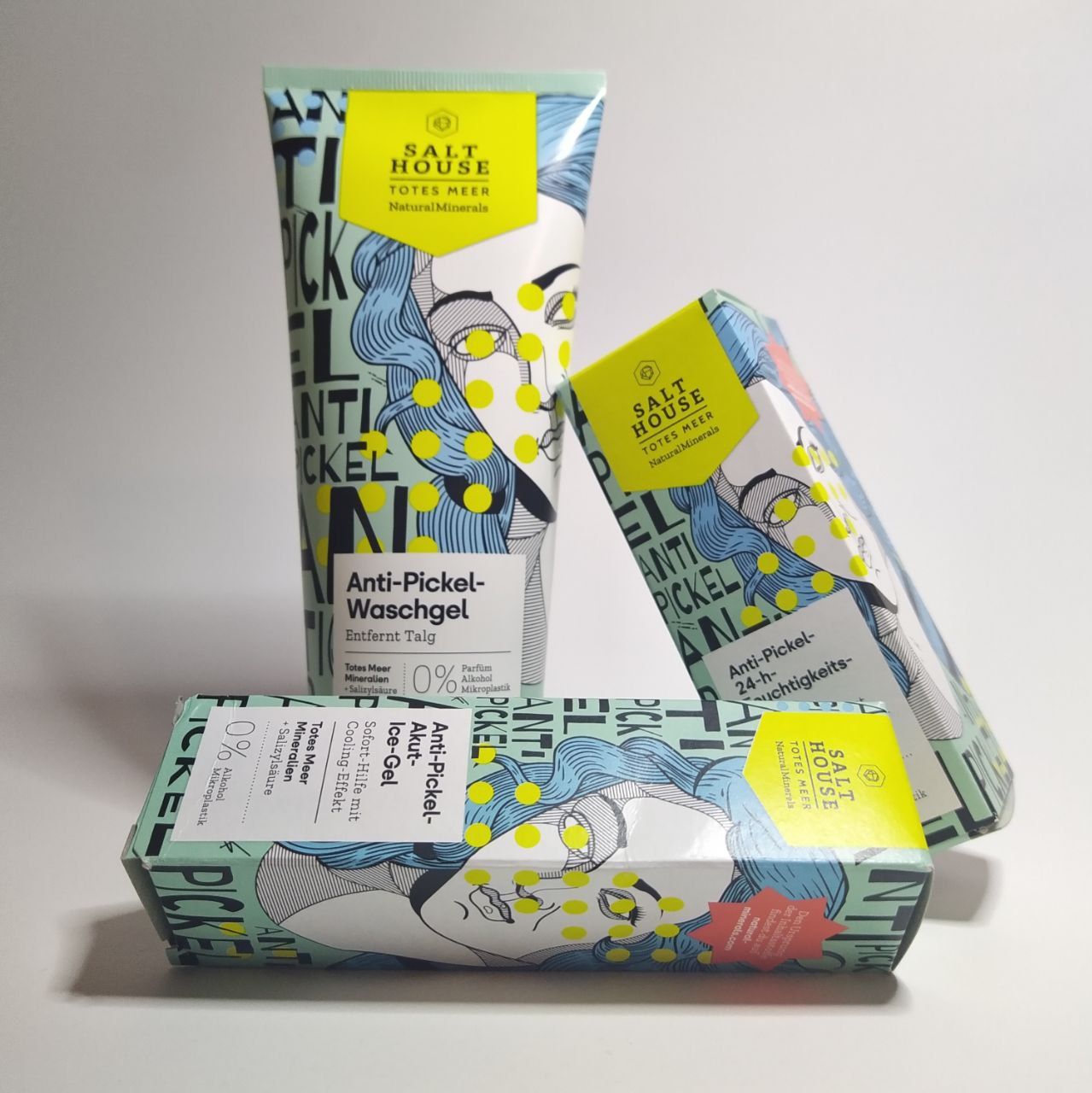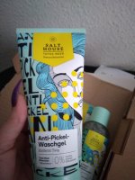Ich bin begeistert von der salthouse pflegeroutine. Das Waschgel ist in einer tollen große verpackt und verhindert ganz gut das neu entstehen von weiteren Pickeln. Es reinigt die Haut fast gut, allerdings ist es nicht unbedingt für Mitesser geeignet. Die Creme ist leider nicht so toll. Sie ist leider in Phasen geteilt und riecht sehr abgestanden. Da weiß uch leider nicht was los ist. Die antipickel schnelle Hilfe kleine Tube ist super. Sie hält neue Pickel in Schach und trocknet sie gut weg. Toll