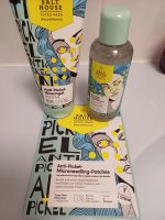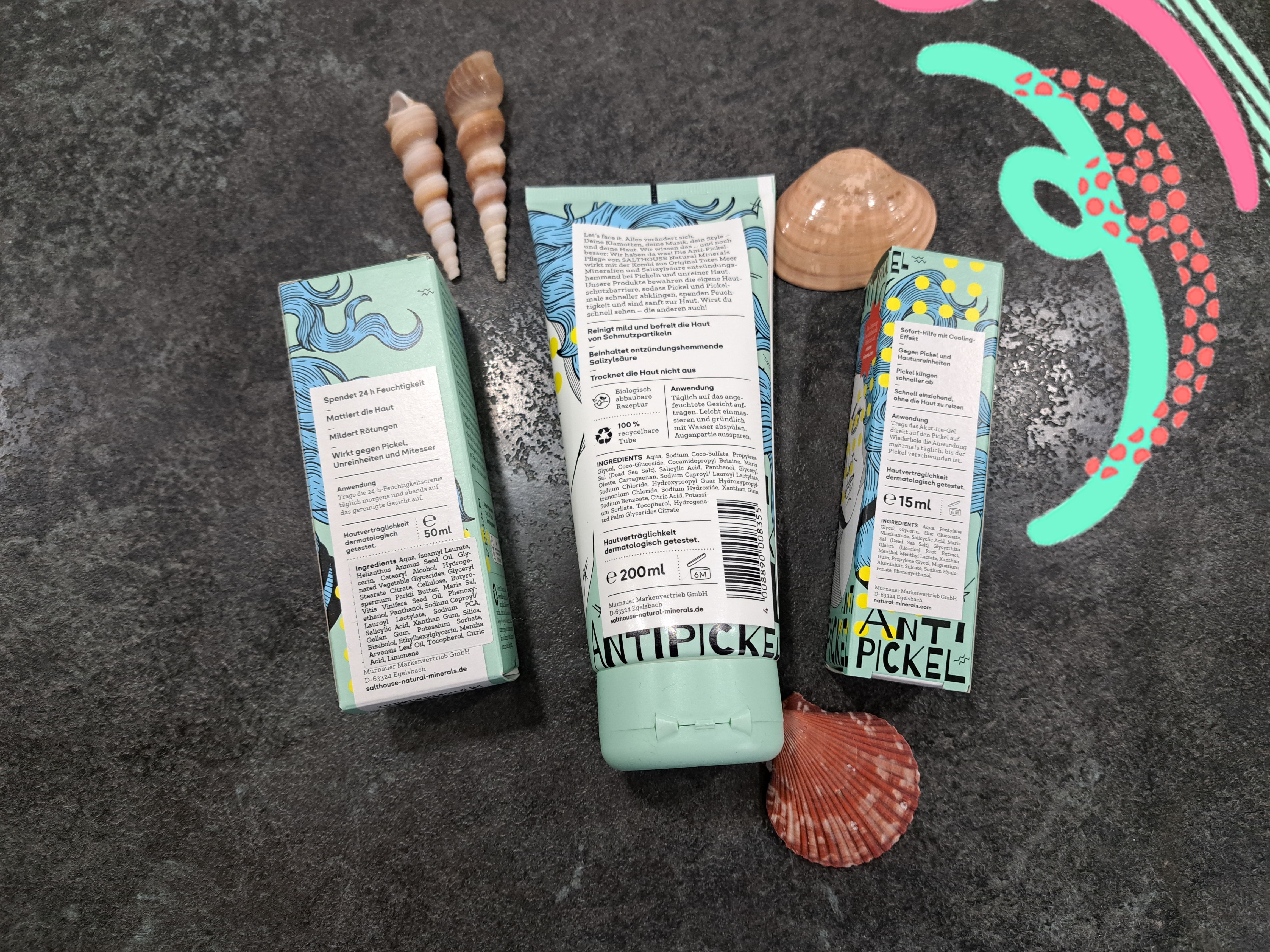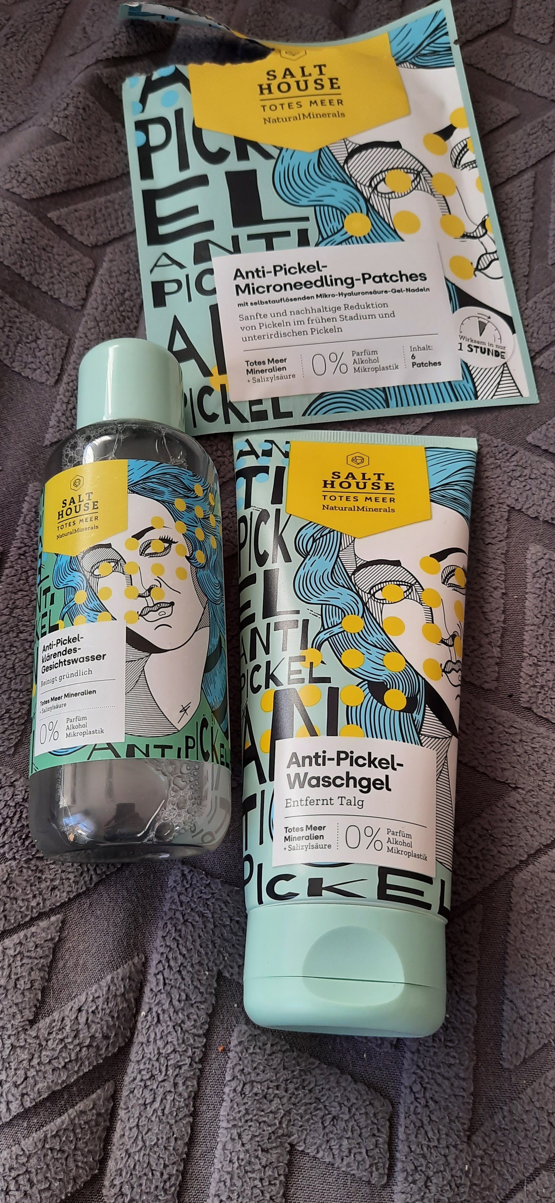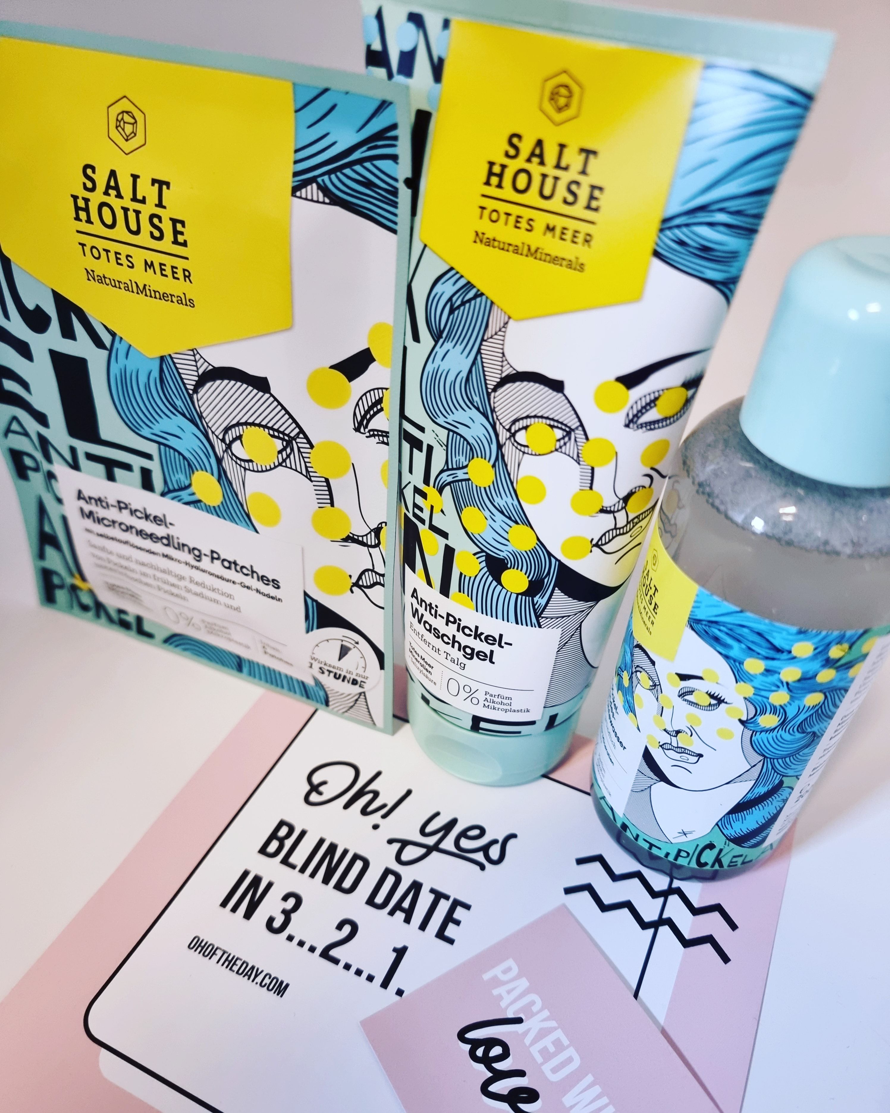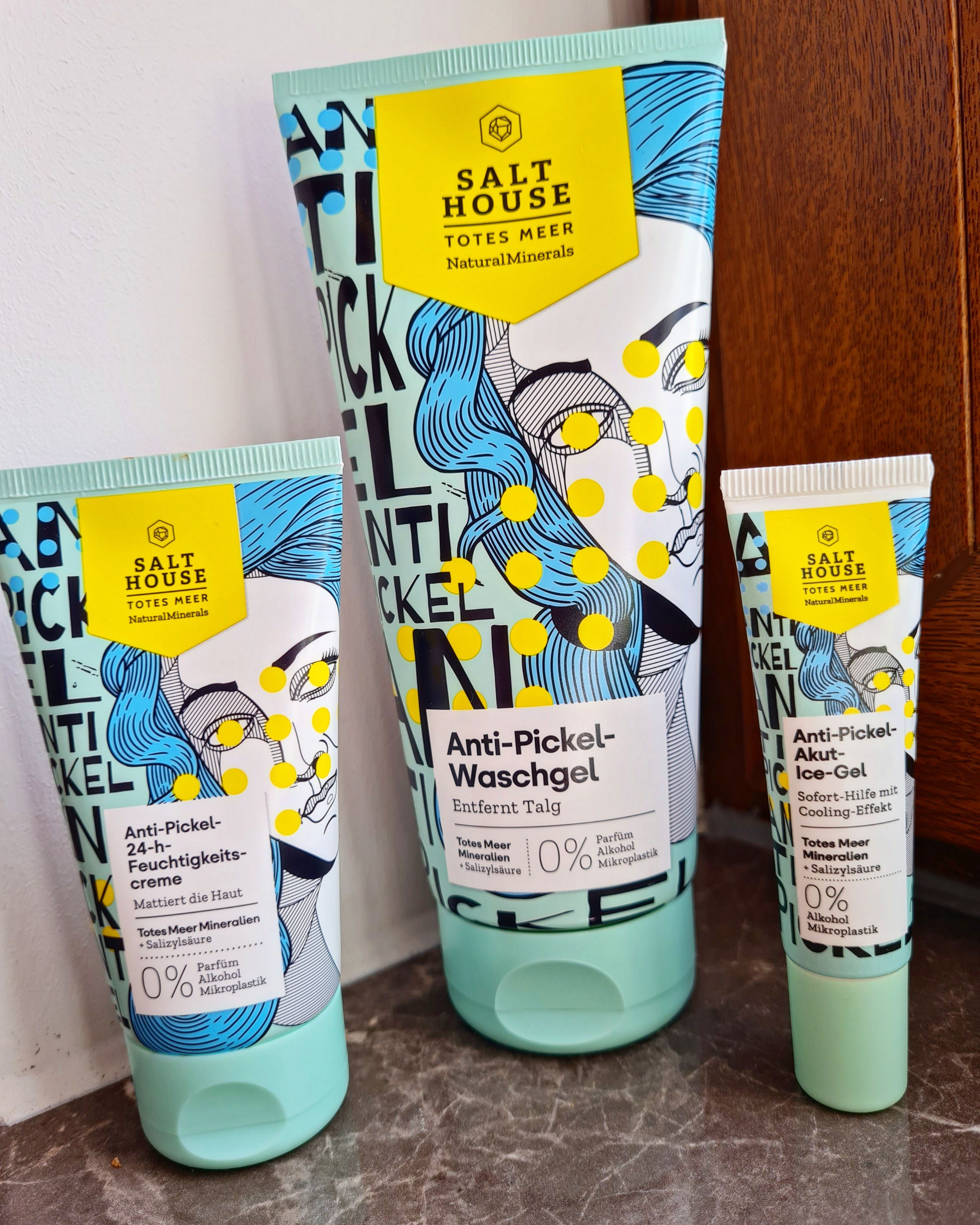 Ich bin begeistert von der salthouse pflegeroutine. Das Waschgel ist in einer tollen große verpackt und verhindert ganz gut das neu entstehen von weiteren Pickeln. Es reinigt die Haut fast gut, allerdings ist es nicht unbedingt für Mitesser geeignet. Die Creme ist leider nicht so toll. Sie ist leider in Phasen geteilt und riecht sehr abgestanden. Da weiß uch leider nicht was los ist. Die antipickel schnelle Hilfe kleine Tube ist super. Sie hält neue Pickel in Schach und trocknet sie gut weg. Toll