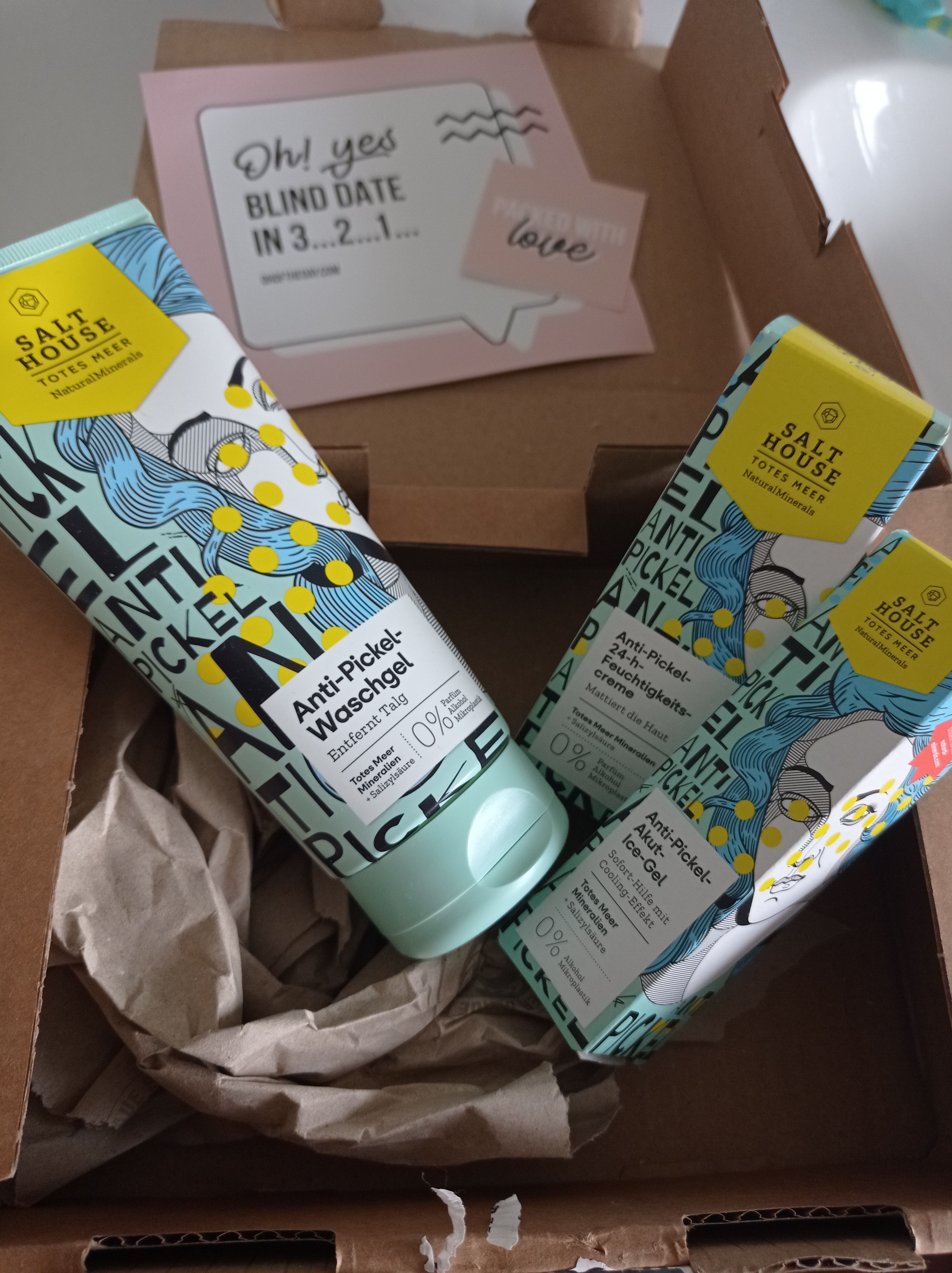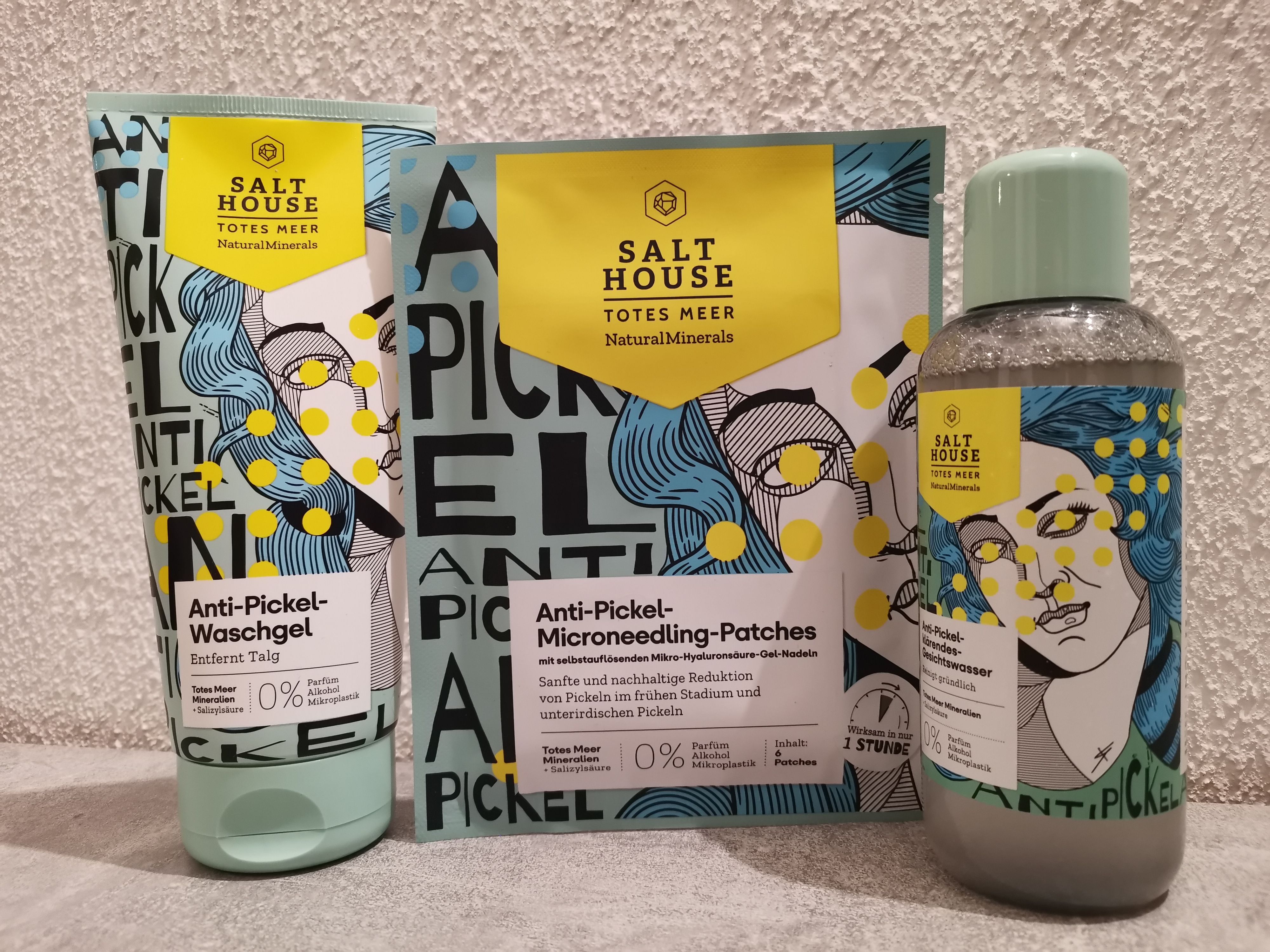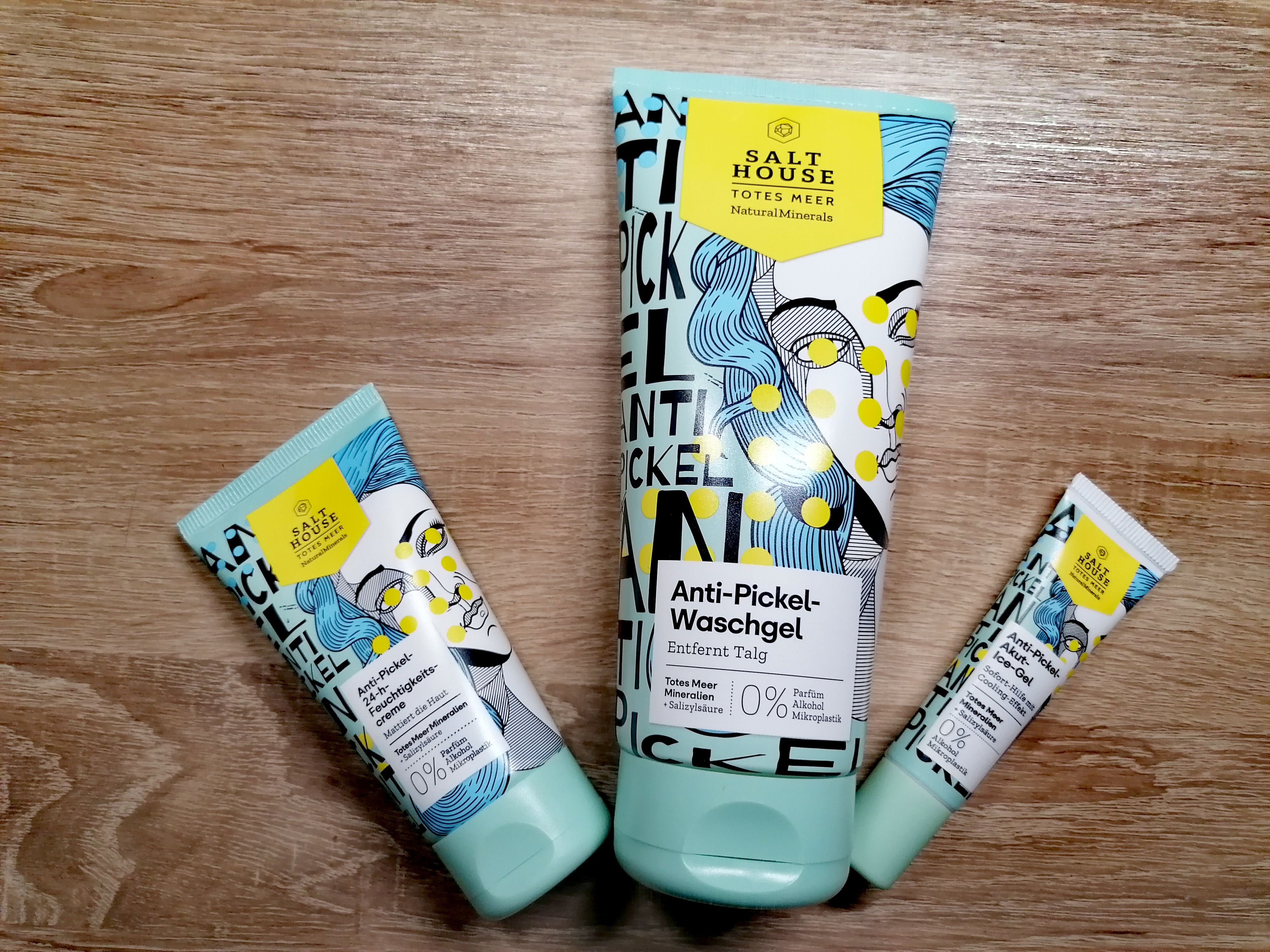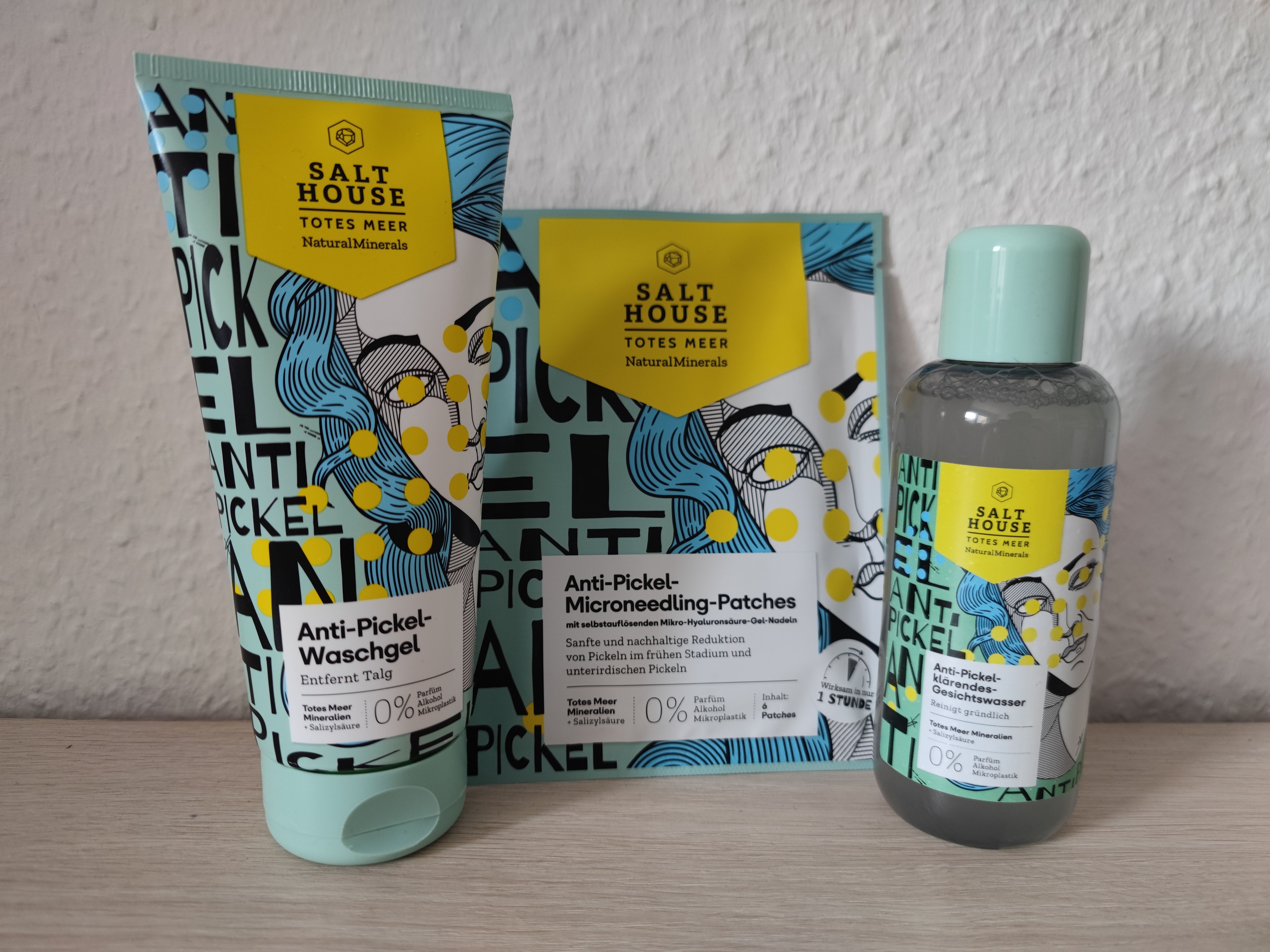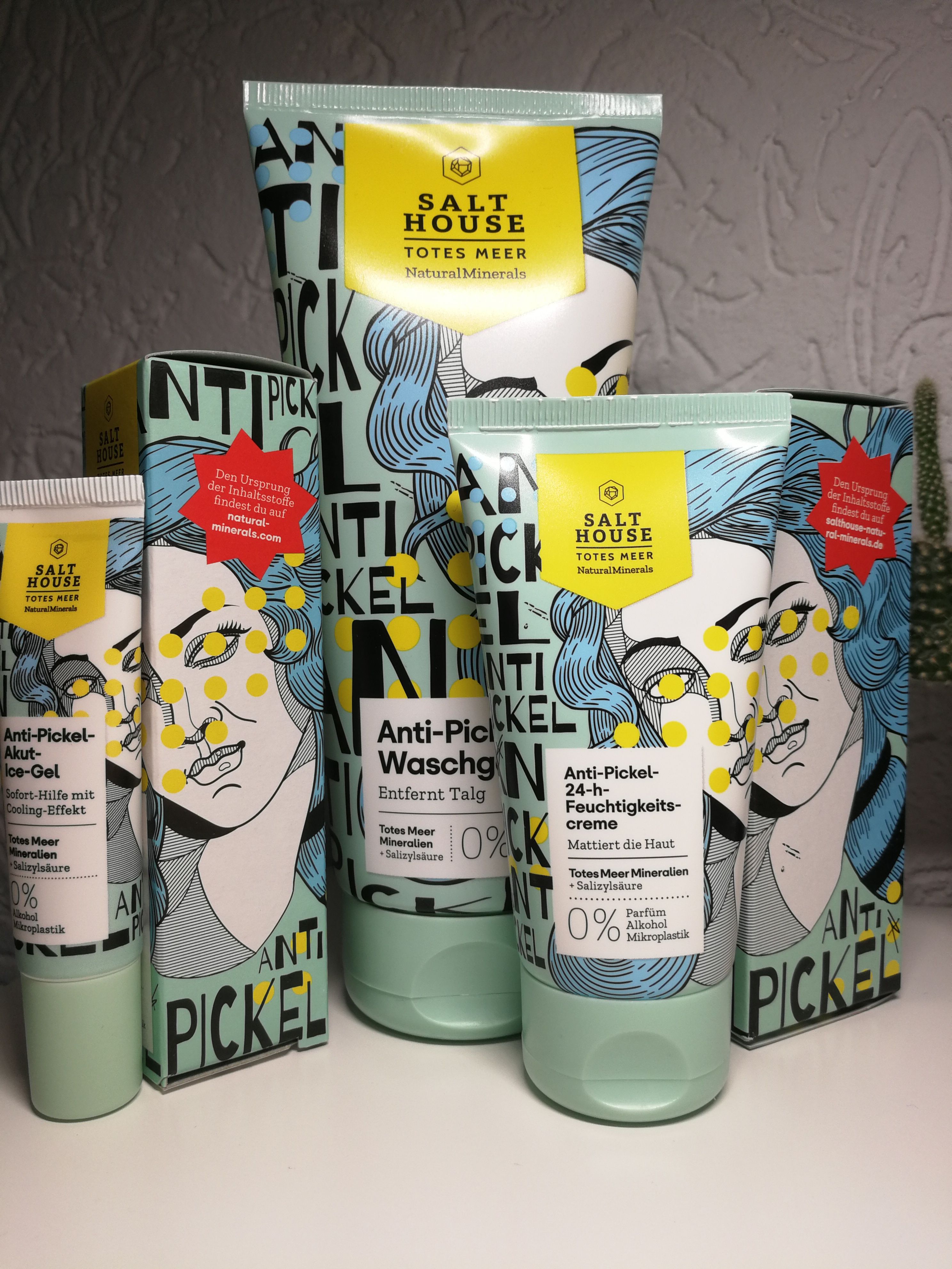 Ich bin begeistert von der salthouse pflegeroutine. Das Waschgel ist in einer tollen große verpackt und verhindert ganz gut das neu entstehen von weiteren Pickeln. Es reinigt die Haut fast gut, allerdings ist es nicht unbedingt für Mitesser geeignet. Die Creme ist leider nicht so toll. Sie ist leider in Phasen geteilt und riecht sehr abgestanden. Da weiß uch leider nicht was los ist. Die antipickel schnelle Hilfe kleine Tube ist super. Sie hält neue Pickel in Schach und trocknet sie gut weg. Toll