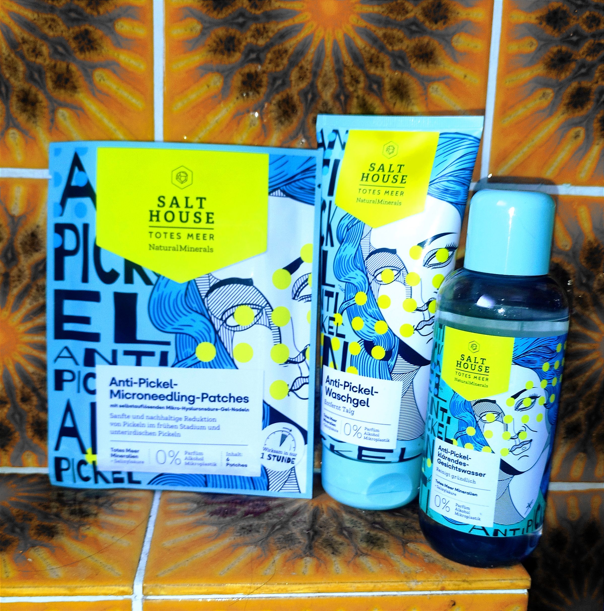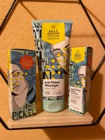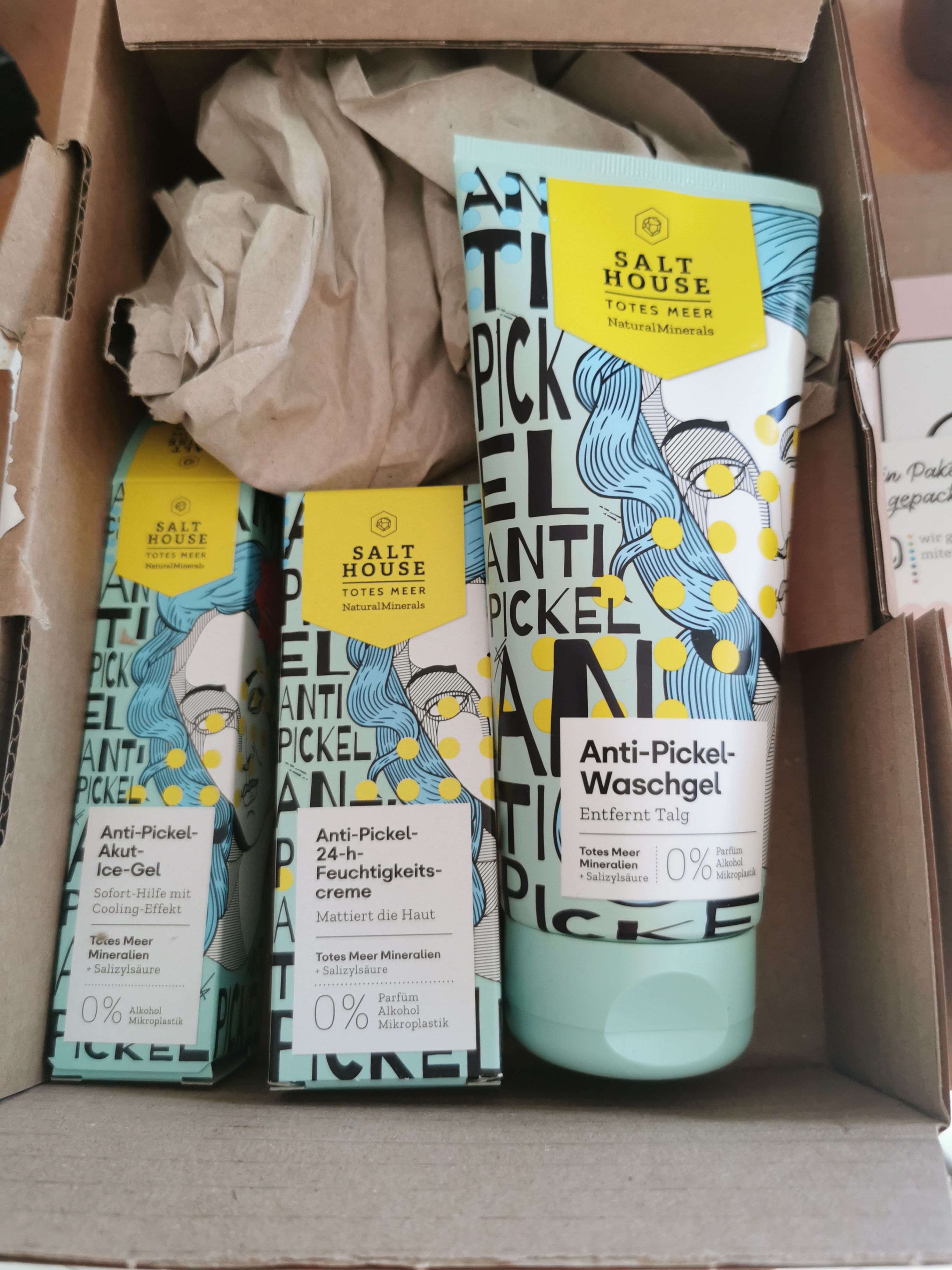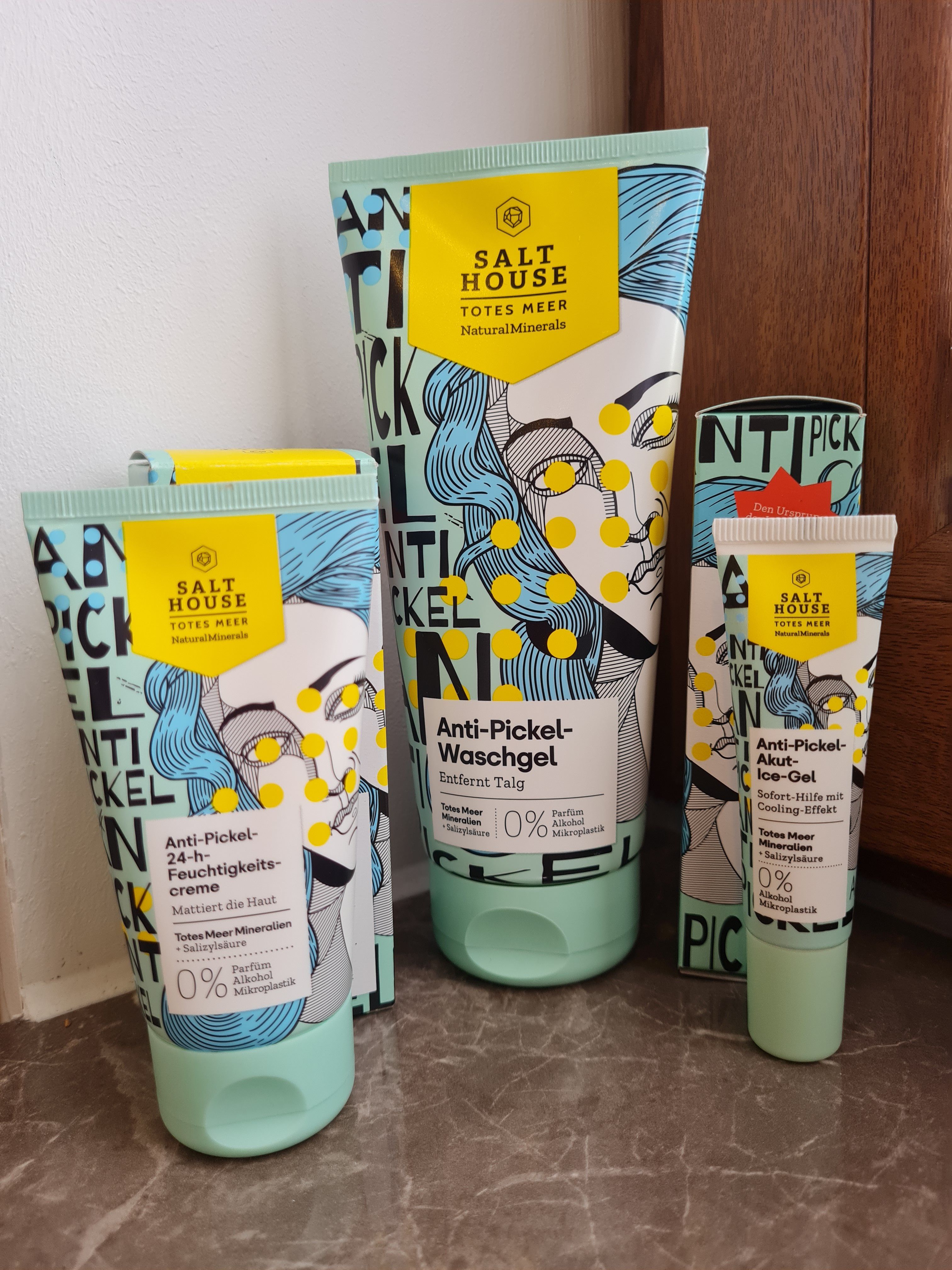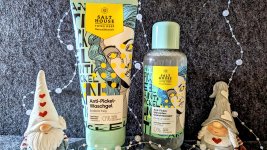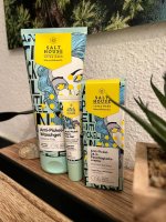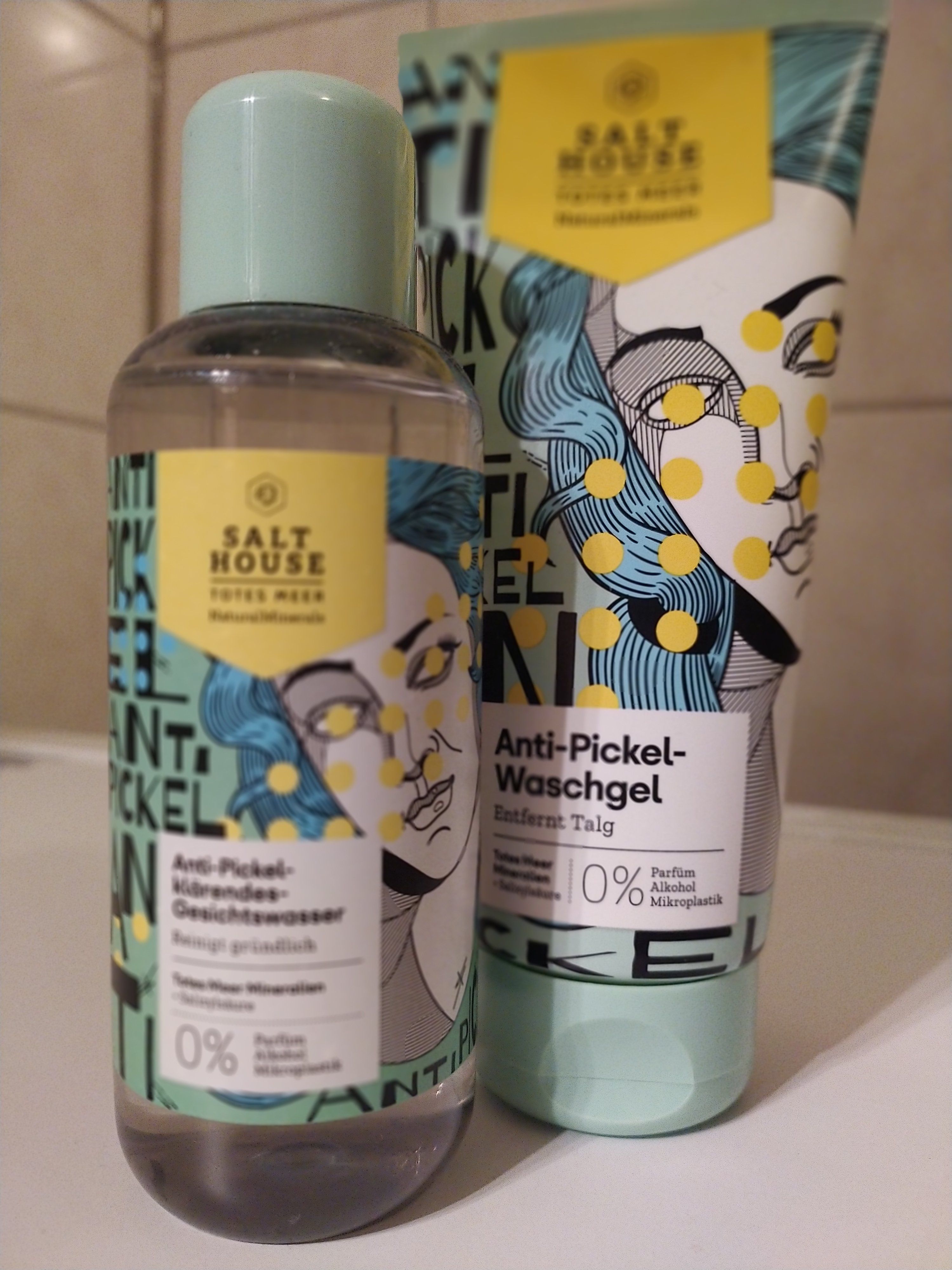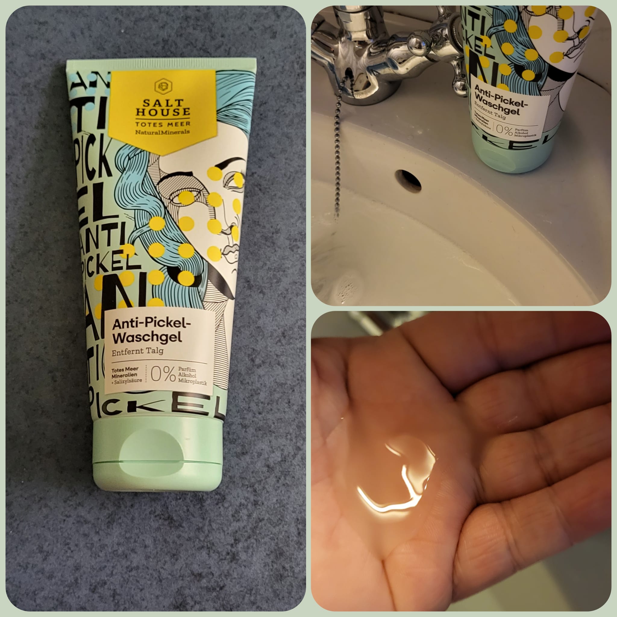 Ich bin begeistert von der salthouse pflegeroutine. Das Waschgel ist in einer tollen große verpackt und verhindert ganz gut das neu entstehen von weiteren Pickeln. Es reinigt die Haut fast gut, allerdings ist es nicht unbedingt für Mitesser geeignet. Die Creme ist leider nicht so toll. Sie ist leider in Phasen geteilt und riecht sehr abgestanden. Da weiß uch leider nicht was los ist. Die antipickel schnelle Hilfe kleine Tube ist super. Sie hält neue Pickel in Schach und trocknet sie gut weg. Toll