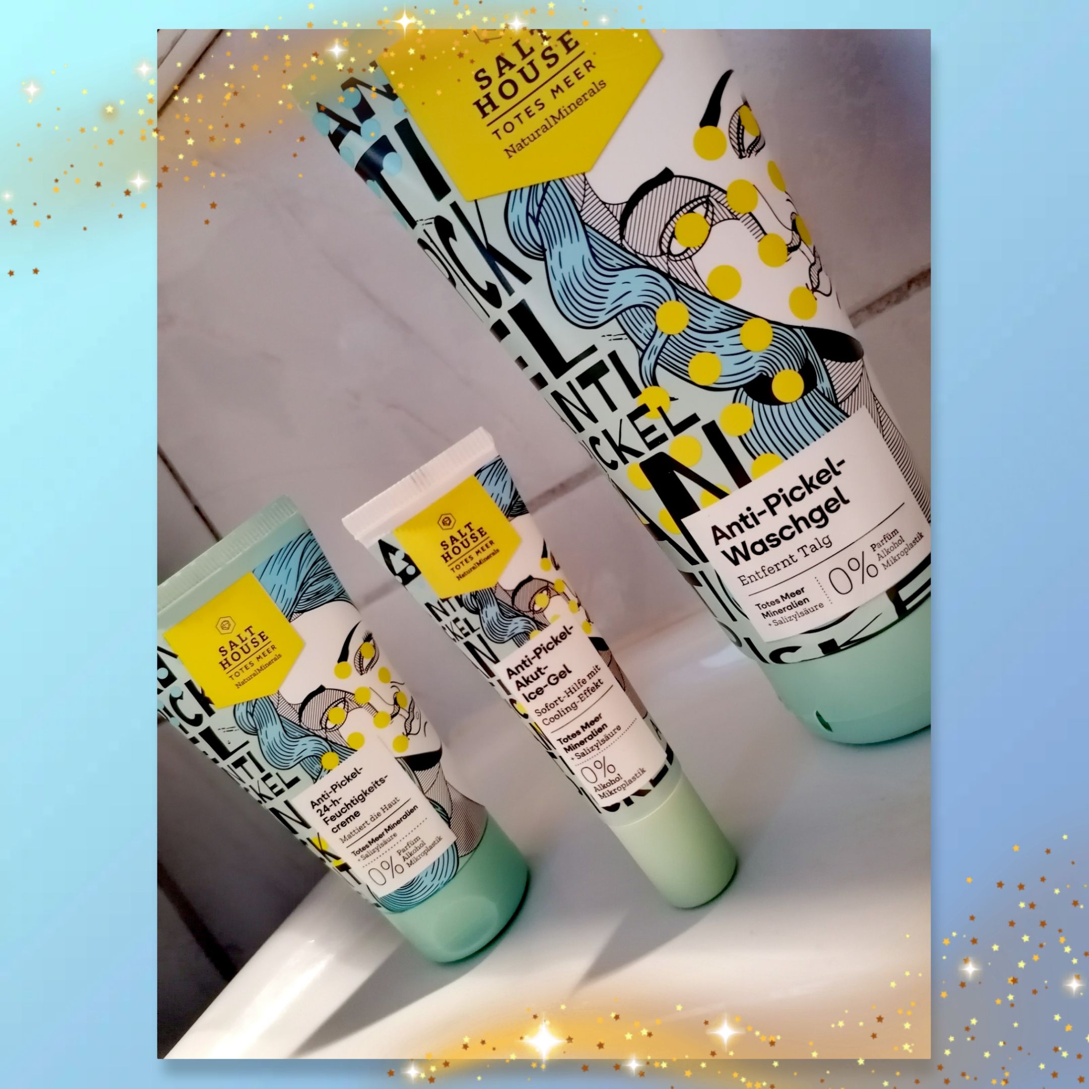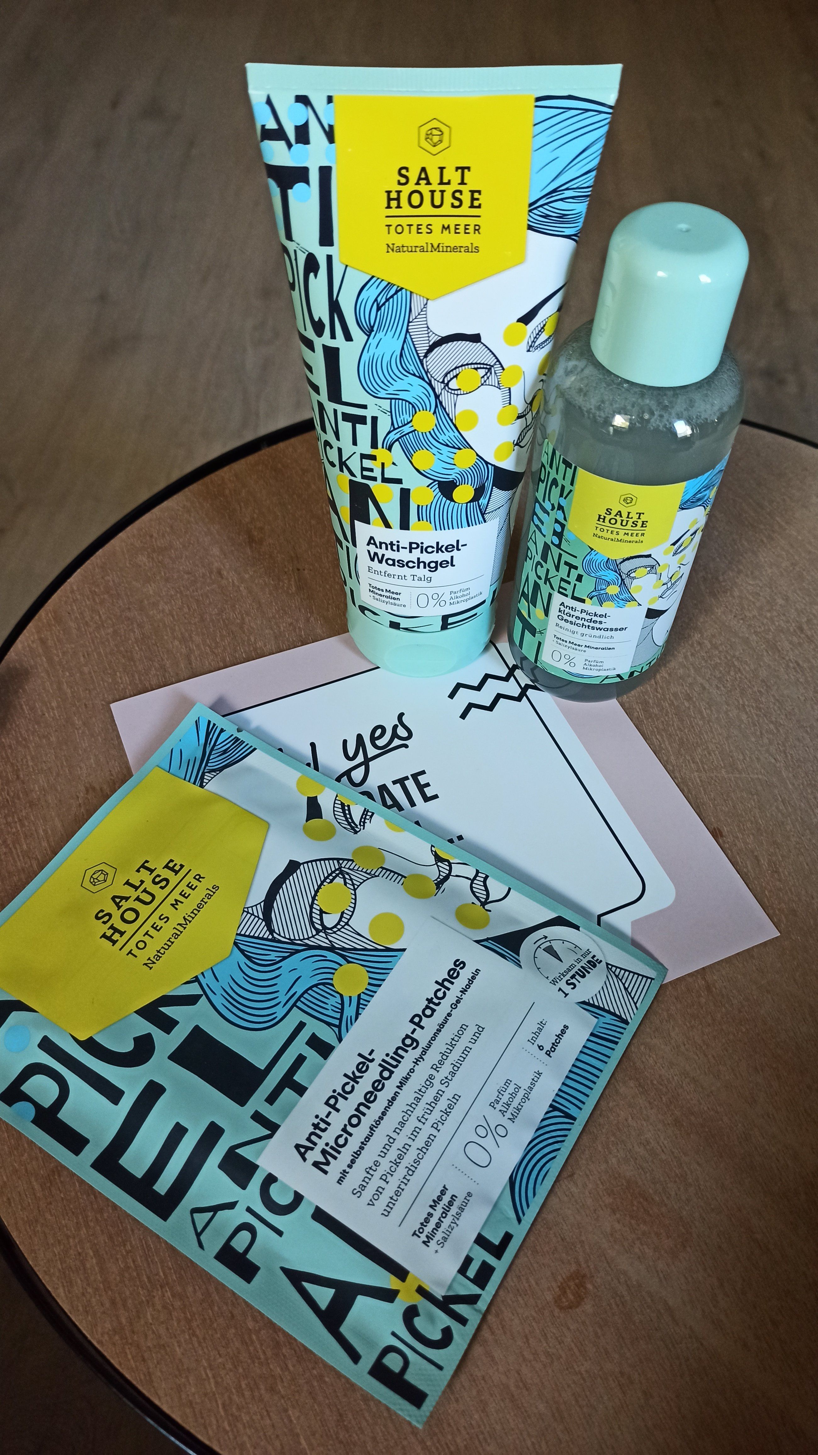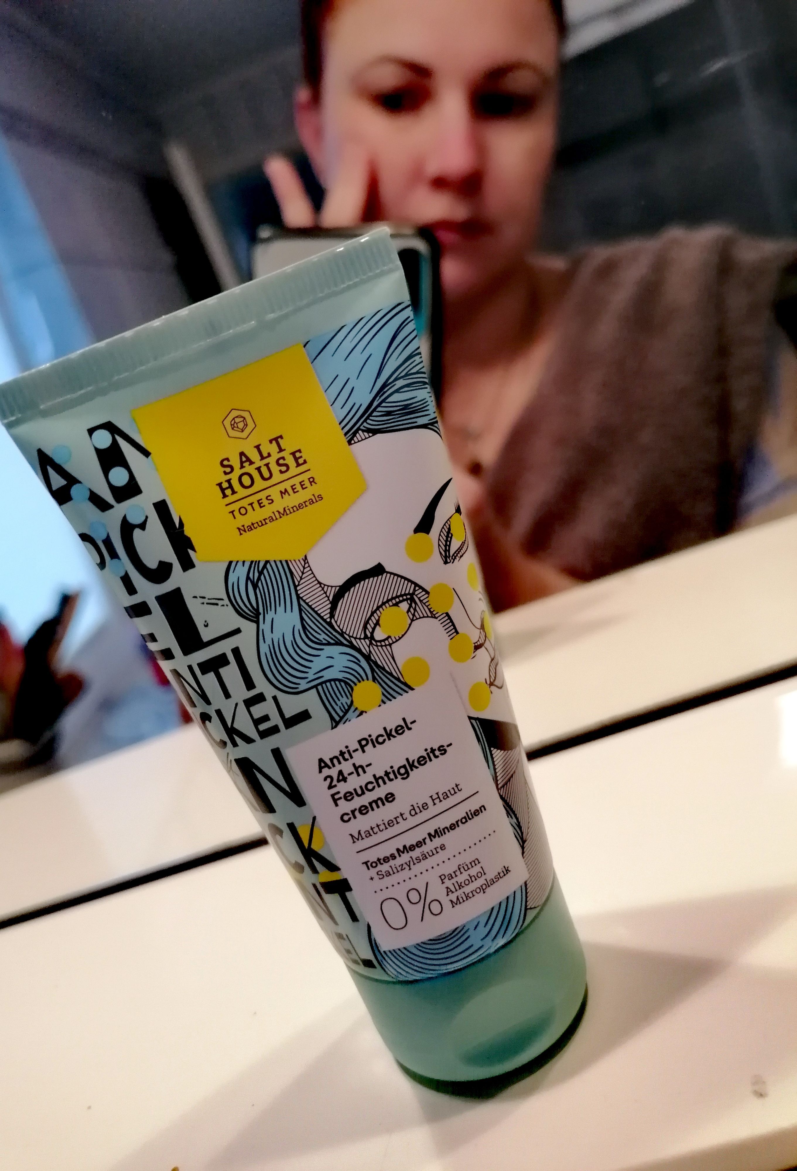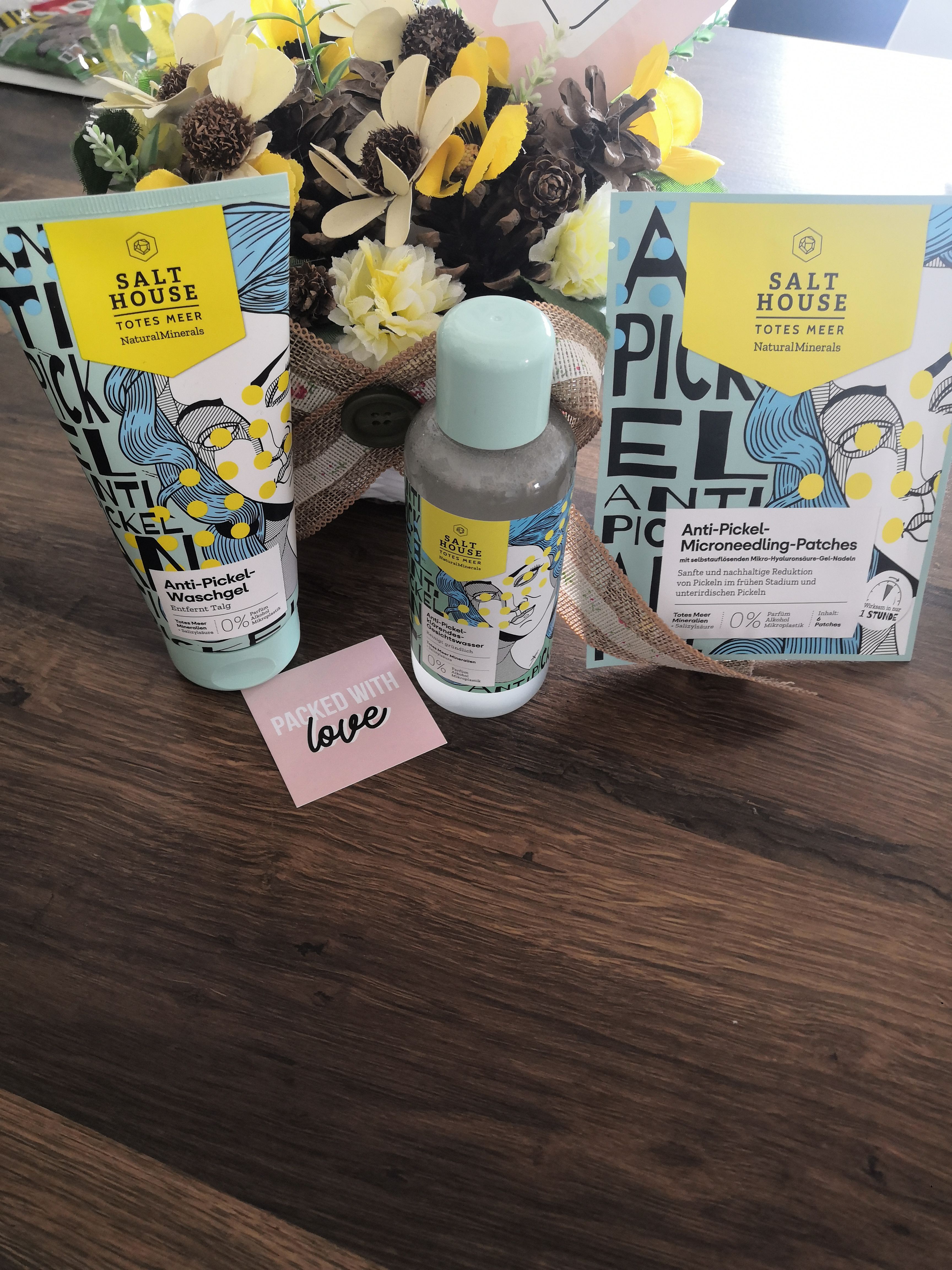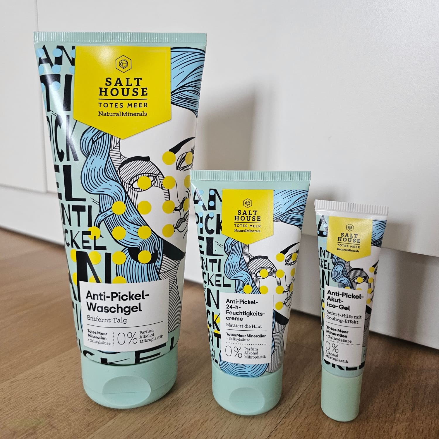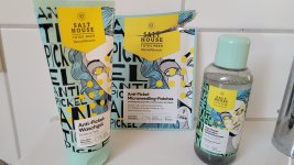 Ich bin begeistert von der salthouse pflegeroutine. Das Waschgel ist in einer tollen große verpackt und verhindert ganz gut das neu entstehen von weiteren Pickeln. Es reinigt die Haut fast gut, allerdings ist es nicht unbedingt für Mitesser geeignet. Die Creme ist leider nicht so toll. Sie ist leider in Phasen geteilt und riecht sehr abgestanden. Da weiß uch leider nicht was los ist. Die antipickel schnelle Hilfe kleine Tube ist super. Sie hält neue Pickel in Schach und trocknet sie gut weg. Toll