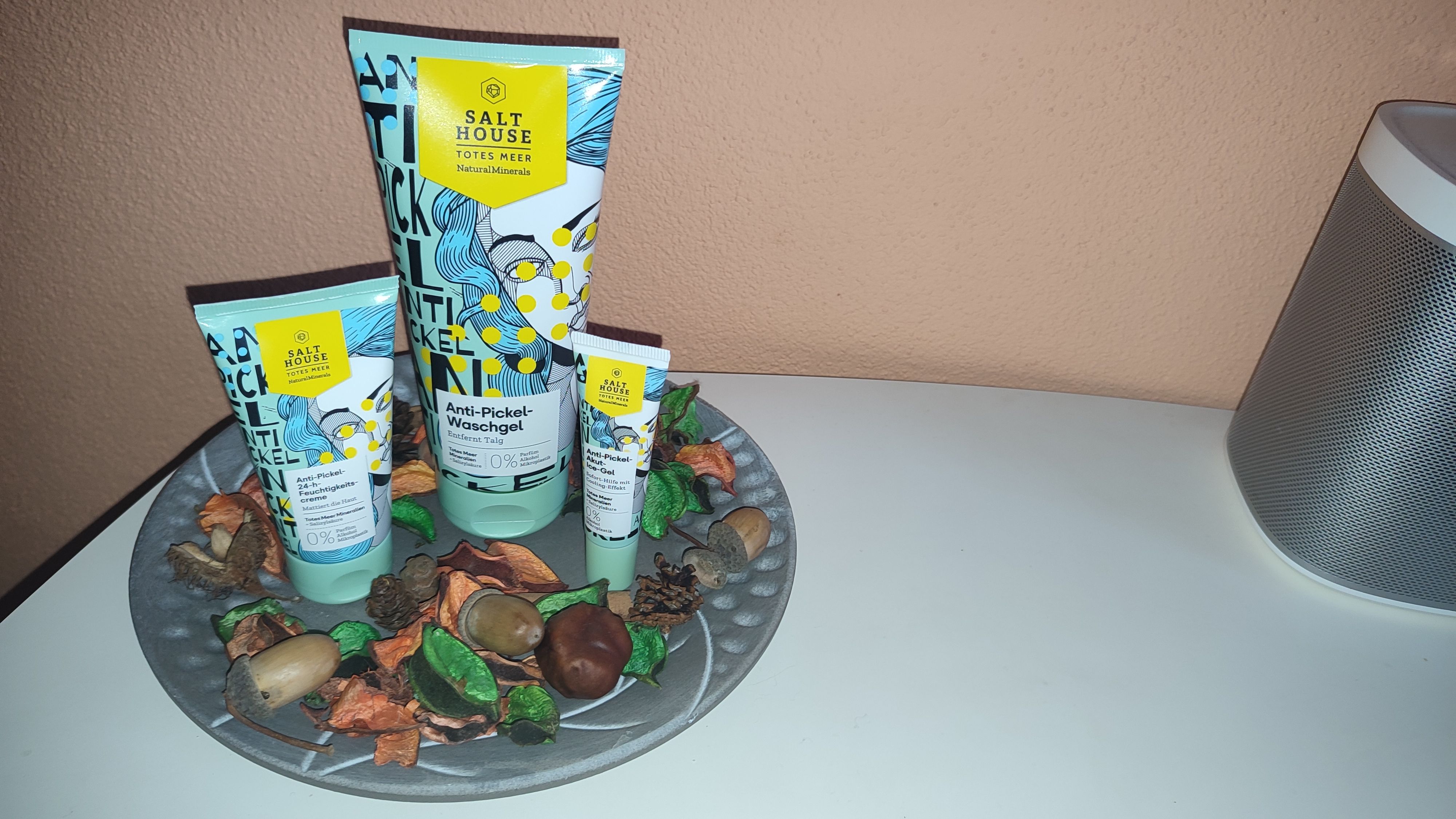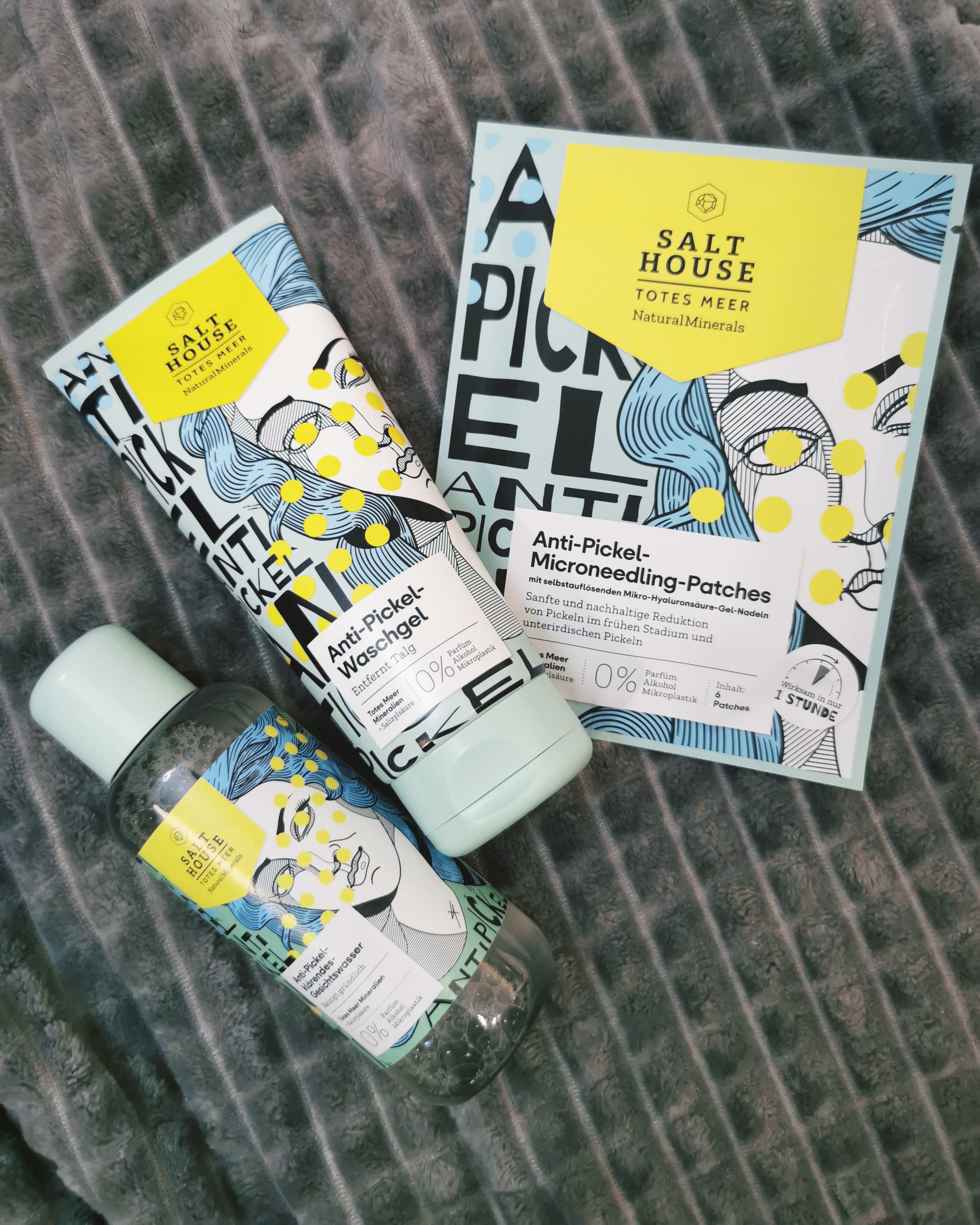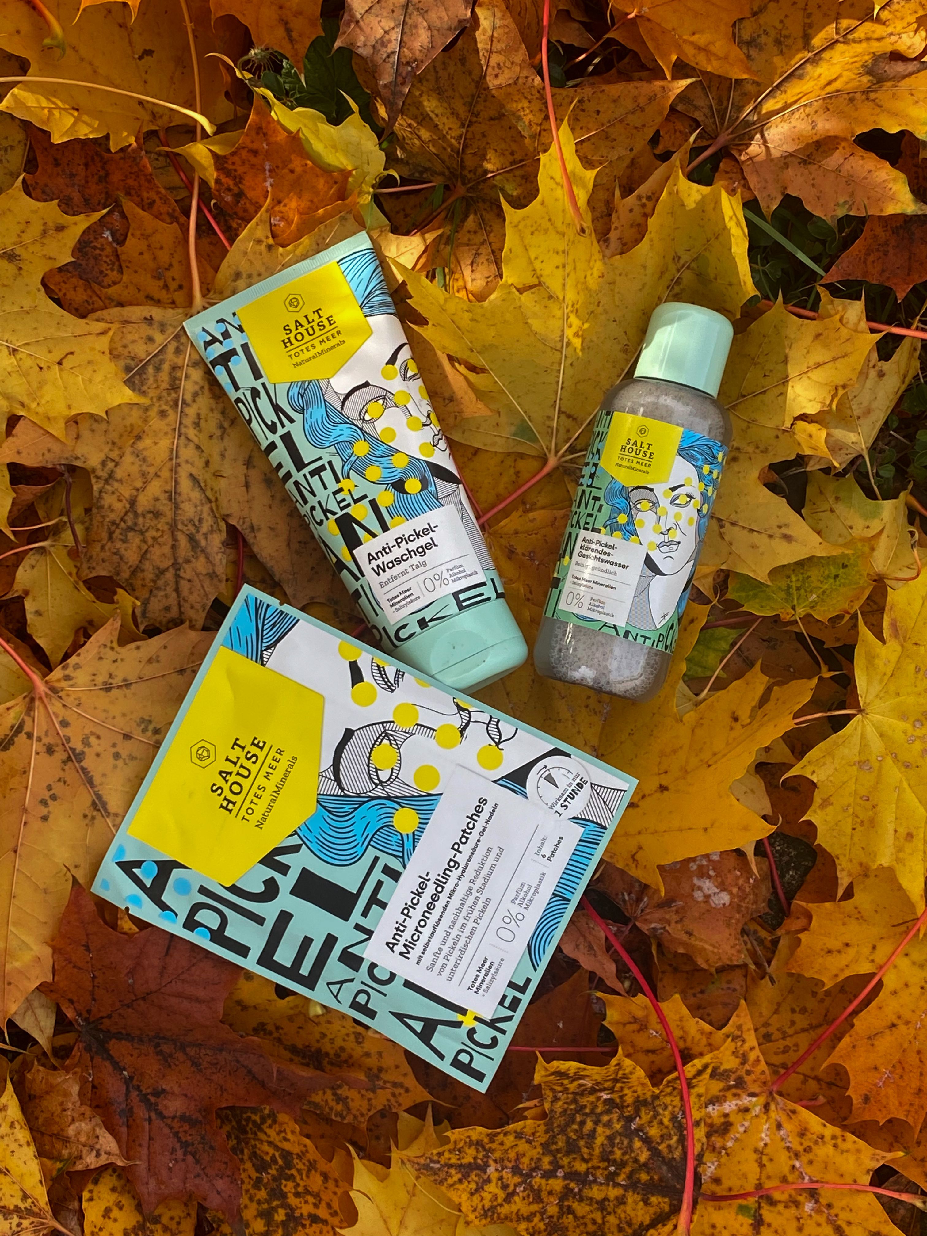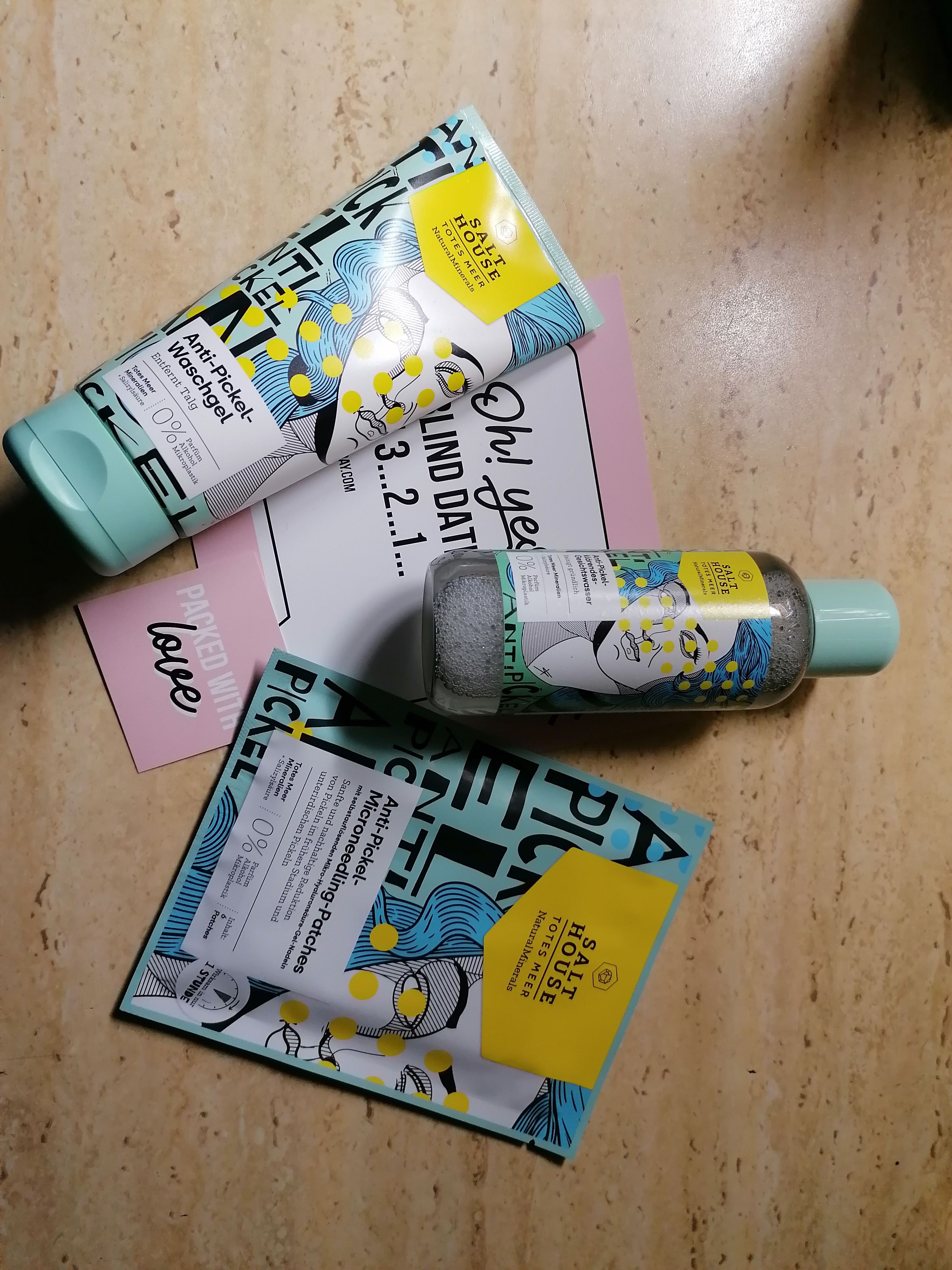 Ich bin begeistert von der salthouse pflegeroutine. Das Waschgel ist in einer tollen große verpackt und verhindert ganz gut das neu entstehen von weiteren Pickeln. Es reinigt die Haut fast gut, allerdings ist es nicht unbedingt für Mitesser geeignet. Die Creme ist leider nicht so toll. Sie ist leider in Phasen geteilt und riecht sehr abgestanden. Da weiß uch leider nicht was los ist. Die antipickel schnelle Hilfe kleine Tube ist super. Sie hält neue Pickel in Schach und trocknet sie gut weg. Toll