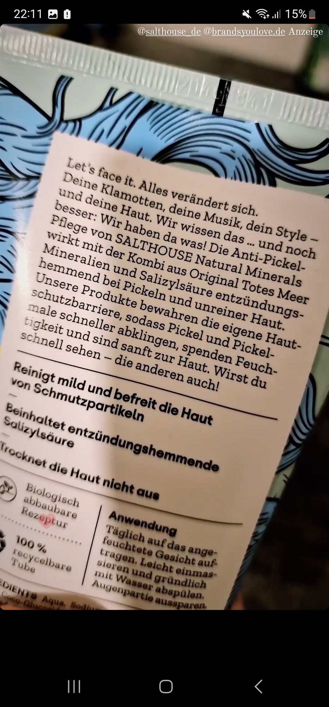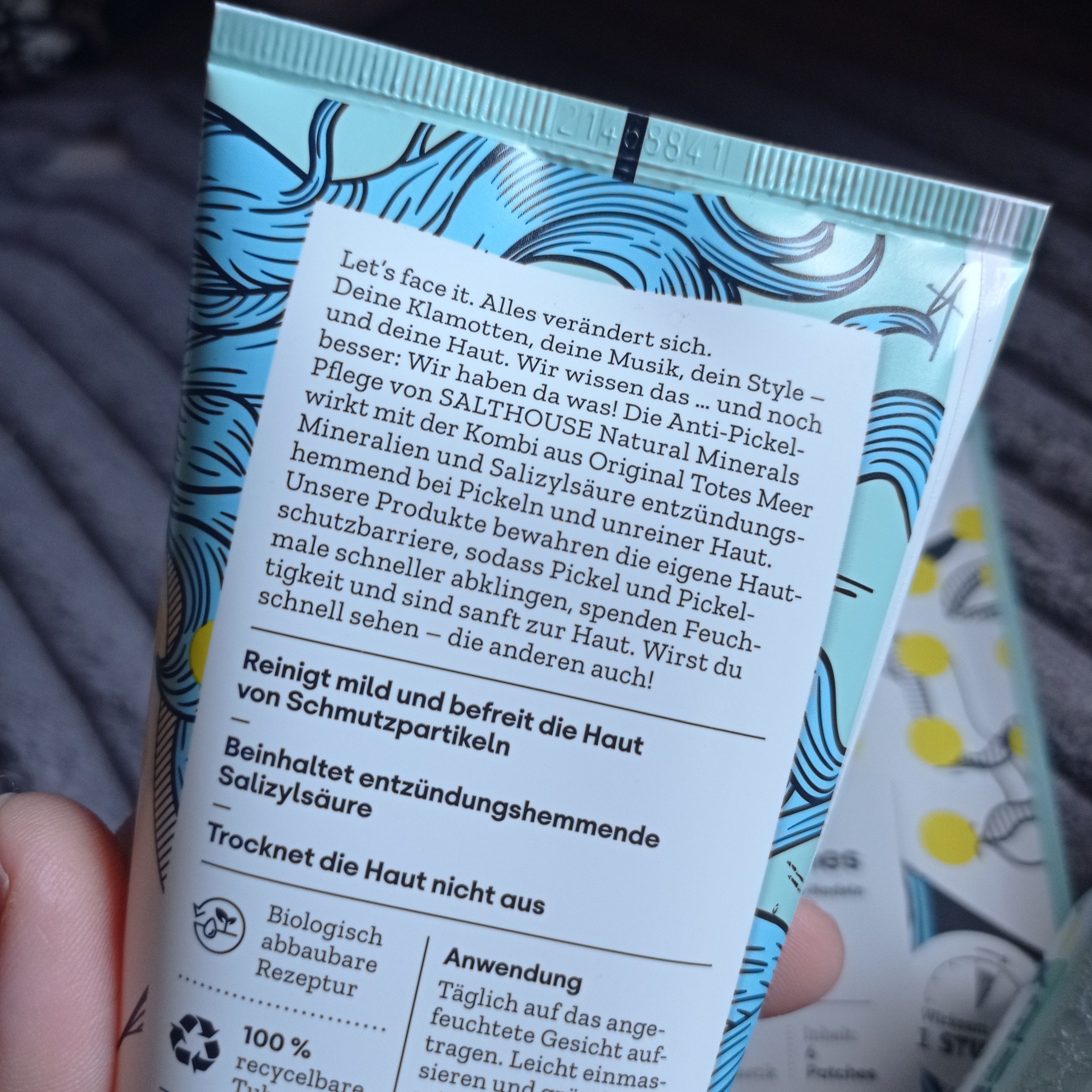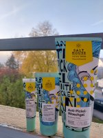 Mein Sohn testet das Produkt. Die Verpackung ist für Jugendliche sehr ansprechend. Das Waschgel von SALTHOUSE hat eine angenehme Konsistenz und lässt sich gut verteilen. Seine Haut verträgt es gut, Rötungen werden heller. Die Haut fühlt sich weich, frisch und geschmeidig an. Das Waschgel ist sparsam im Gebrauch. Das Gesichtswasser reinigt gut. Die Patches kamen noch nicht zum Einsatz da es noch keinen akuten Fall gab.