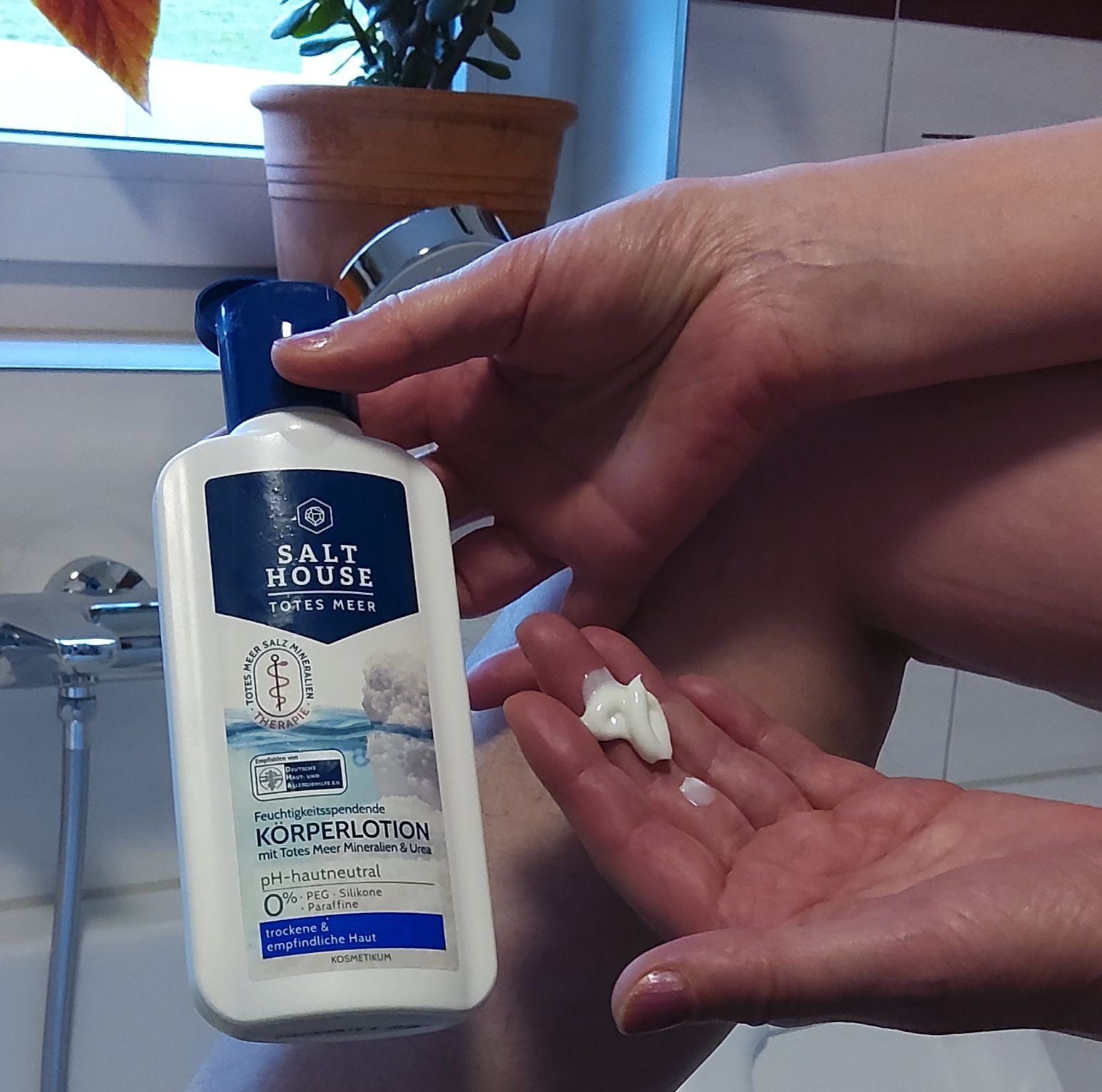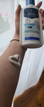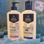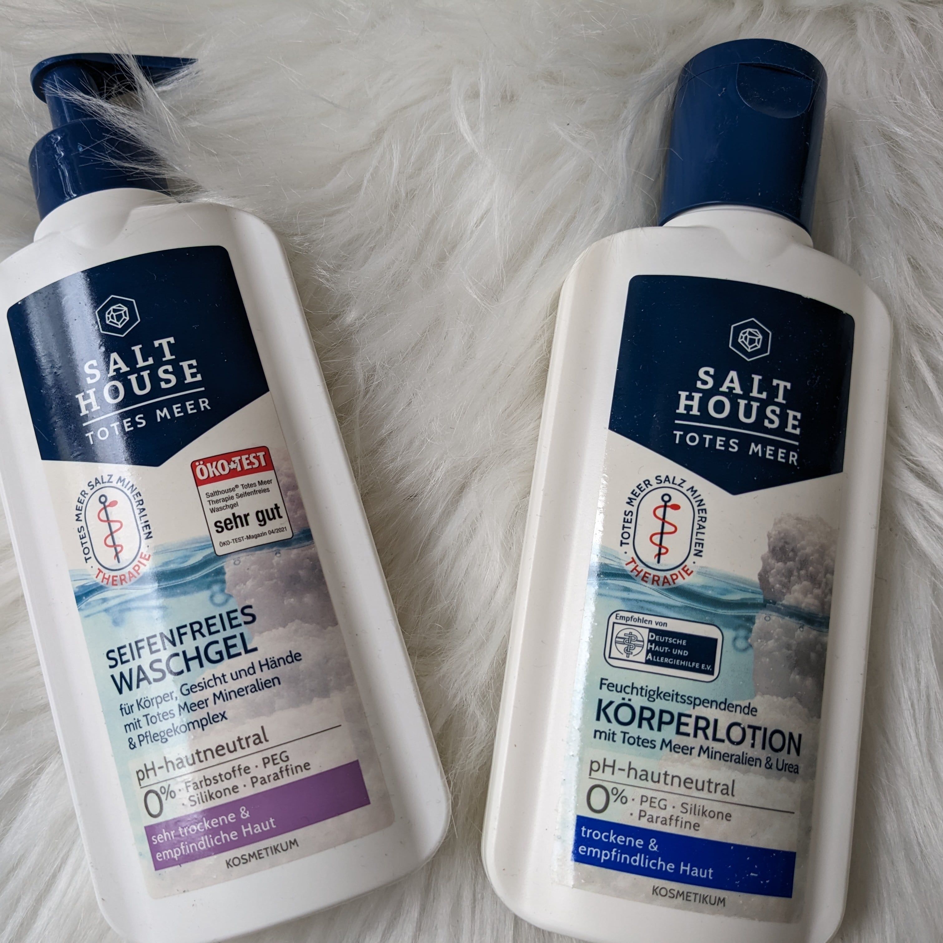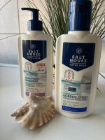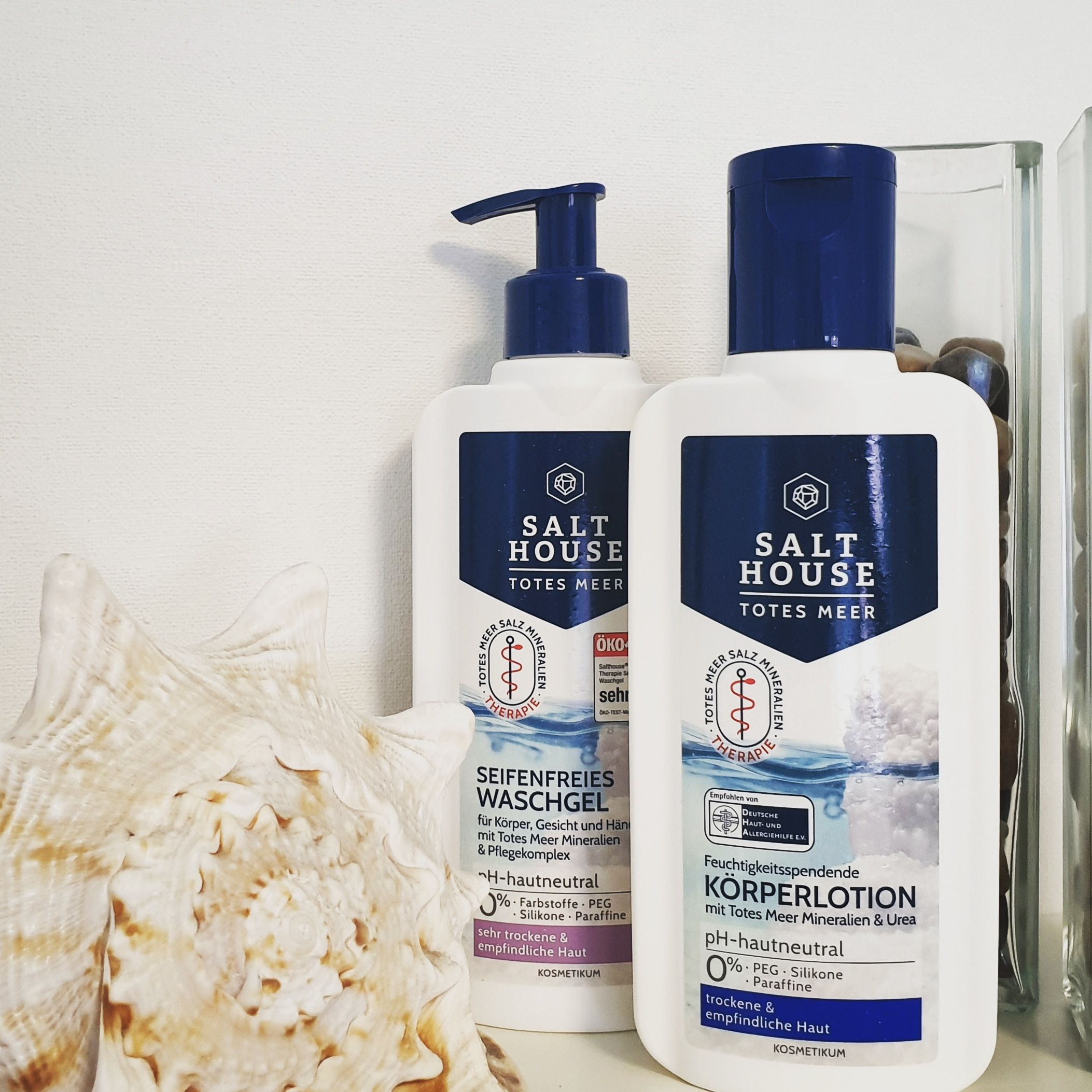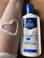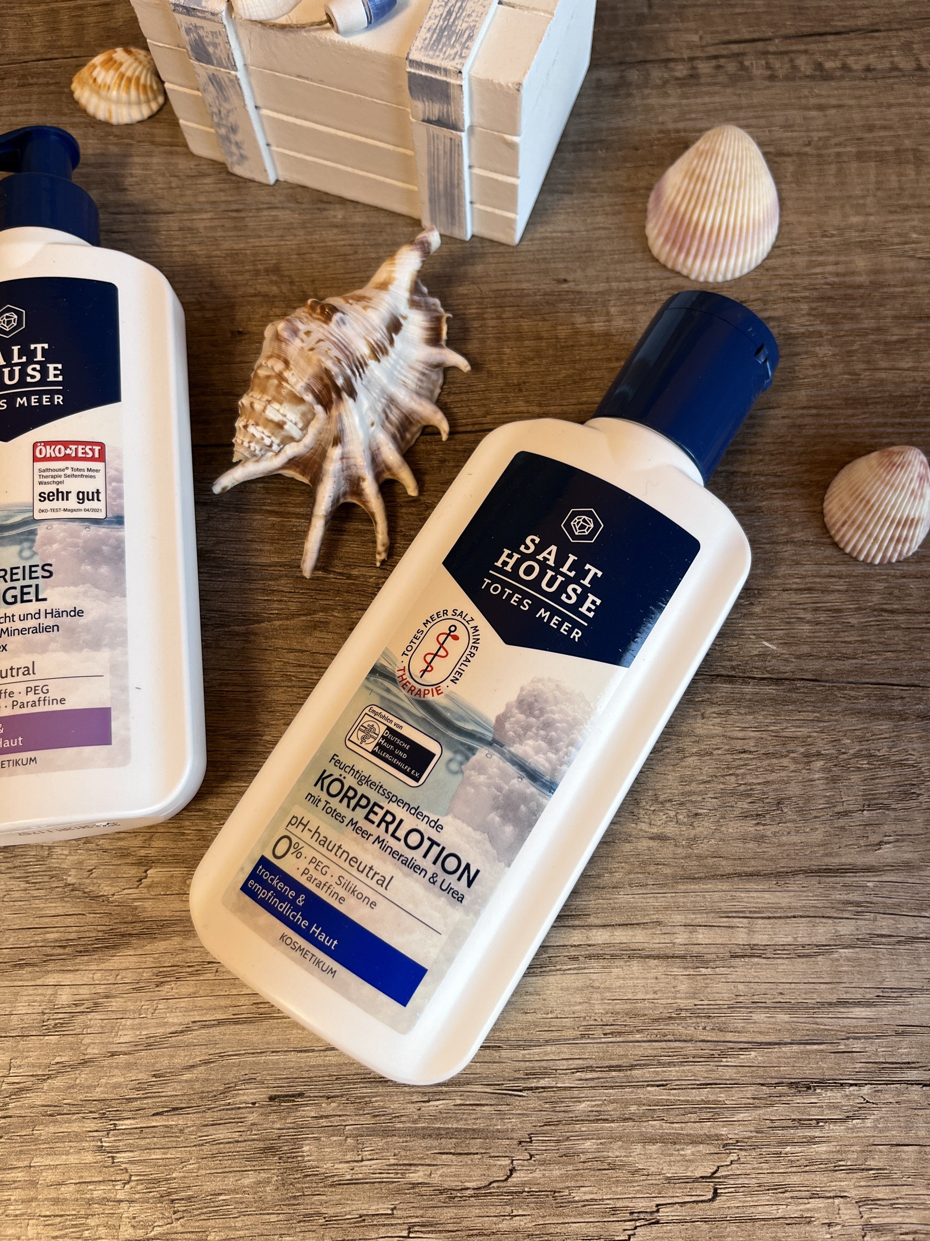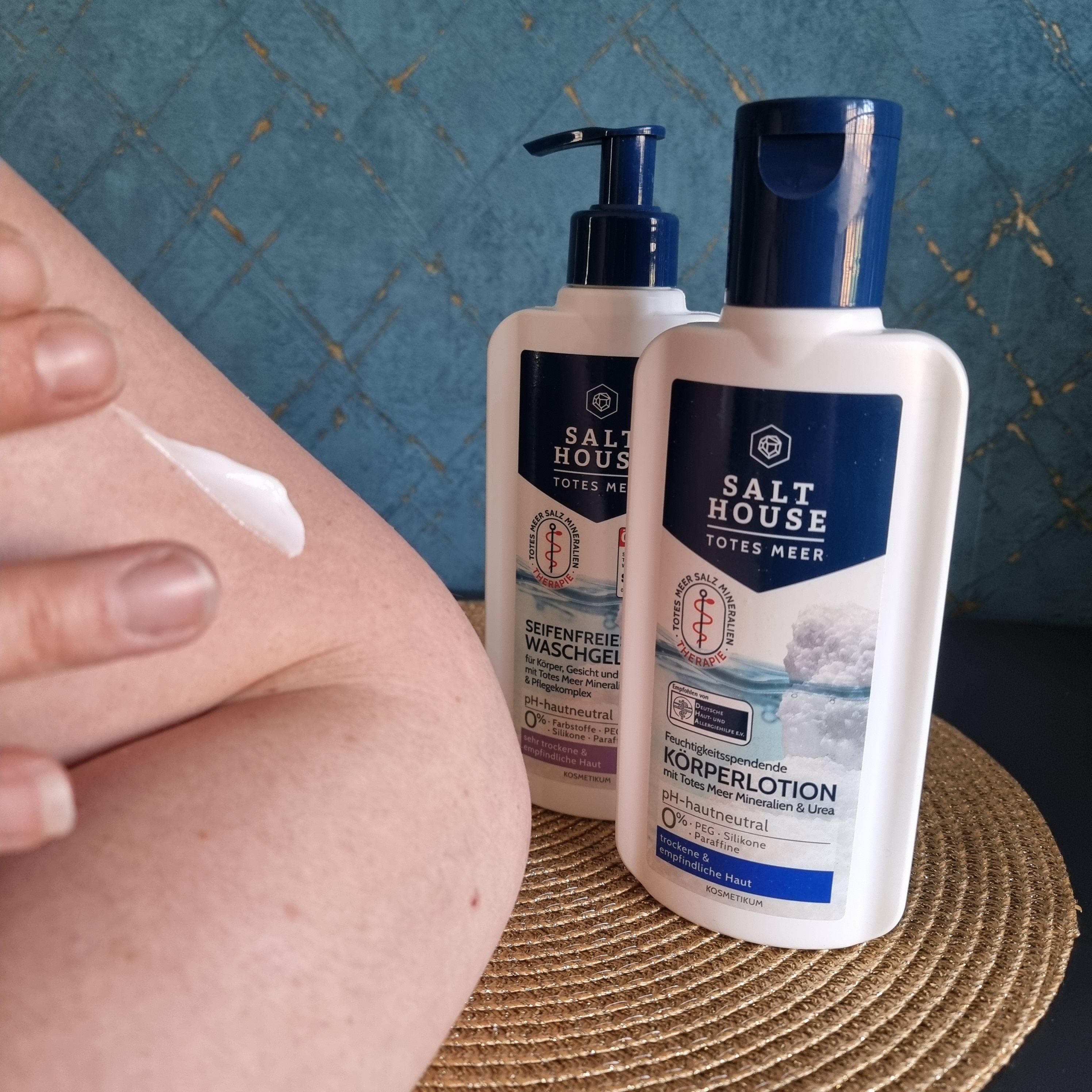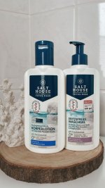 Meine positiven Eindruck habe ich sehr gerne auf Instagram geteilt: Die Salthouse Körperlotion ist sehr ansprechend verpackt in einer dezent gestalteten weißen Flasche mit blauem Deckel. Der Verschluss der Lotion bzw. der Pumpspender des Waschgels ist sehr praktisch und ermöglicht ein einfaches dosieren der Lotion und des Waschgels. Die Produkte selbst riechen angenehm dezent, frisch und natürlich. Beide Produkte pflegen reichhaltig und sind in der Konsistenz vergleichbar mit herkömmliche Feuchtigkeitslotionen und Waschgelen, wobei die Lotion sehr gut und schnell in die Haut einzieht und sich leicht auf der Haut verteilen lässt. Die Lotion und das Waschgel mit Mineralien aus dem Meer hinterlassen einen angenehm feuchtiggkeitsspendenen Film, ohne dabei zu fetten. Raue und sehr trockene Stellen die ich oft an den Ellenbogen und den Knien habe, konnte ich dank der Lotion innerhalb von drei Tagen "wegpflegen" wobei ich die Lotion morgens nach dem Duschen und Abends vor dem Schlafengehen verwendet hab. Meine gesamte Haut am Körper fühlt sich nach der Anwendung sehr elastisch, weich und wohlig-eingehüllt an. Ich kann die Salthouse Lotion mit Mineralien aus dem Meer allen weiterempfehlen, die eher zu trockener Haut neigen, die gegen trockene Winterhaut wirken möchten und die sich etwas Gutes tun wollen, ohne die Haut dabei unnötig zu belasten.