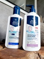 Sie hinterlässt ein angenehmes Hautgefühl. Zusammen mit dem Waschgel Seifenfrei eine tolle Pflegeergänzung für unsere Haut.