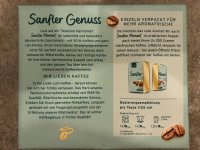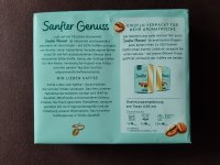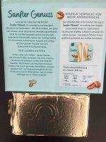 Als erstes hat mich die Verpackung angesprochen. Es sind sanfte Farben die perfekt zu dieser Kaffeesorte passen. Schon beim Auspacken ist mir ein sanfter Kaffeeduft in die Nase gestiegen. Besonders gut gefallen hat mir dass der Kaffee weniger Koffein enthält bei vollem Aroma. Er ist säurearm, mild im Geschmack und ich kann auch mit gutem Gewissen Abends noch ein Tässchen trinken.