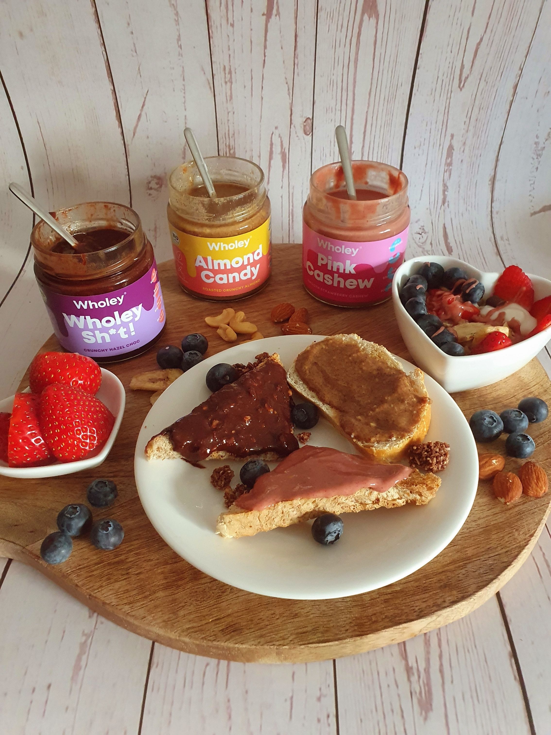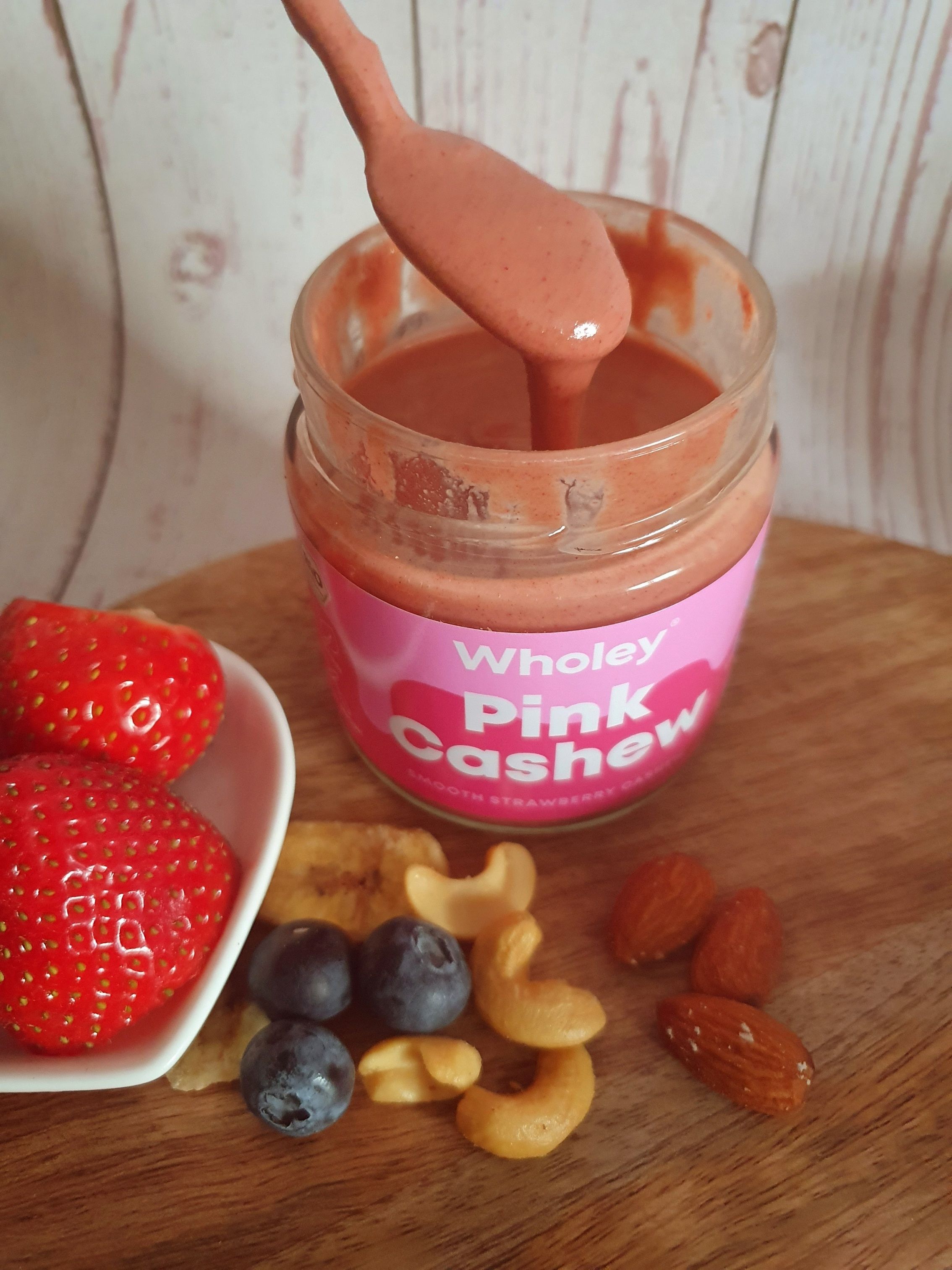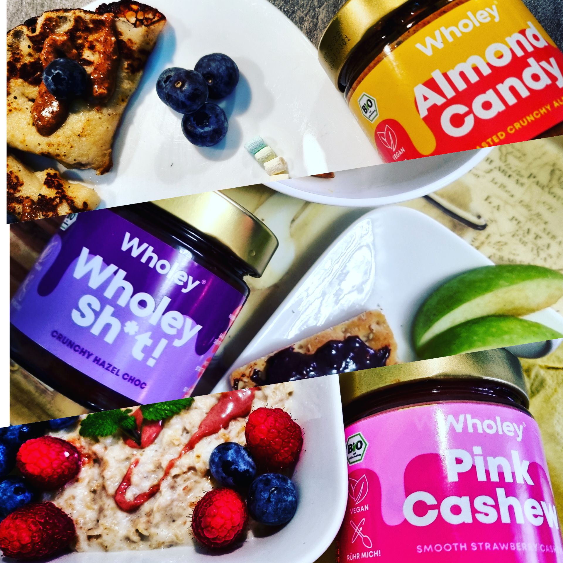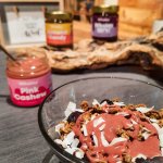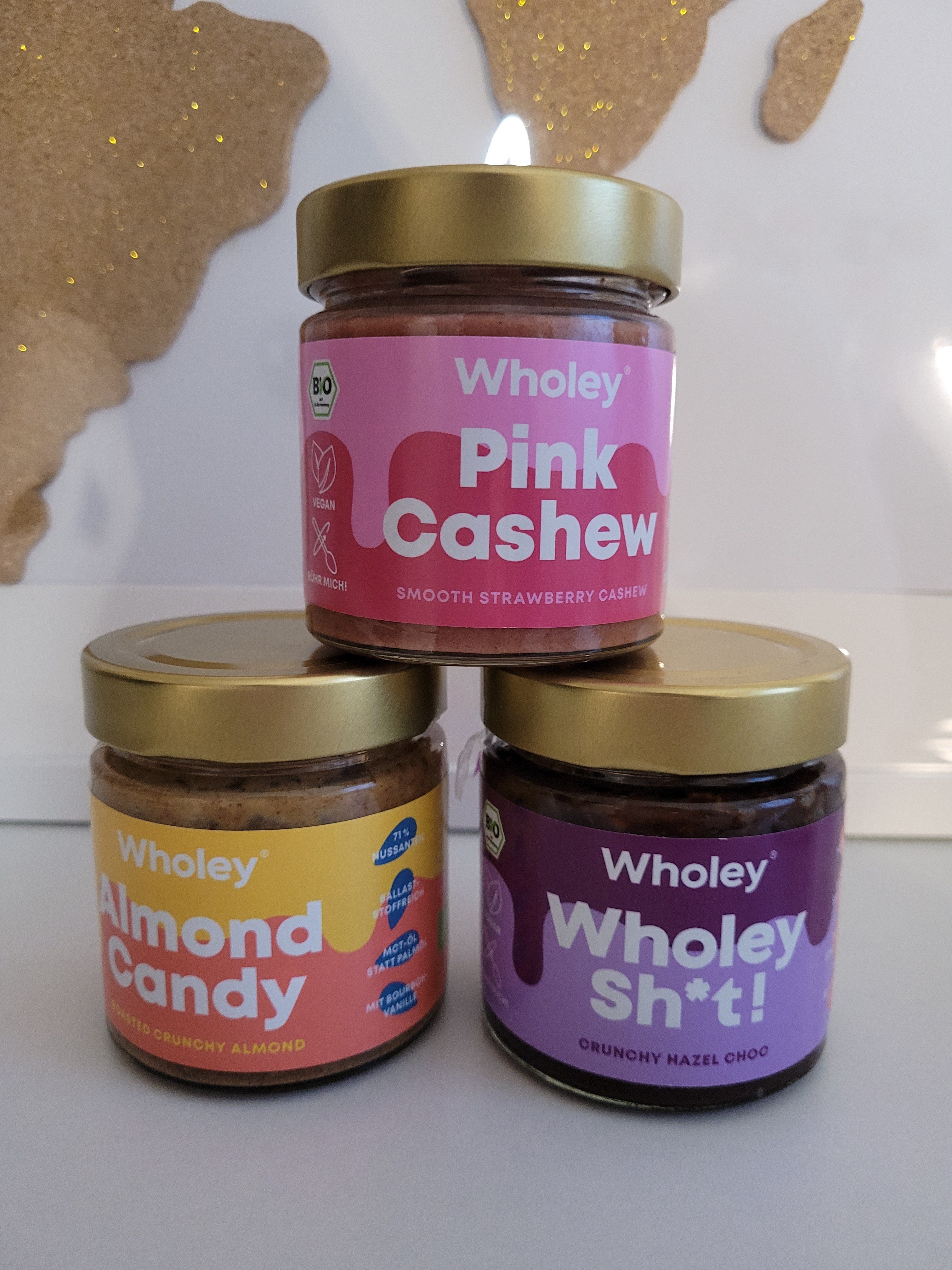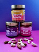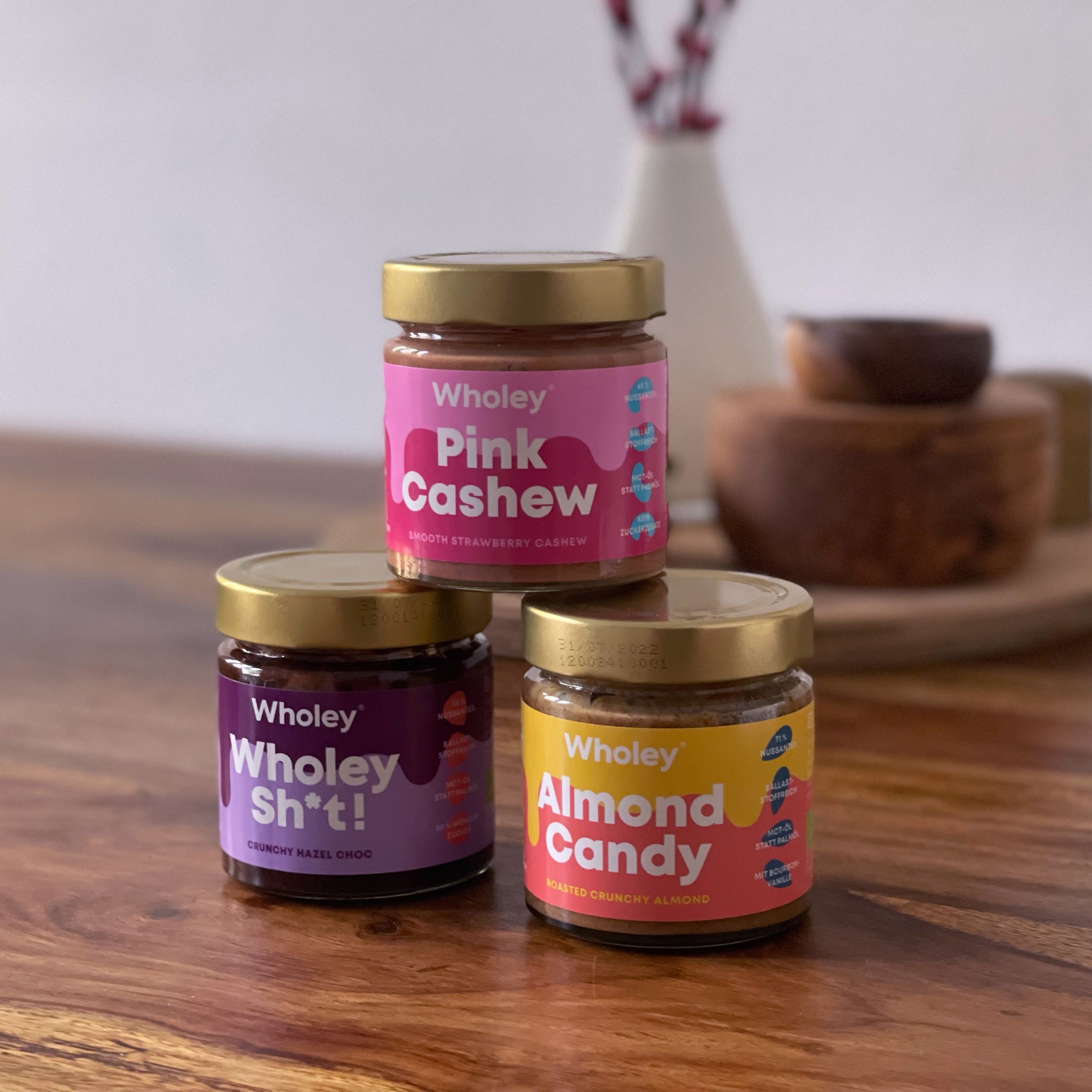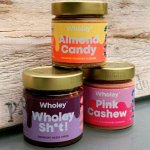 Almond Candy ist ein super cremiges Mandelmus mit feinen Mandelstücken. Es hat ein tolles Mandelaroma und ist universell einsetzbar. Pink Cashew schmeckt wie eine Mischung aus Erdbeermarmelade und Nuss. Sehr raffiniert um z.B. leckere Süßspeisen zu kreieren oder das Müsli zu verfeinern. Wholey Sh*t ist das Pendent zu Nuss Nougat Creme nur in viel weniger süß und viel bissiger. Perfekt z.B. für Pfannkuchen oder einfach auf dem Brot