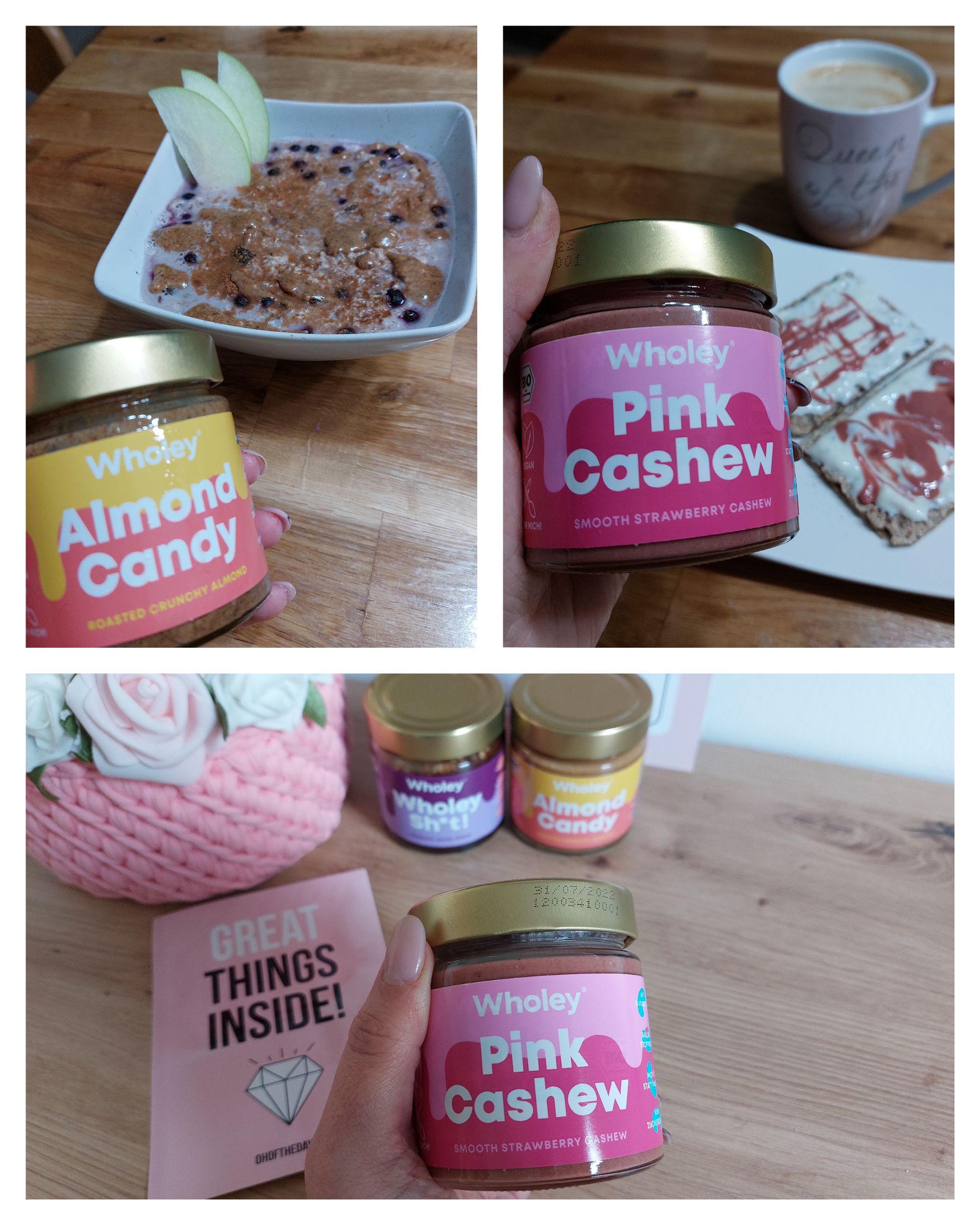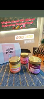 Beim ersten Mal hat es mir nicht so gut geschmeckt. Ich hatte den Fehler gemacht, das Mus vorher in den Kühlschrank zu stellen und vor dem Verzehr nicht umzurühren. Nachdem ich diese Tipps aber bei einer weiteren Testerin gelesen habe, müsste es natürlich gleich nochmal probiert werden. Was soll ich sagen, ich liebe sie. Egal, ob im Joghurt, zum Müsli, aufs Brot... Jeden Tag gibt es die leckeren Sorten von Wholey in einer anderen Variante. Ich bin so begeistert.