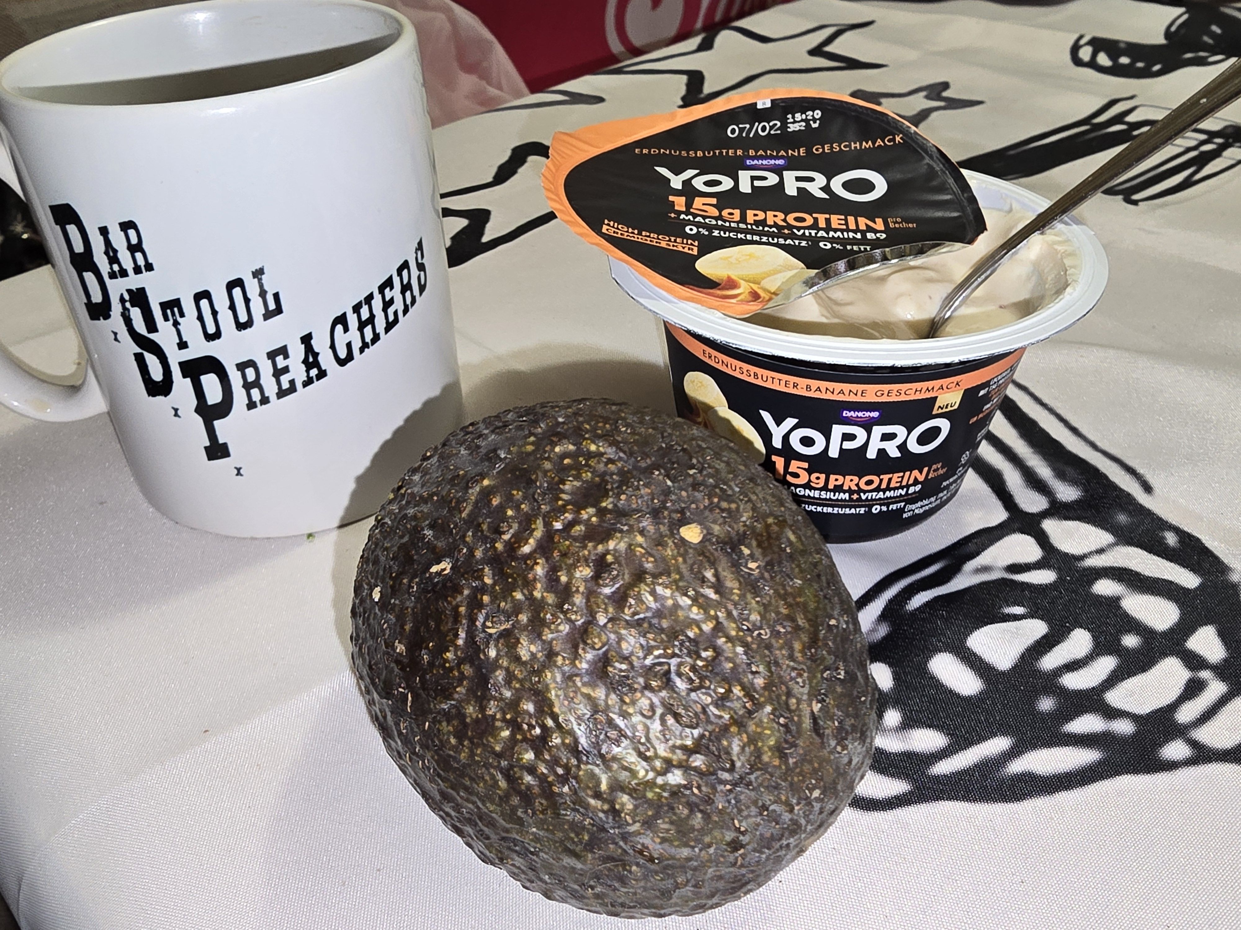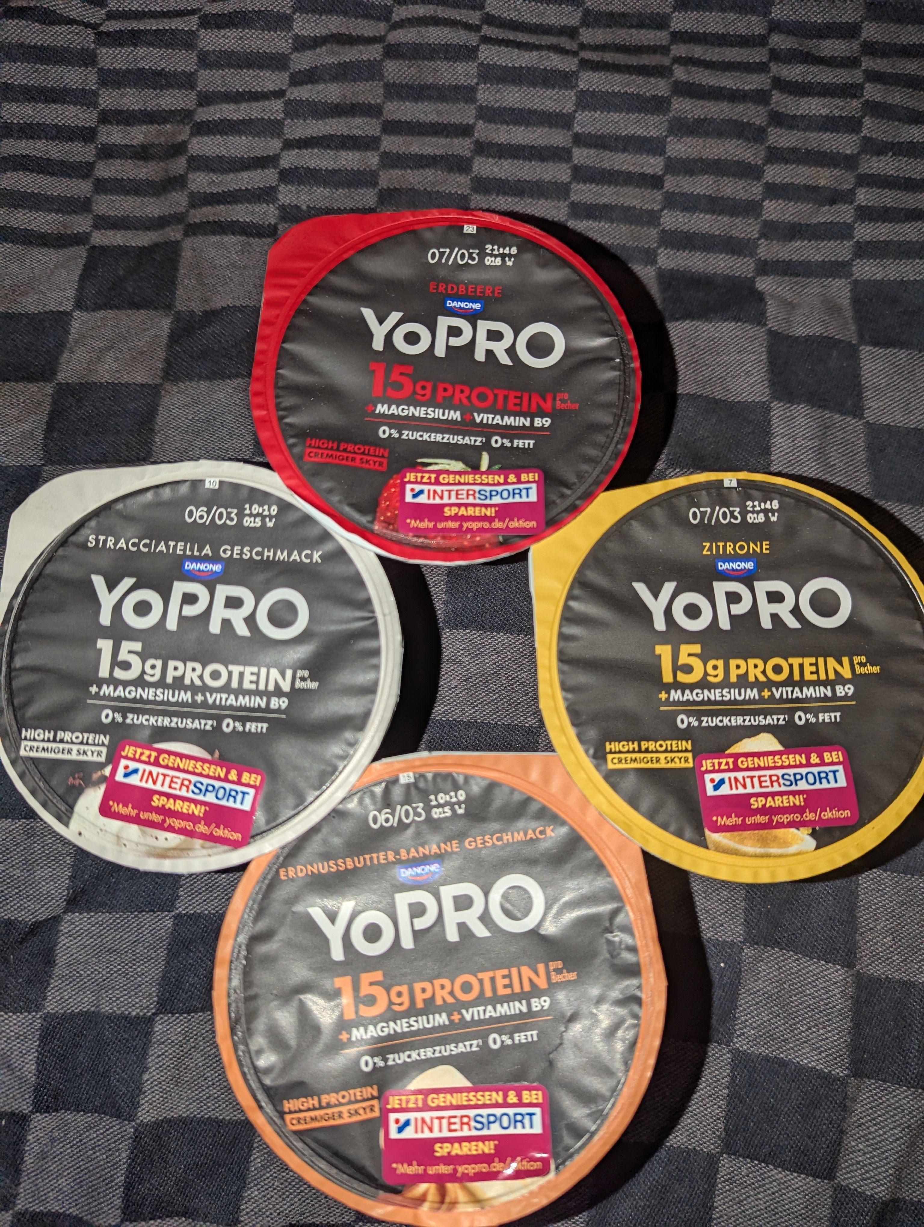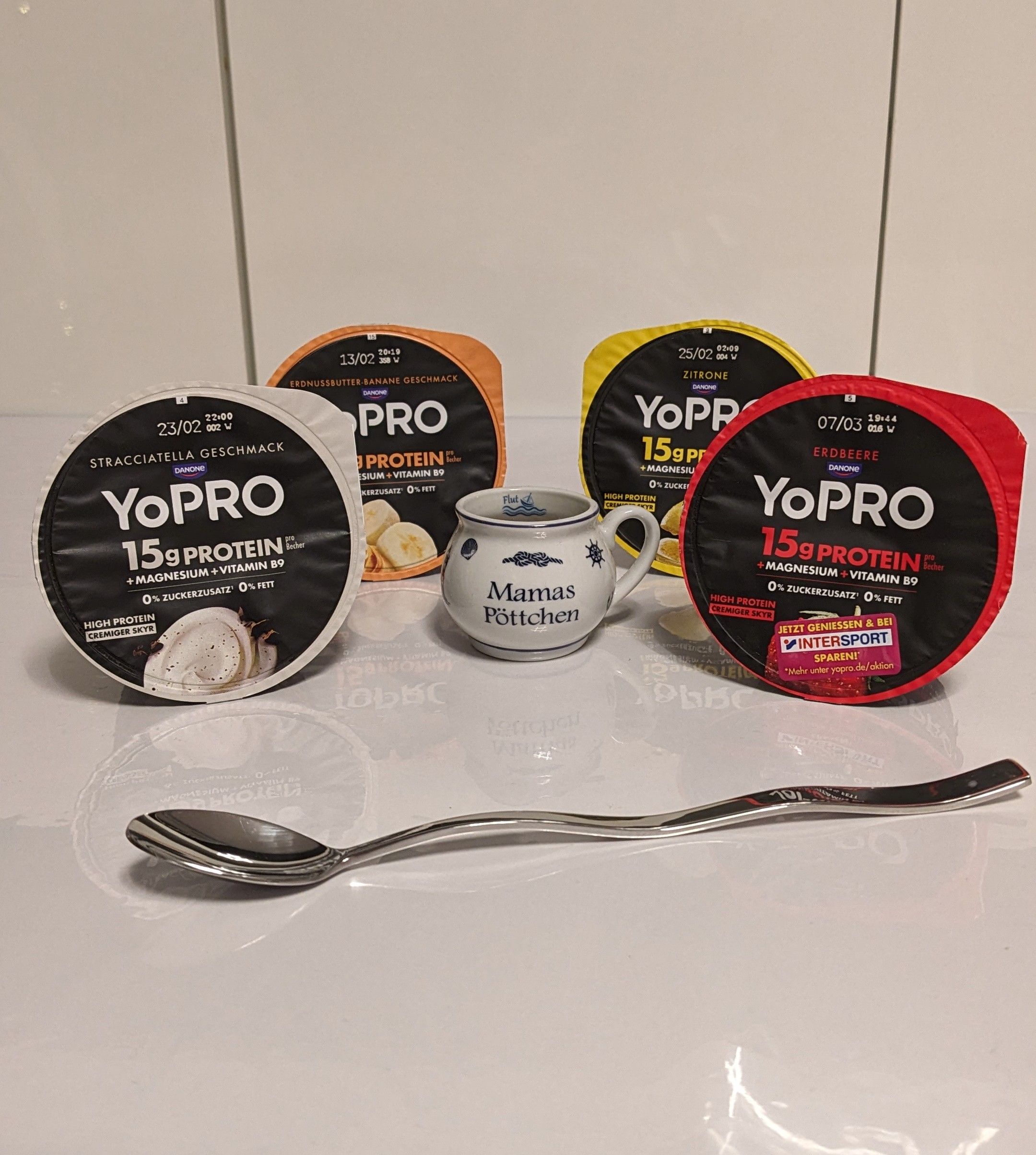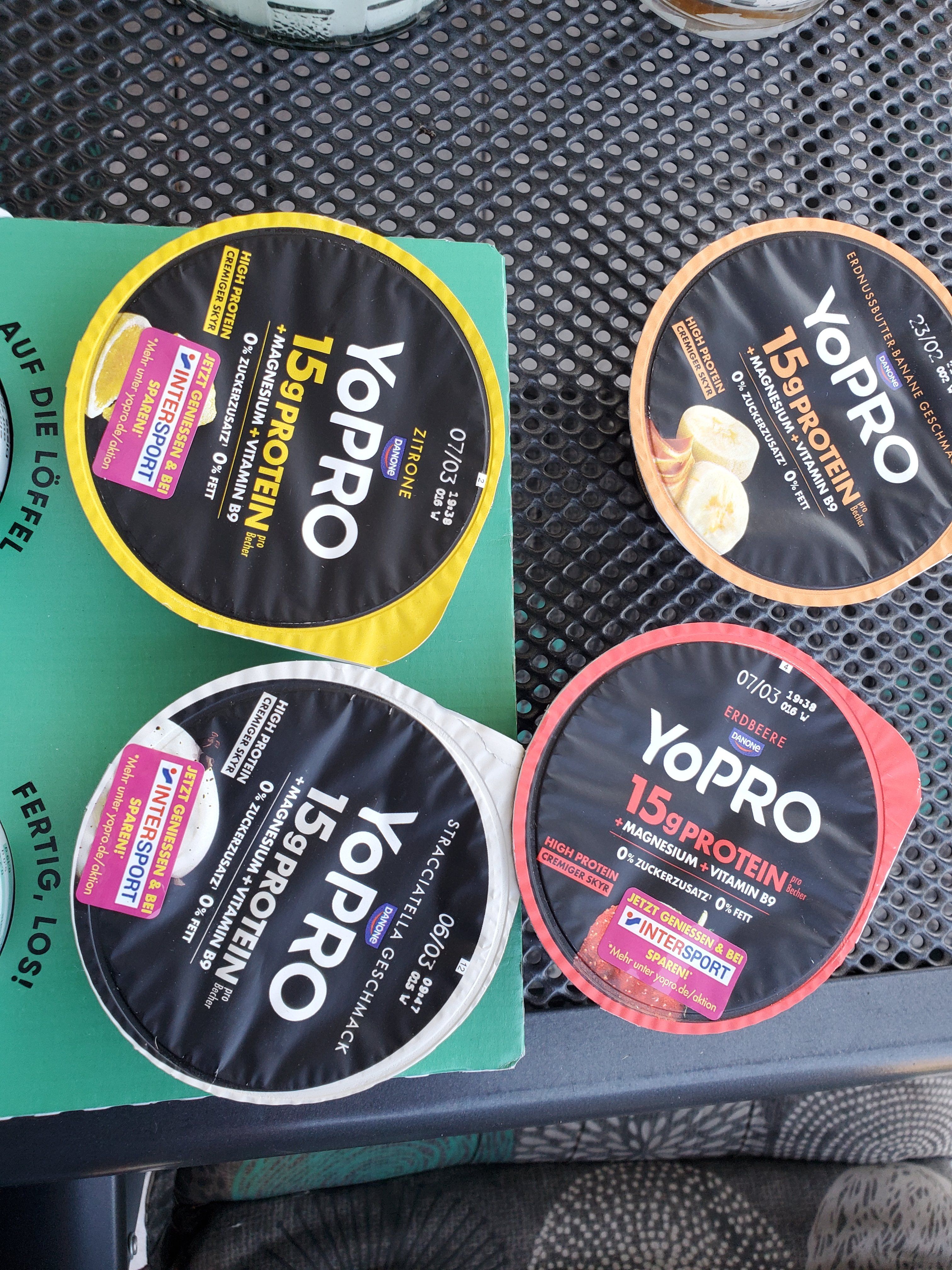 YoPro hier auf dem Dorf zu bekommen, war ganz schön schwierig - zumal es hier nur einen einzigen Markt gibt wo es verkauft wird. Zwei mal hatte ich Pech, beim dritten Versuch war von allen vier Sorten zumindest noch 1 Becher im Regal und ich konnte zuschlagen.